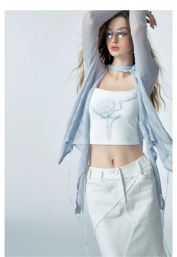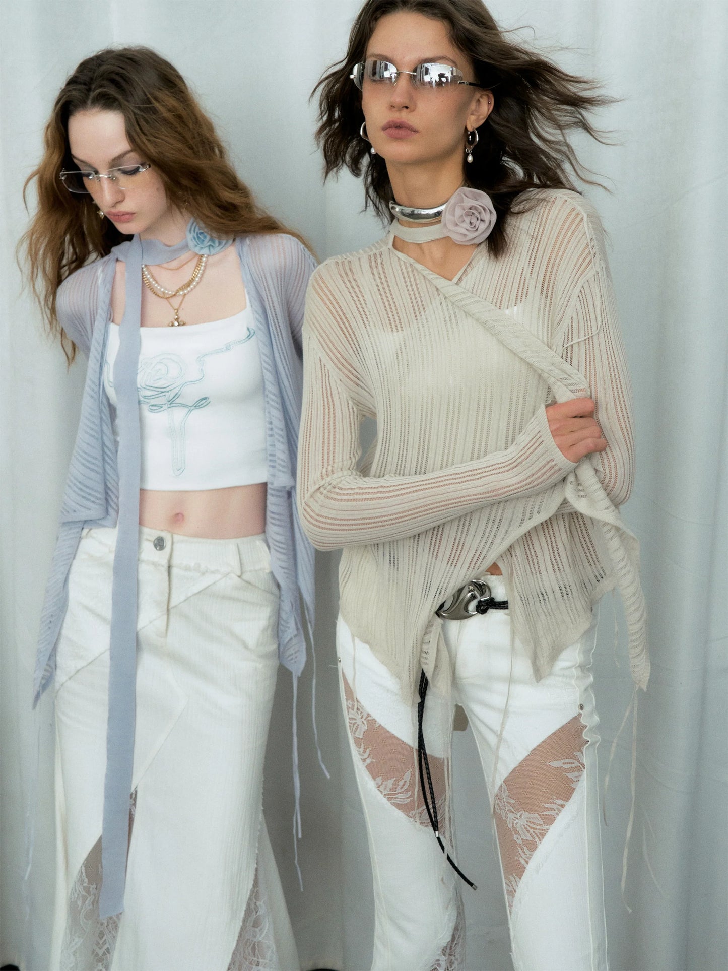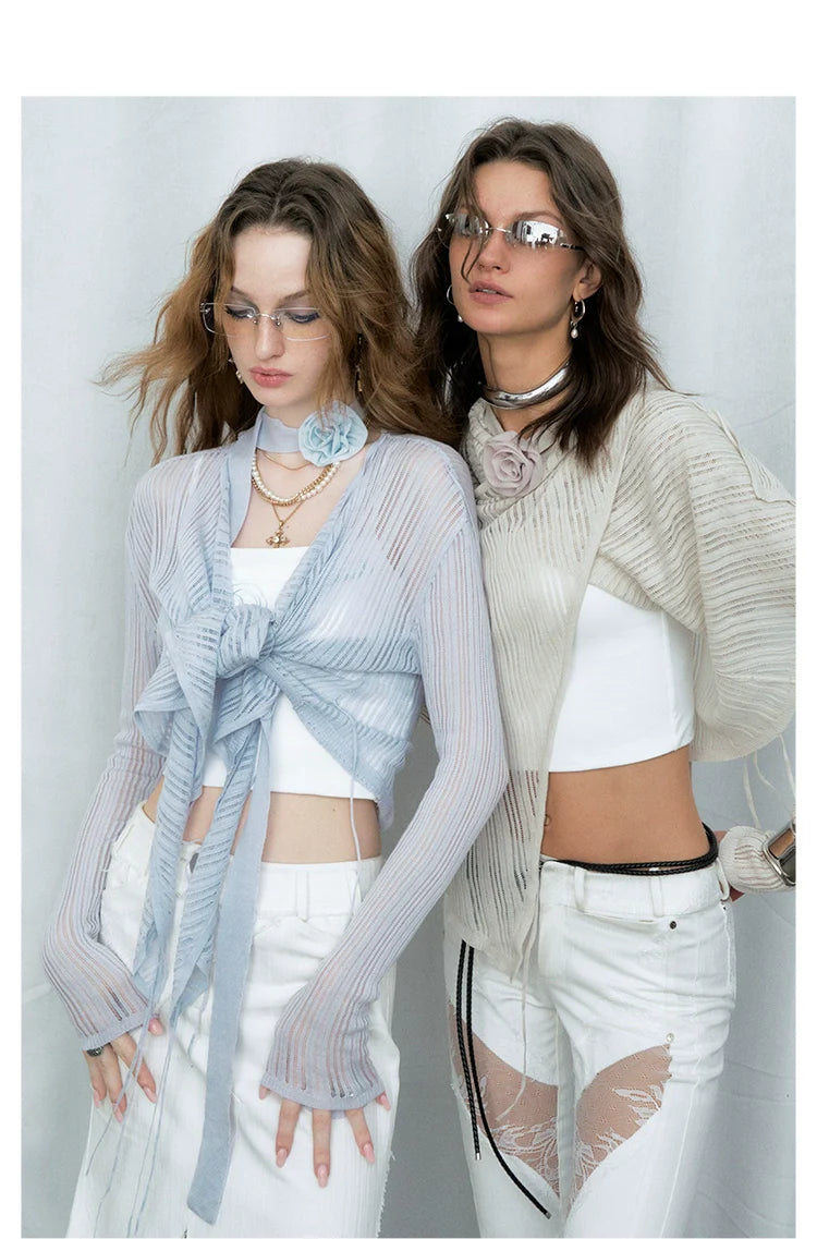 This cardigan features a V-neck slim-fit design with an enhanced front placket that creates a charming ruffle effect. The thoughtful design adds a feminine touch to the classic cardigan silhouette.