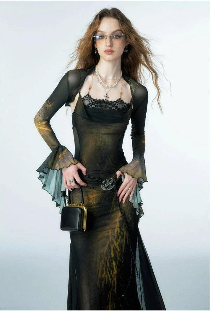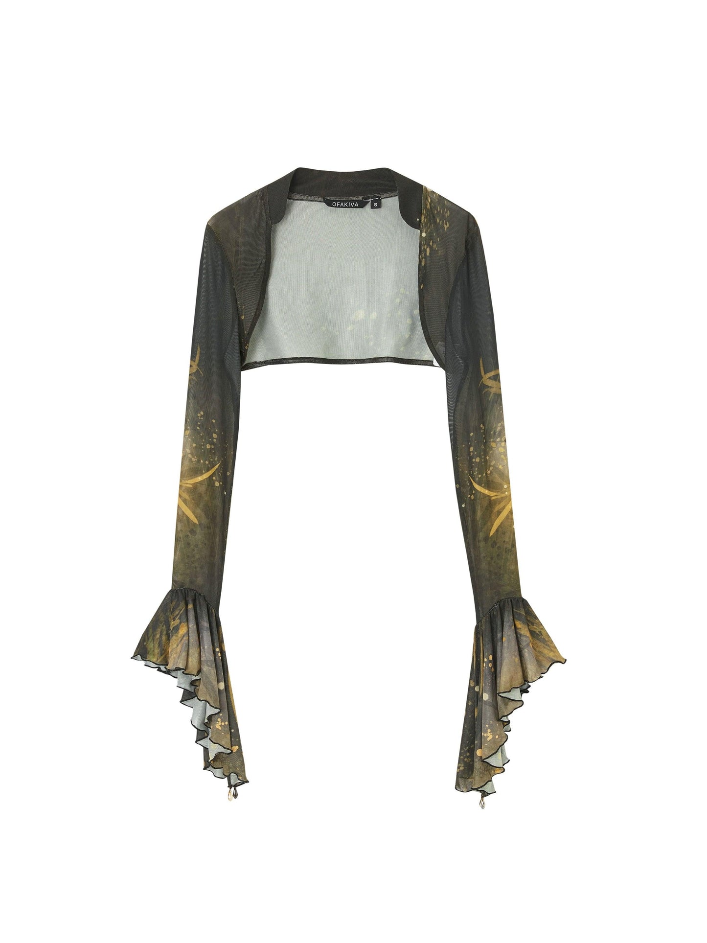 Slim-fit fishtail skirt design: The soft and elastic fabric allows it to contour the body with a good fit. Features lace-edged sleeves and a bolero. with ruffles blooming at the wrists.