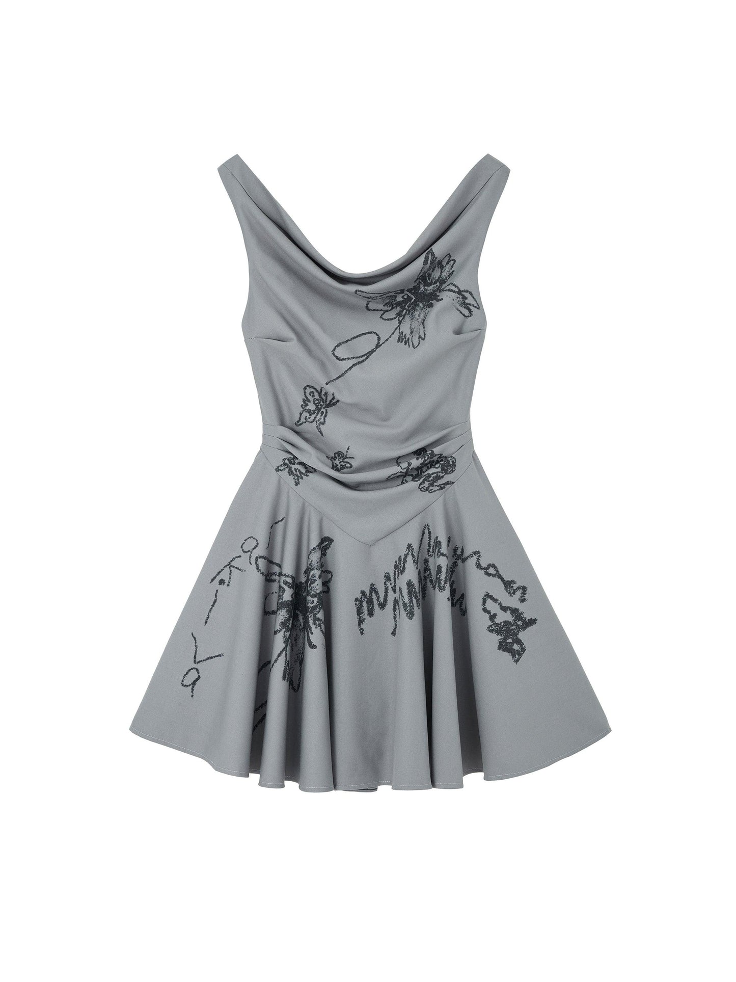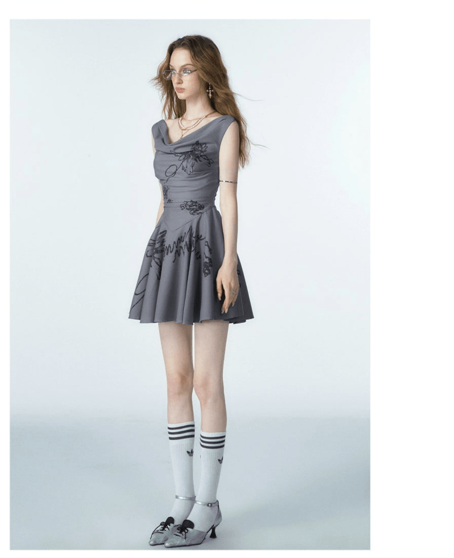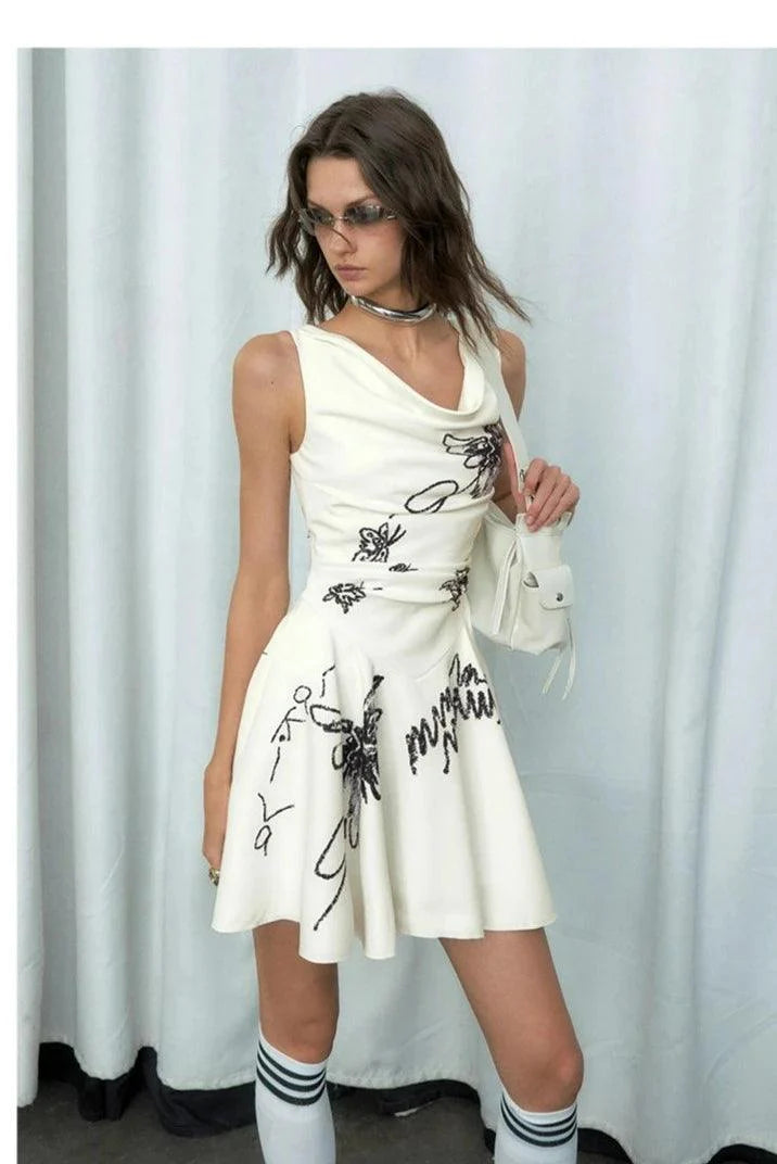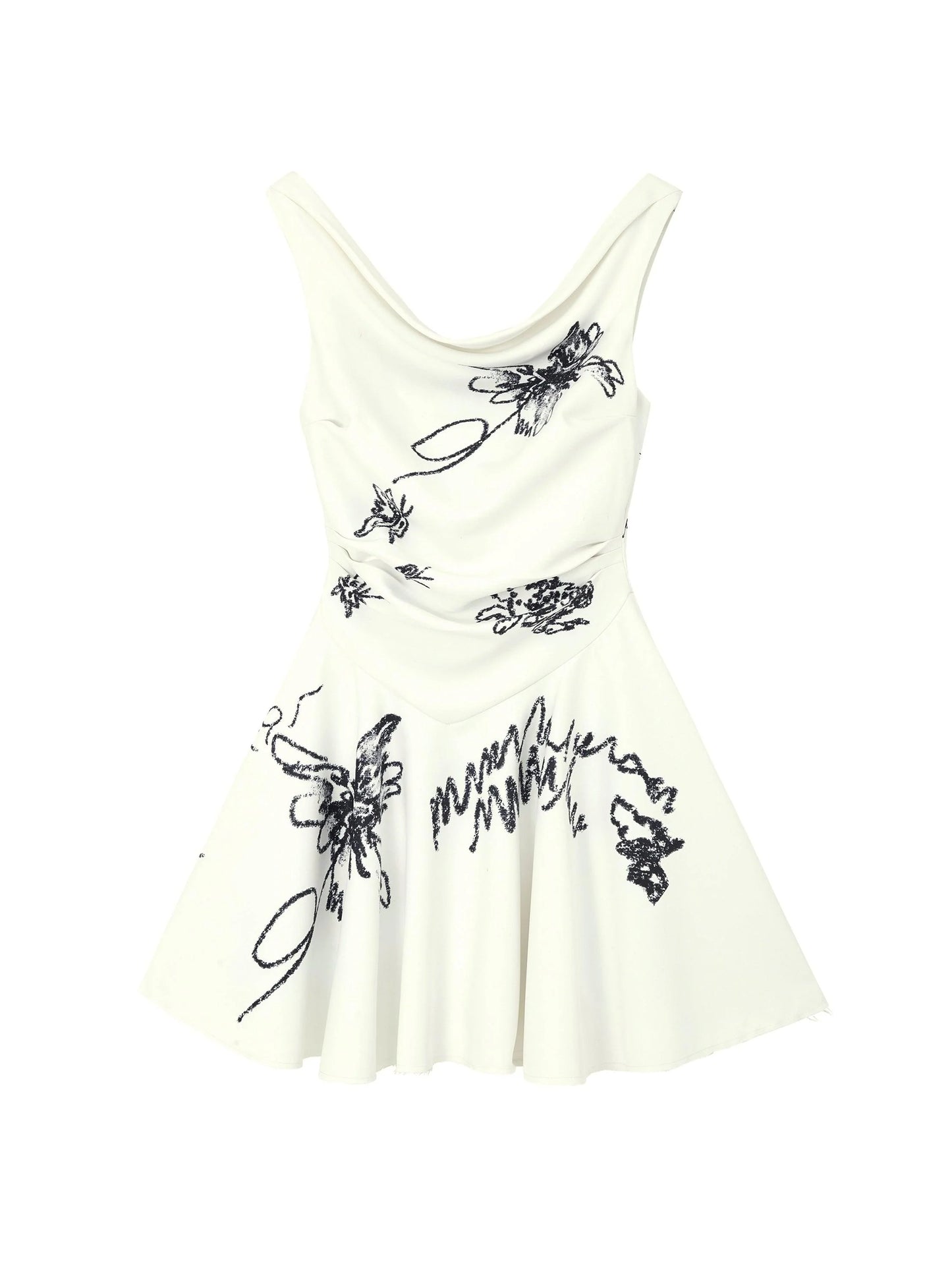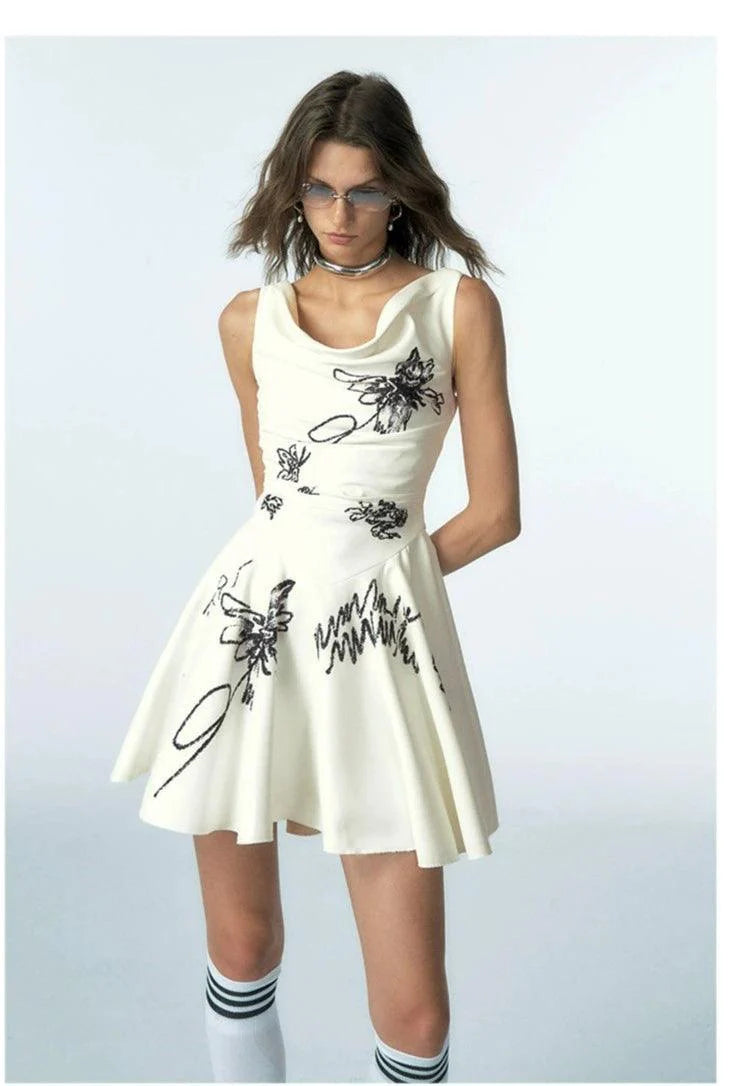 Of Akiva Floral Sketch Fit And Flare Dress - Women'S Sleeveless Cowl Neck Mini Dress With Embroidered Botanical Design