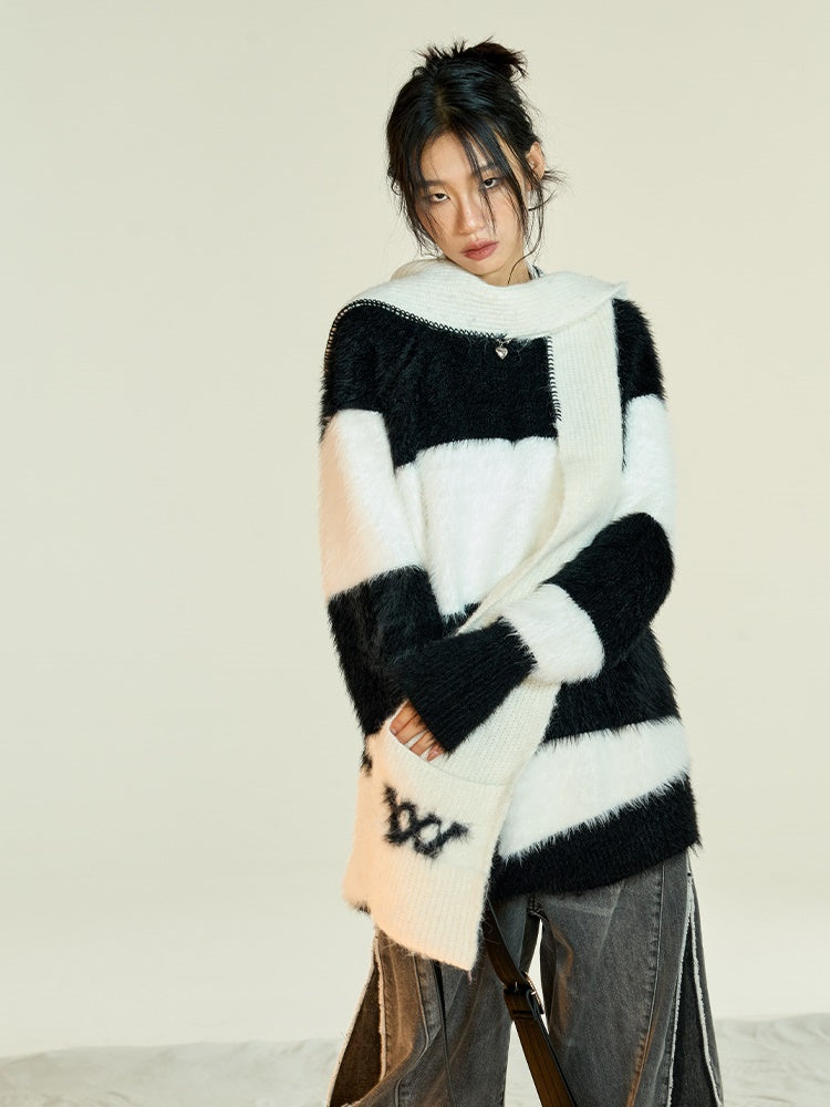 Off-Shoulder Border Fluffy Sweater