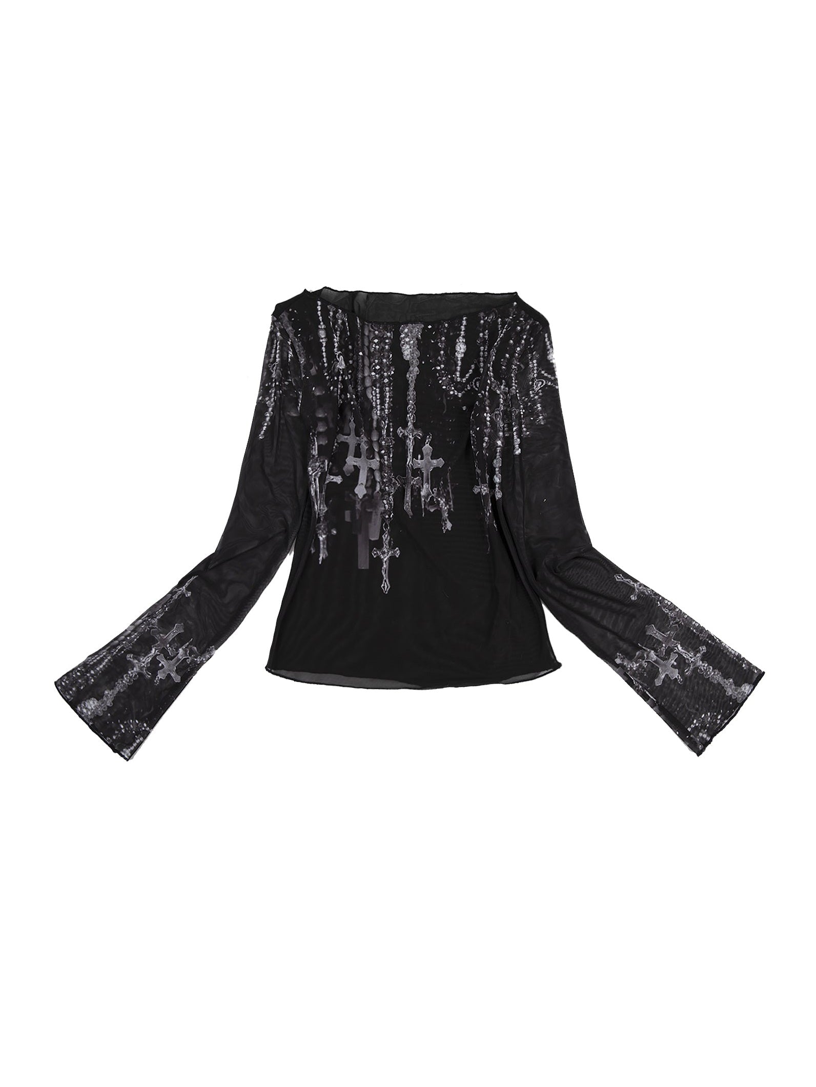 One-Shoulder Printed Mesh Long-Sleeved Shirt