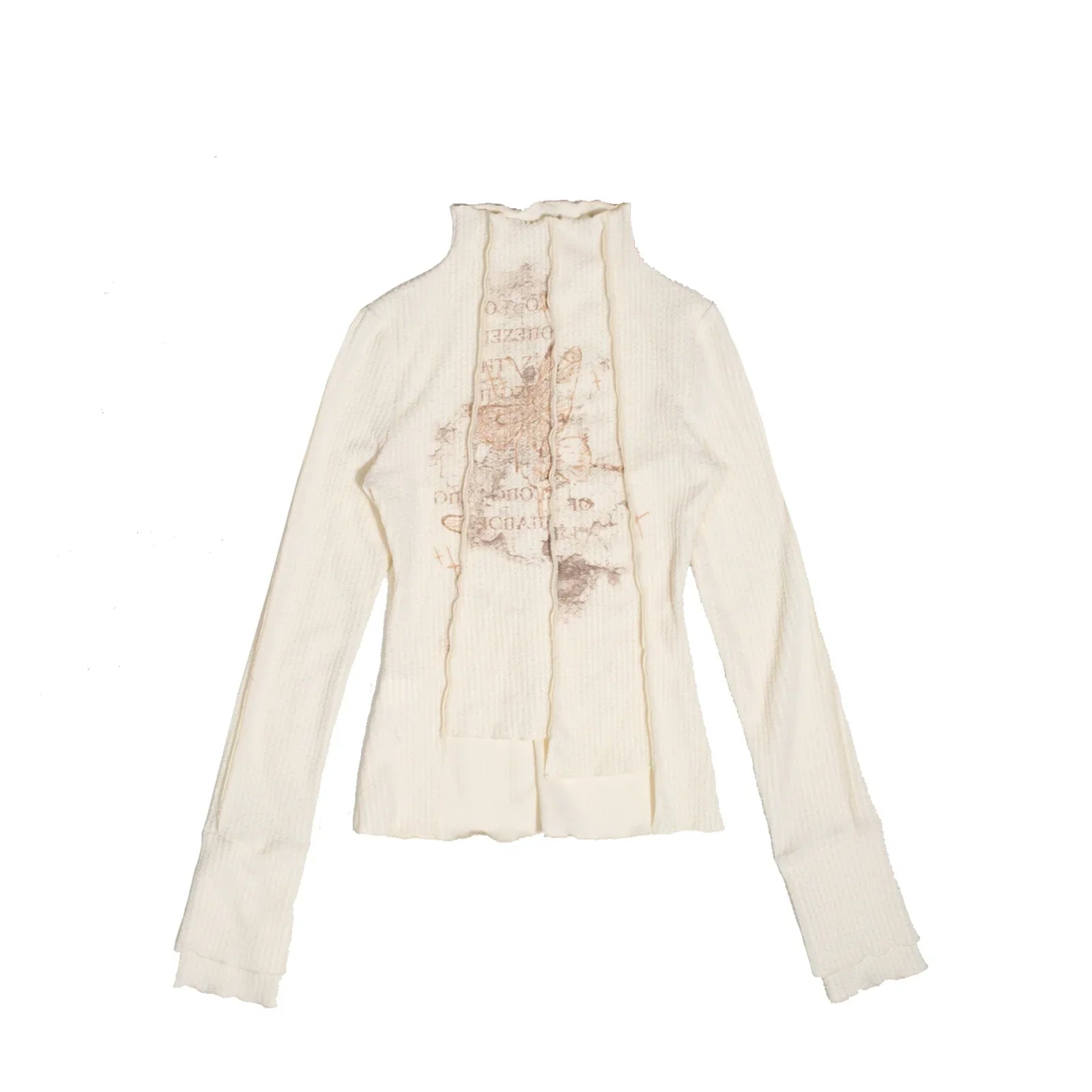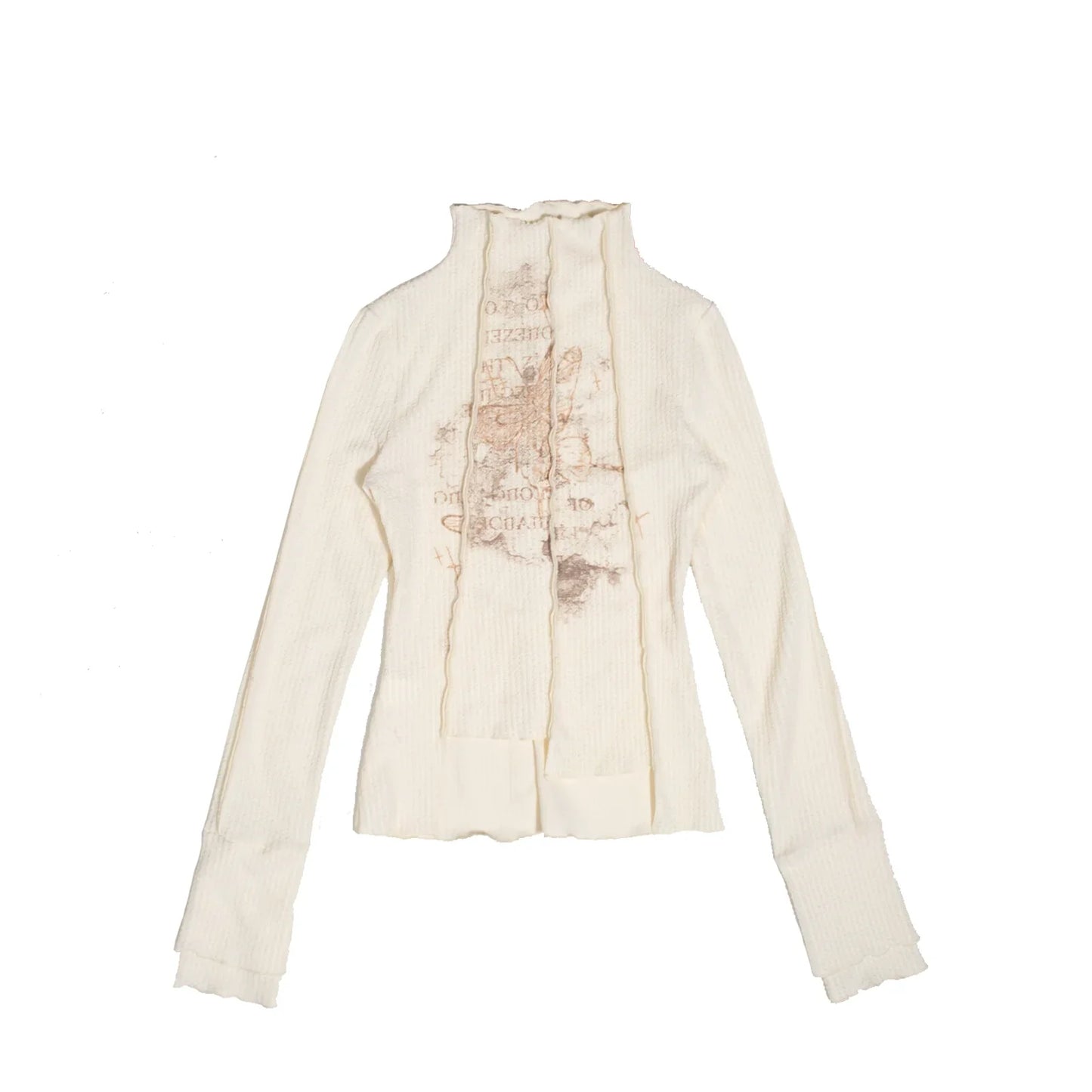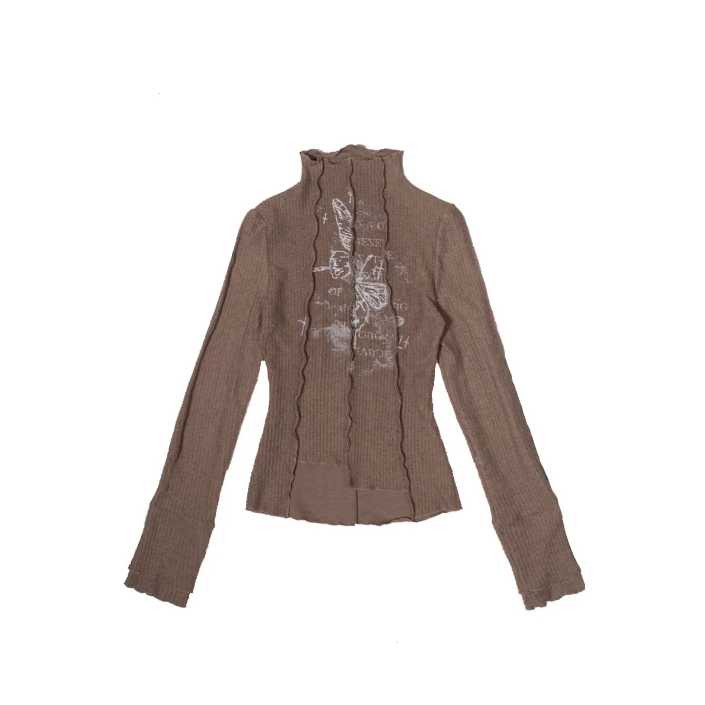 Ribbed turtleneck sweater with delicate butterfly and text print. Available in brown or cream. Features ruffled collar and center panel detailing. Combines romantic vintage aesthetics with cozy knitwear. Perfect for layering or as a standalone piece for a bohemian-chic look.