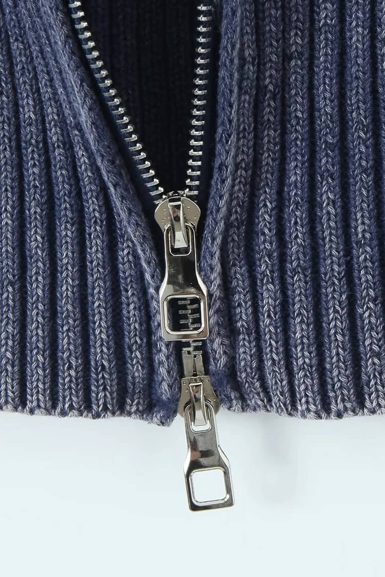 Stay ahead in fashion with our vintage marl knit cardigans! Embrace the allure of the oversized fold-over collar. perfect for creating that sultry off-the-shoulder look. With its dual zipper feature. you have the freedom to flaunt your waistline or opt for full coverage. The split long sleeves showcase creativity. while the worn-in marl knitted ribbed texture adds sophistication and enhances women's curves flawlessly. Slip into this denim-look outfit from our boutique and experience the seamless fusion of sensuality and warmth.