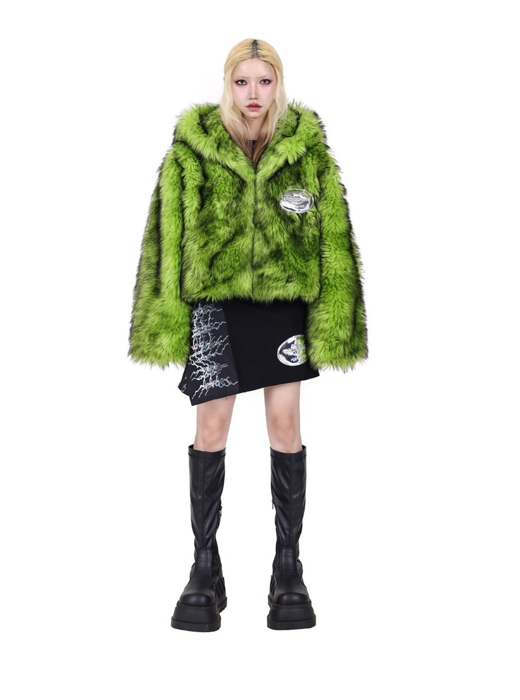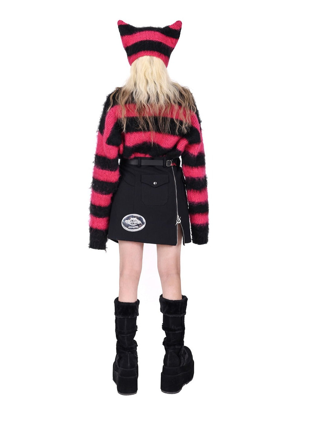 Edgy black mini skirt with a unique quilted texture and asymmetrical hem. Features a high waist and fitted silhouette. Silver hardware detail adds a punk rock touch. Perfect for night clubs. alternative fashion scenes. or pairing with leather jackets for a sleek. urban-inspired look.