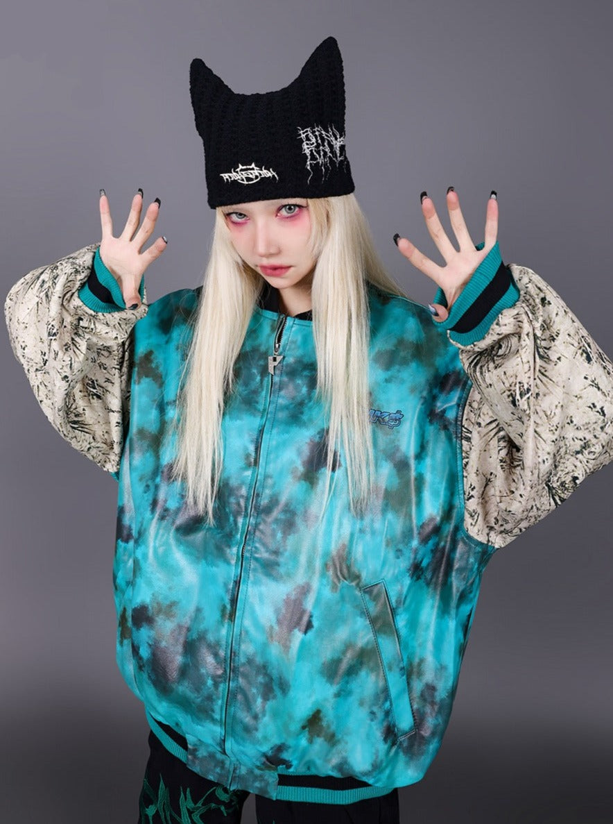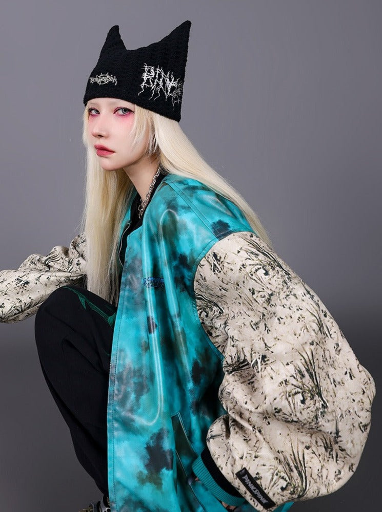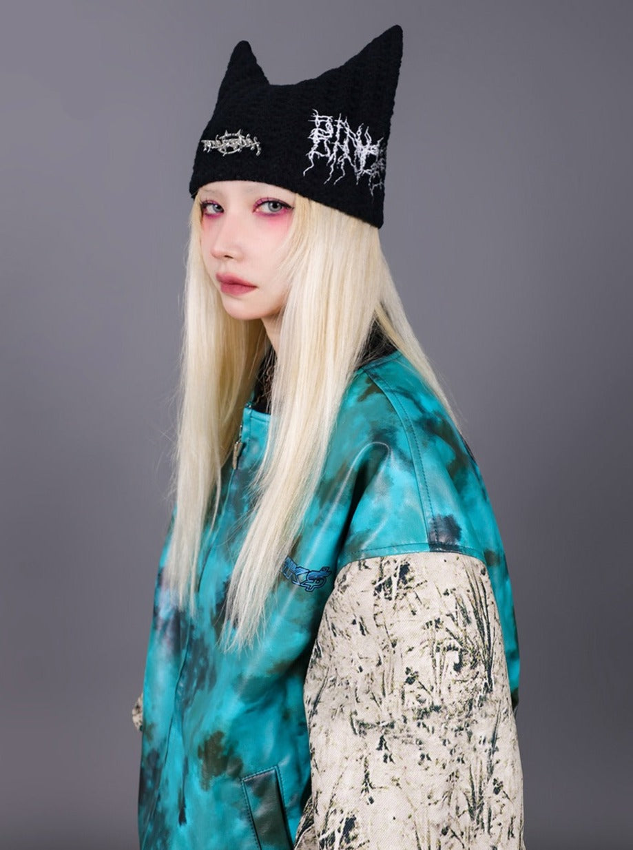 Edgy black knit beanie with distinctive pointed cat ears. Features white embroidered text in a jagged. illegible metal band logo style on the front and side. The contrasting white stitching creates a bold. eye-catching effect against the deep black fabric. Soft. stretchy knit material ensures a comfortable fit.