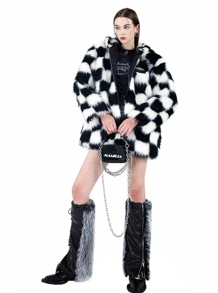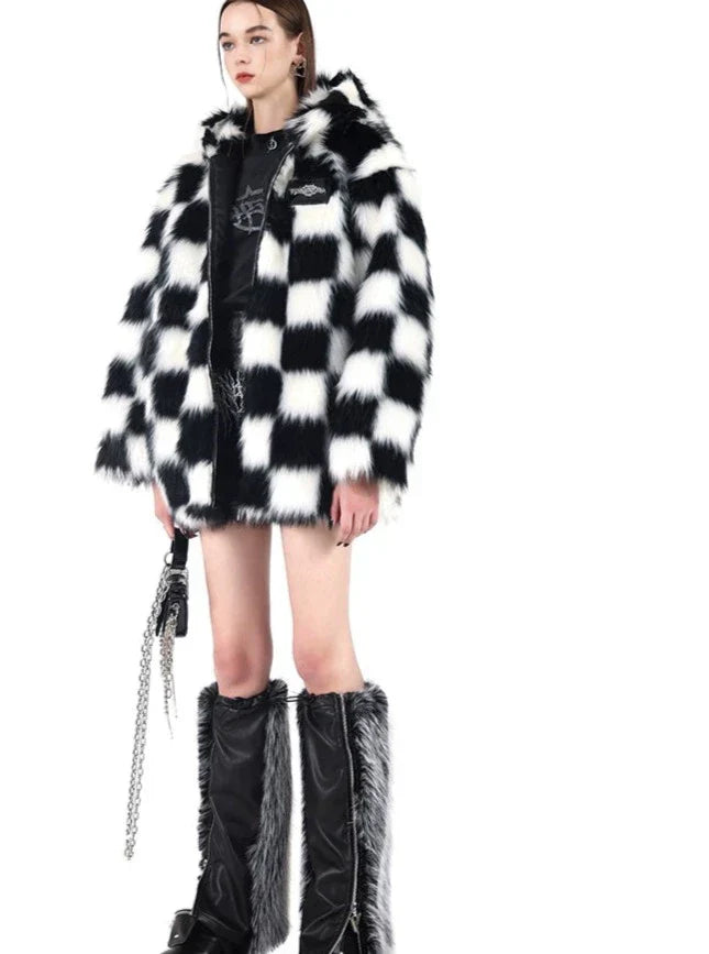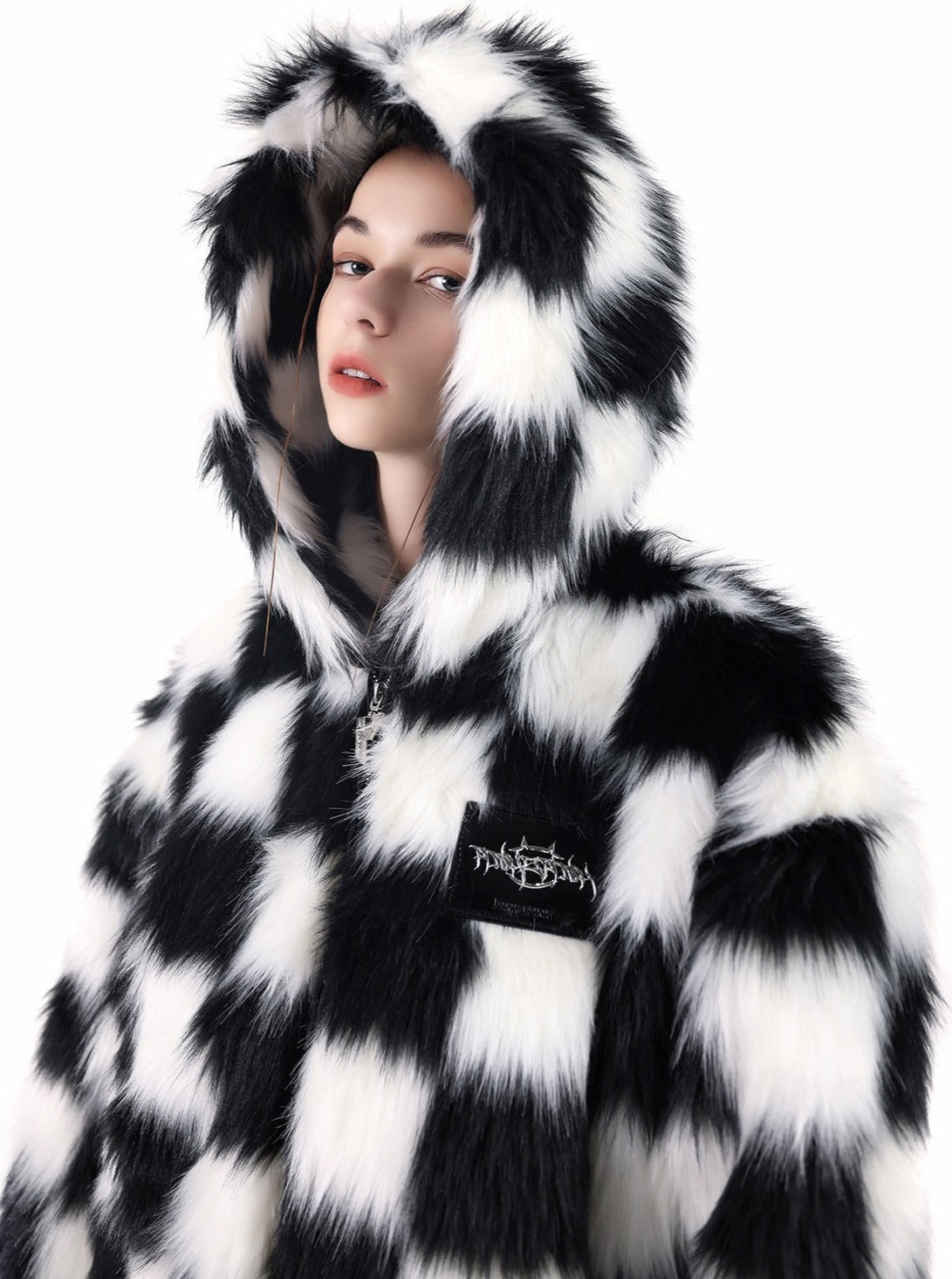 Bold oversized coat in a striking black and white checkered pattern. Plush faux fur texture adds luxury and warmth. Features a boxy silhouette with wide lapels and hidden closures. Ideal for making a statement at winter events. pairing with all-black outfits. or adding dramatic flair to evening wear.