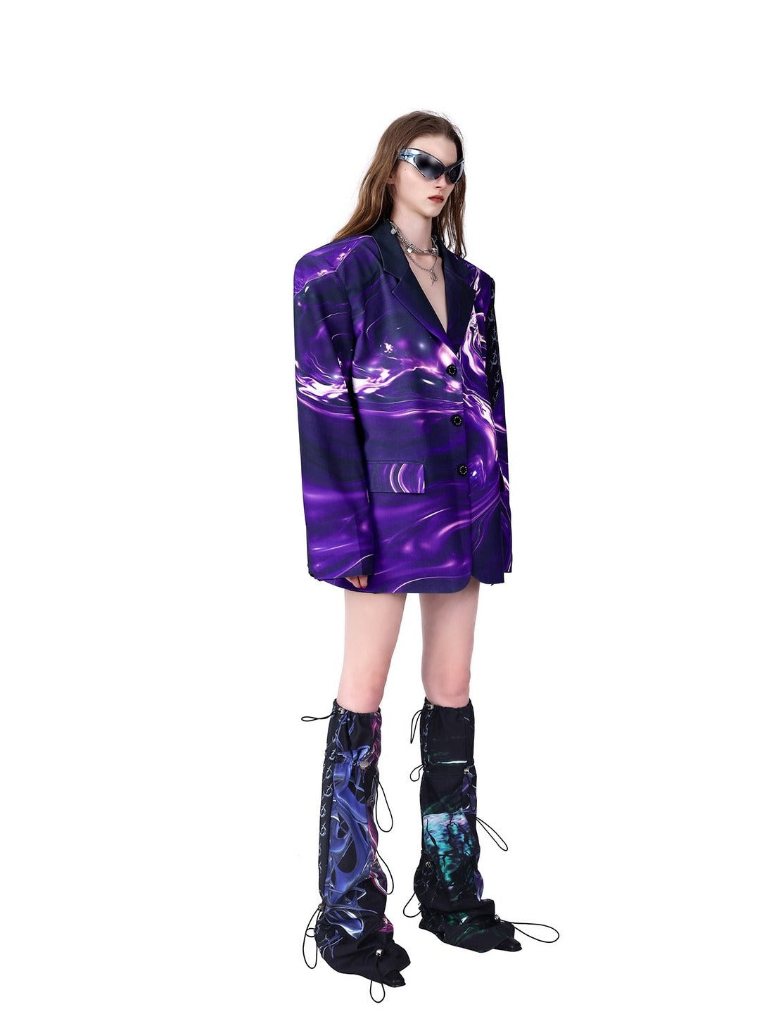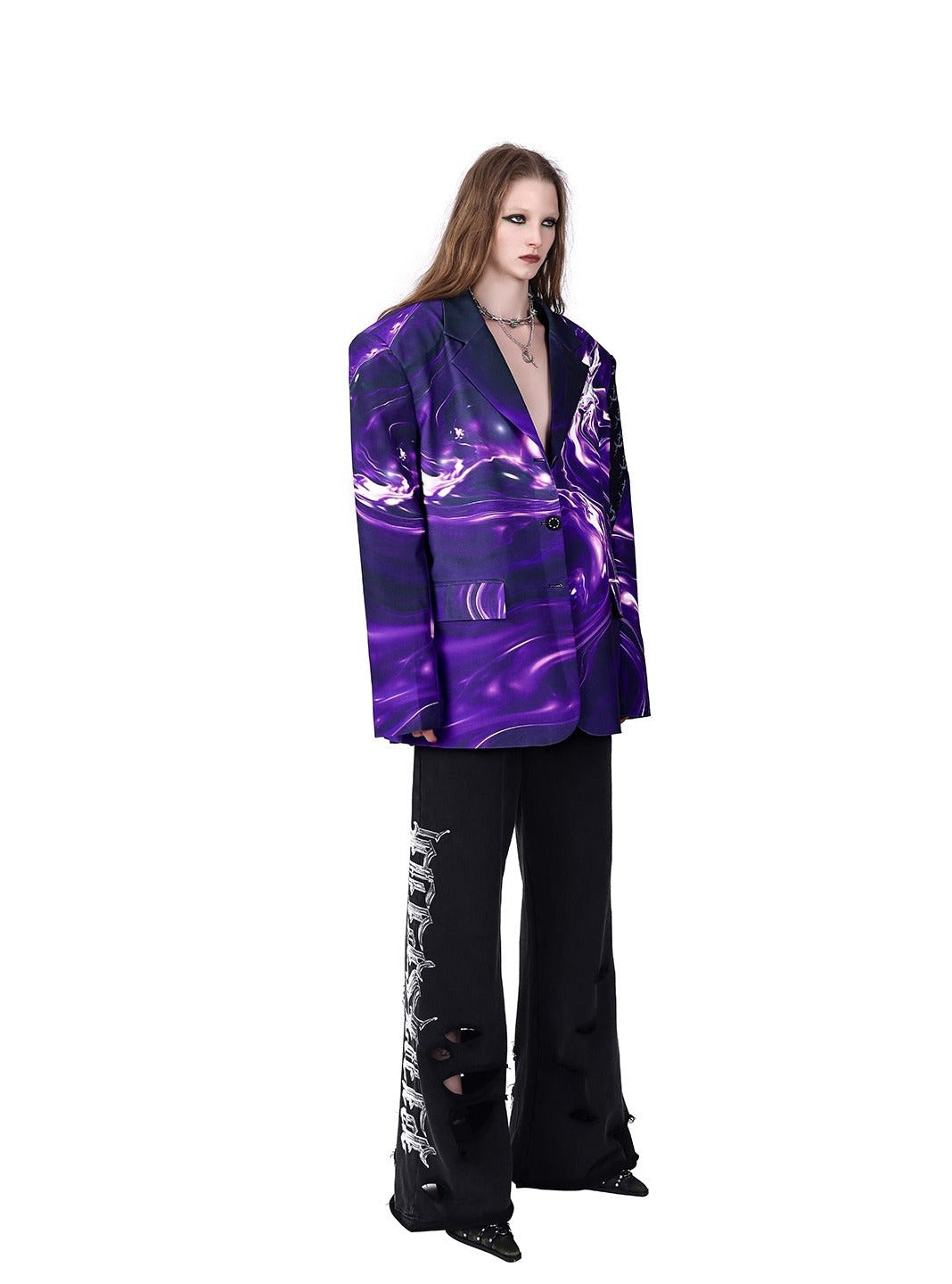 Statement blazer featuring a vibrant cosmic print in shades of purple and black. Oversized fit with peaked lapels and front button closure. All-over galaxy-inspired design with swirling nebulae and star-like accents. Ideal for avant-garde fashion events. themed parties. or as a bold outerwear piece for eccentric nightlife looks.