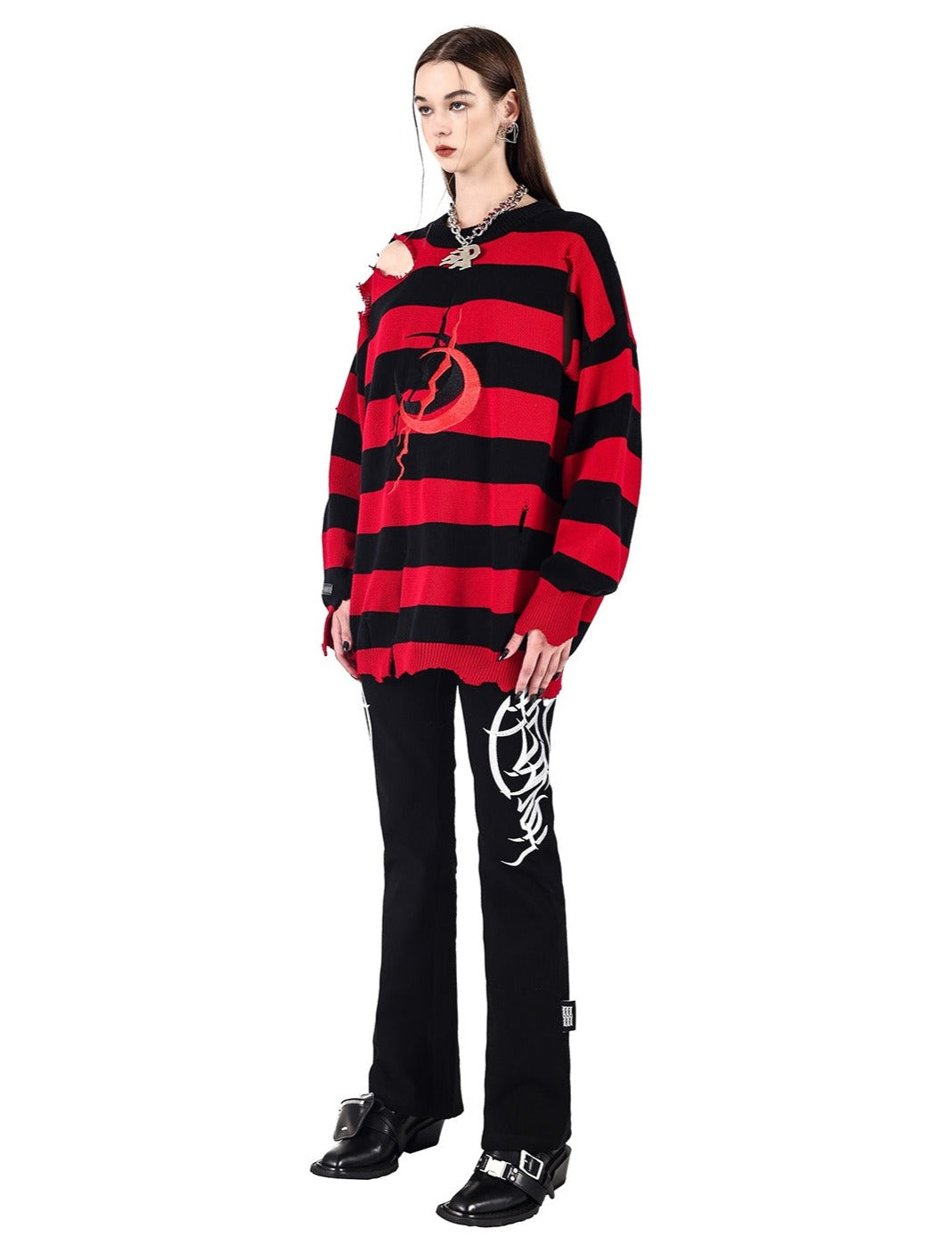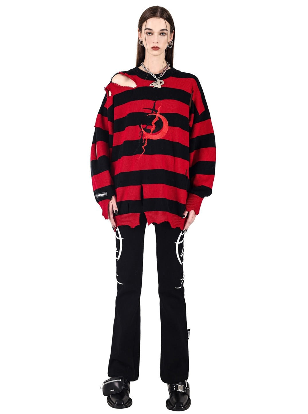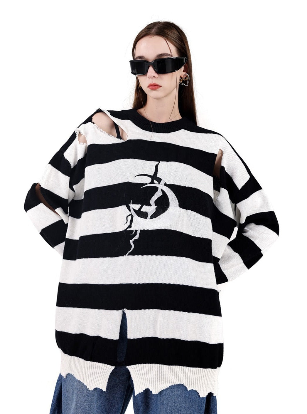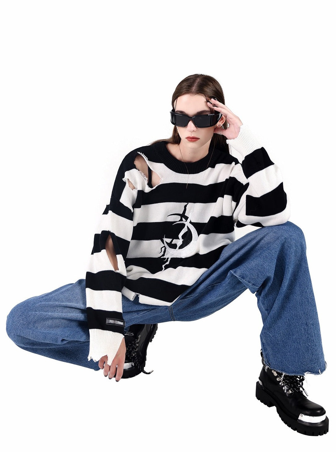 Oversized knit sweater featuring bold horizontal stripes in contrasting colors. Available in black/white. Distressed detailing with intentional holes and tears for an edgy look. Distinctive crescent moon graphic on the chest adds a gothic touch. Relaxed fit with dropped shoulders and ribbed trim.Â