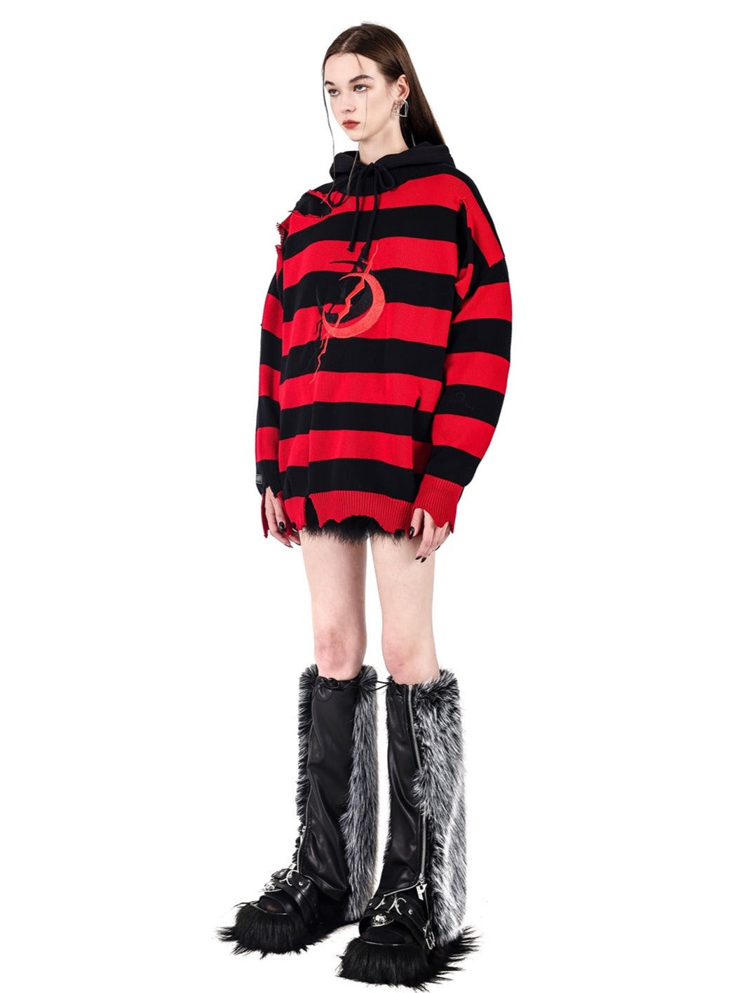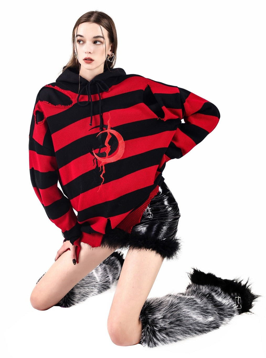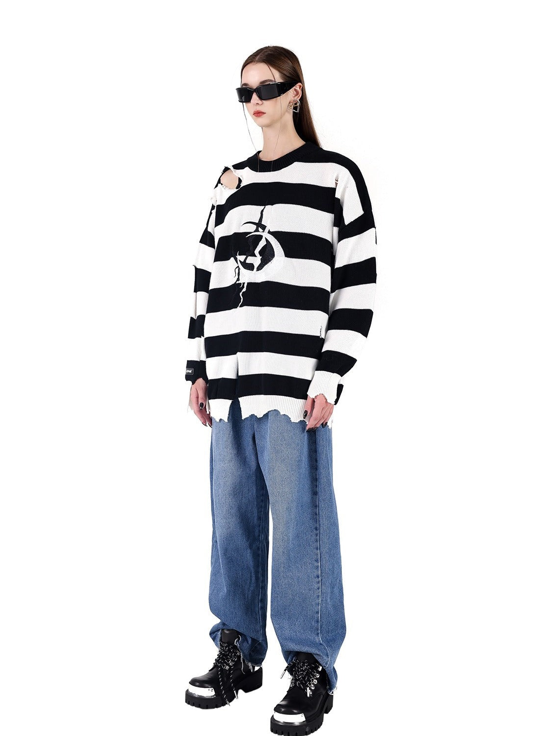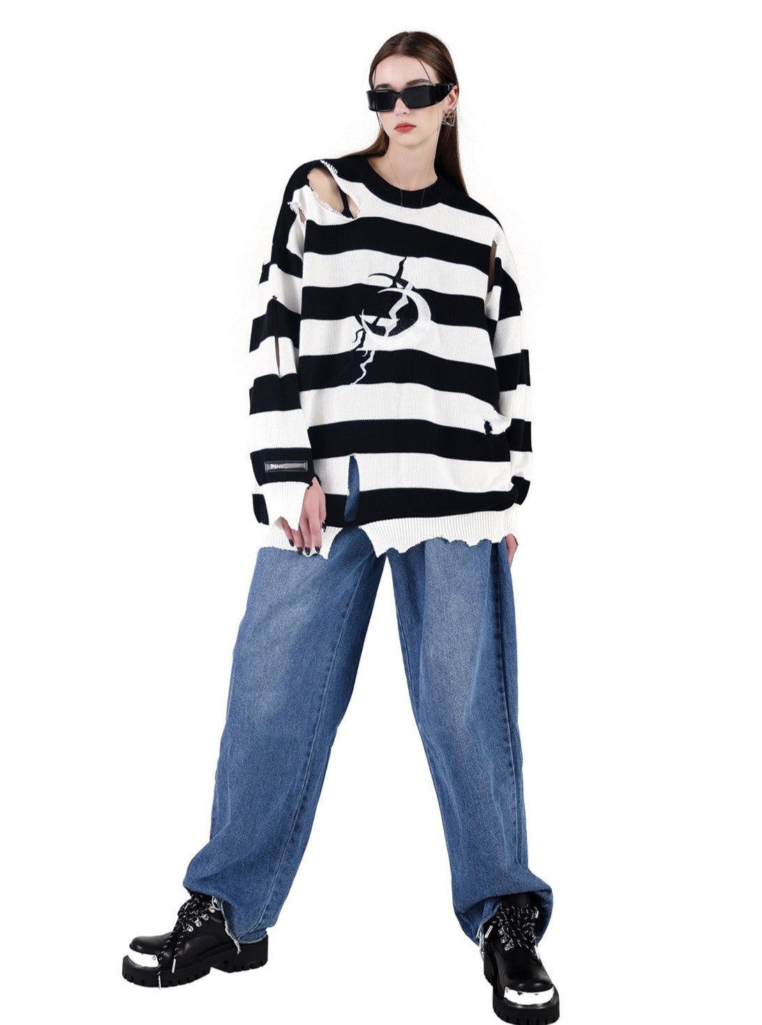Oversized knit sweater featuring bold horizontal stripes in contrasting colors. Available in black/white. Distressed detailing with intentional holes and tears for an edgy look. Distinctive crescent moon graphic on the chest adds a gothic touch. Relaxed fit with dropped shoulders and ribbed trim.Â