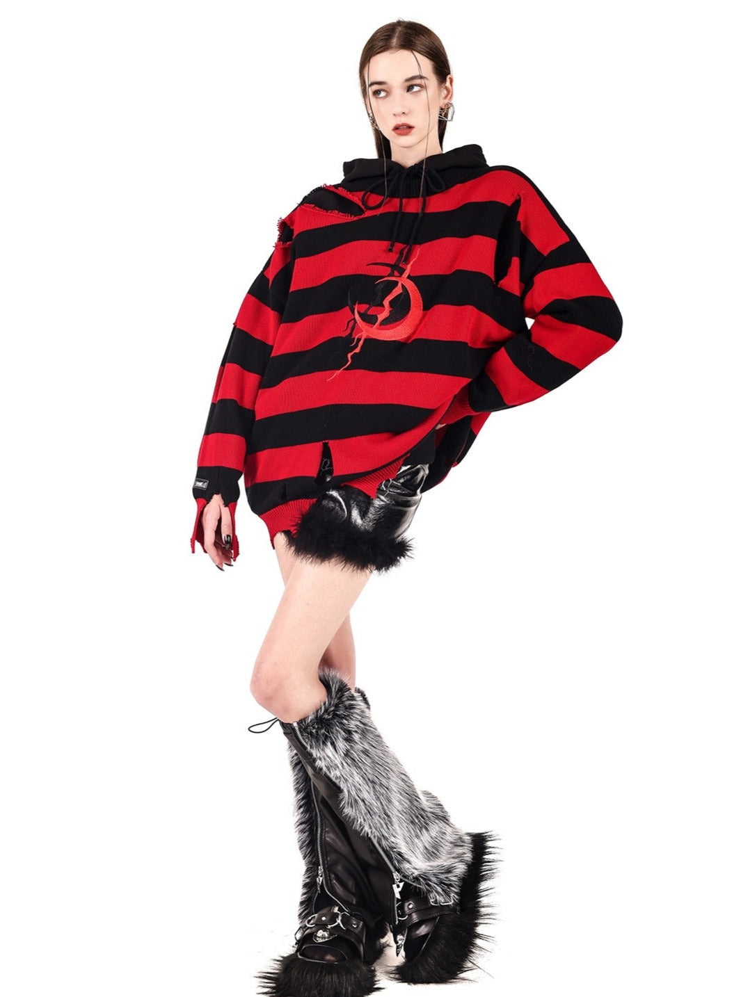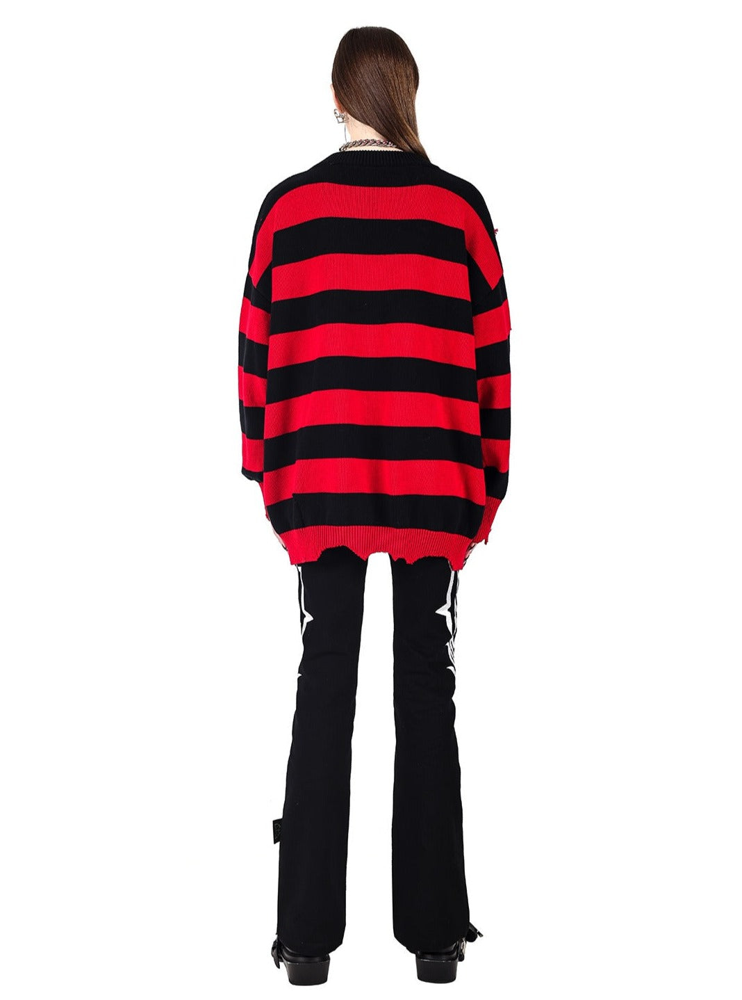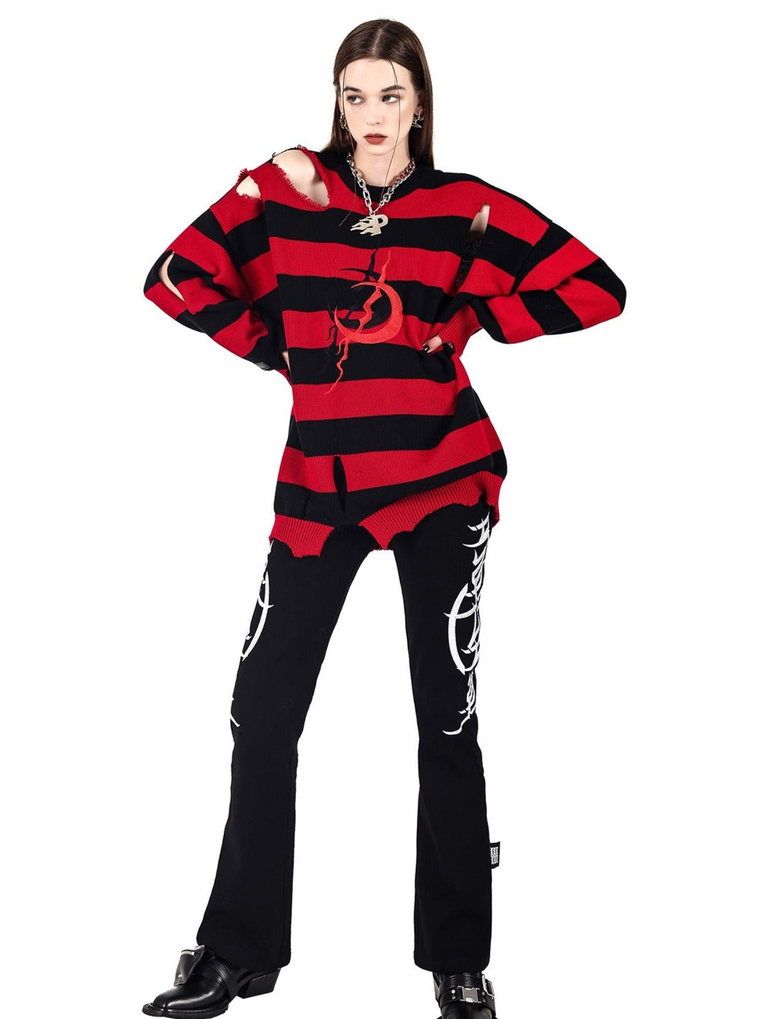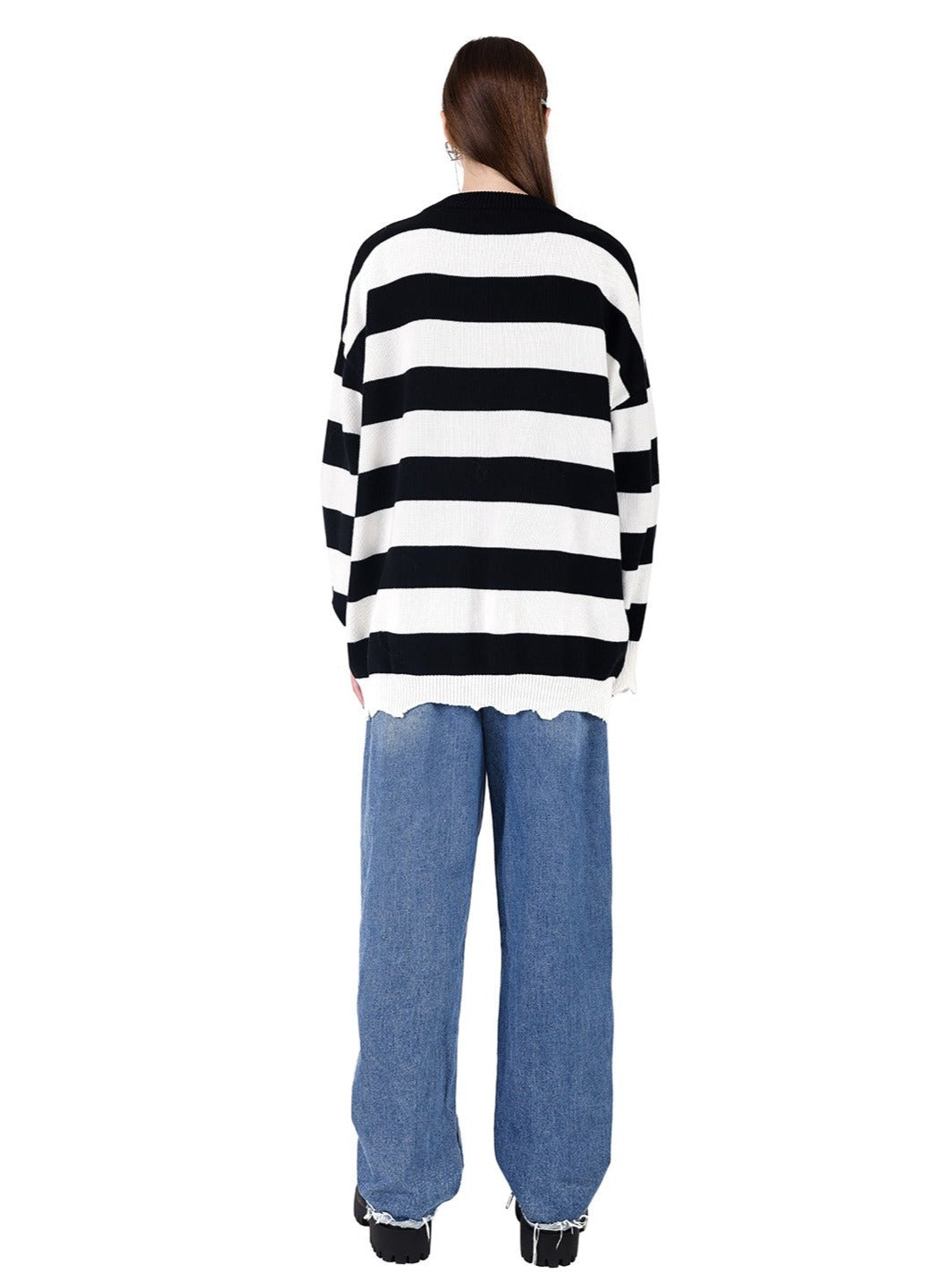 Oversized knit sweater featuring bold horizontal stripes in contrasting colors. Available in black/white. Distressed detailing with intentional holes and tears for an edgy look. Distinctive crescent moon graphic on the chest adds a gothic touch. Relaxed fit with dropped shoulders and ribbed trim.Â
