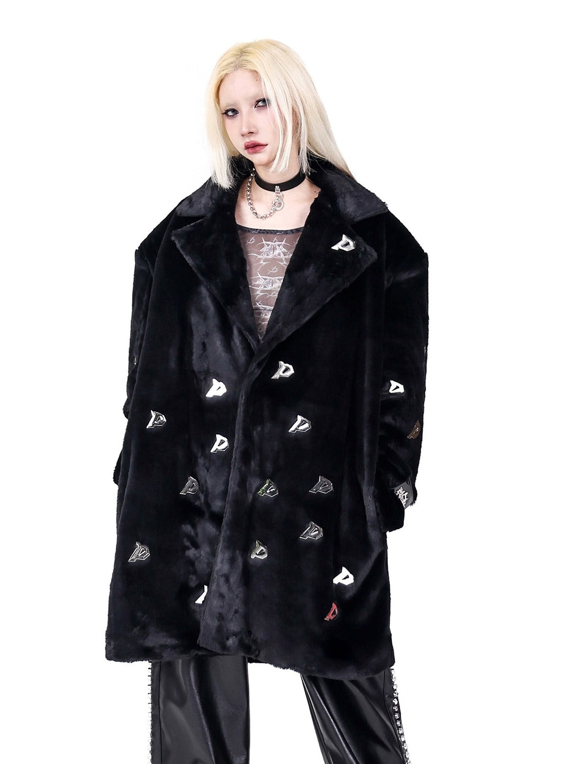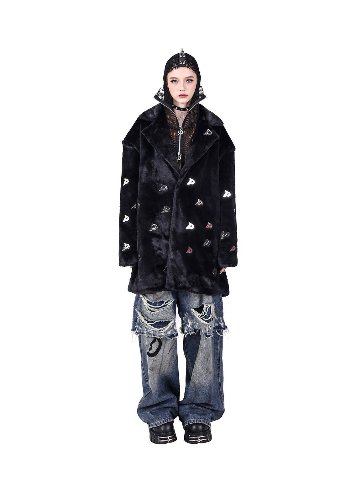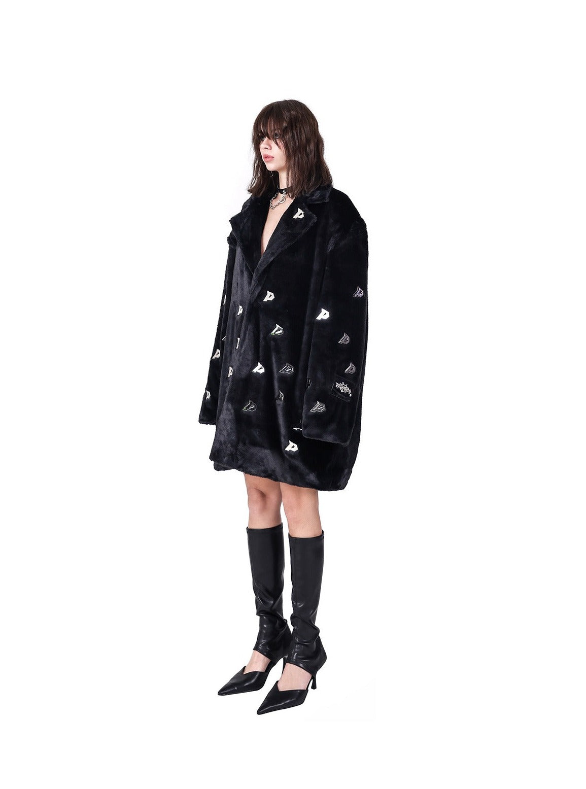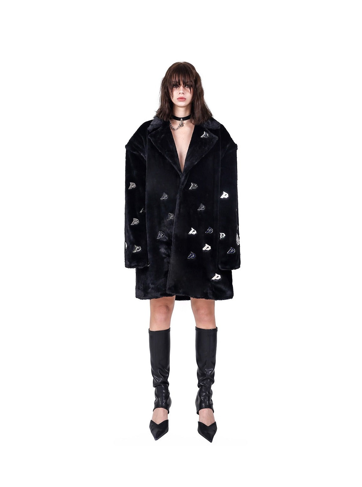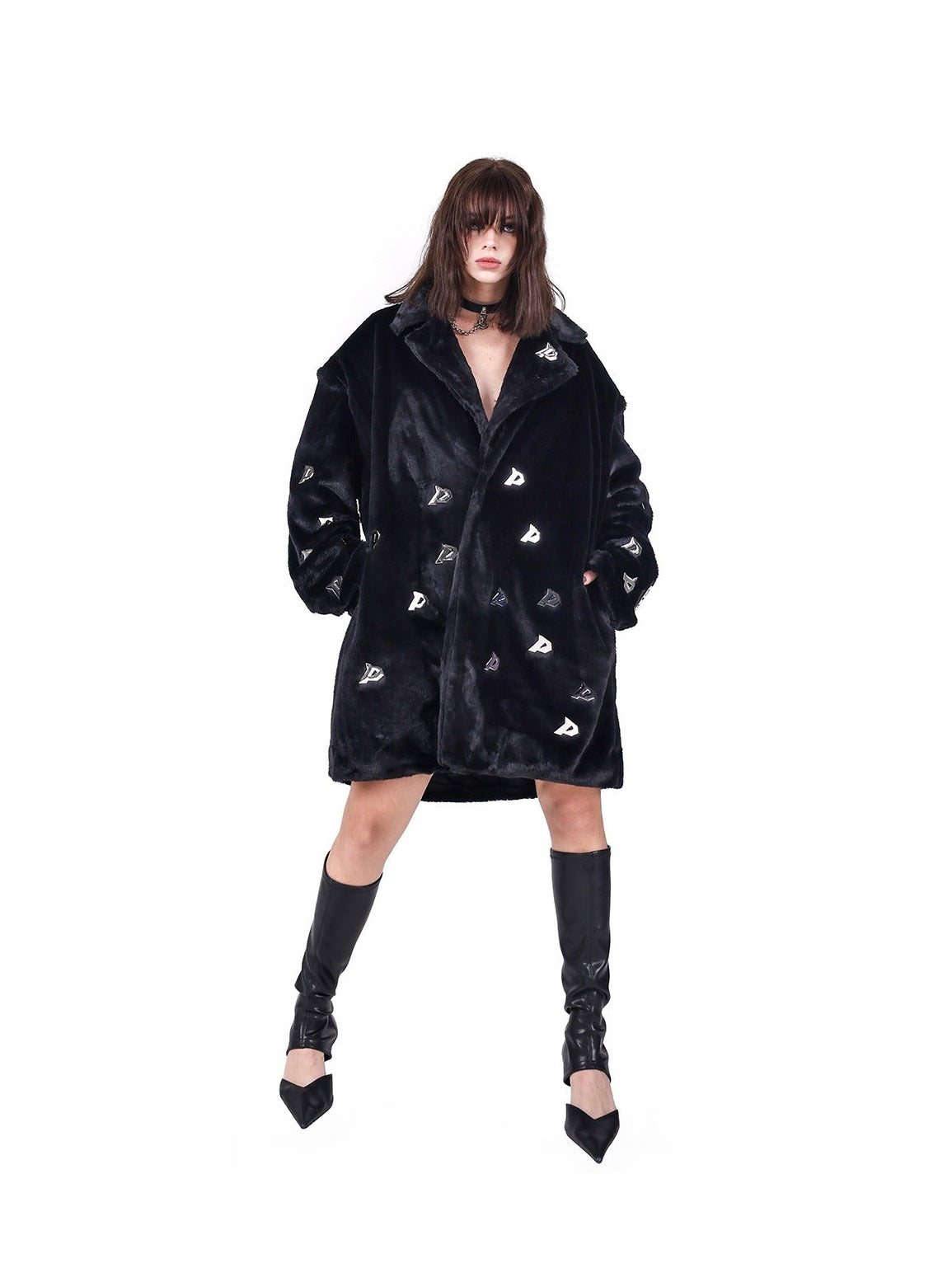Luxurious oversized faux fur coat in deep black with whimsical white cloud embroidery throughout. Features a classic lapel collar and button closure. Plush texture adds warmth and drama. Perfect for making a statement at winter events or adding a playful touch to cold-weather streetwear looks.