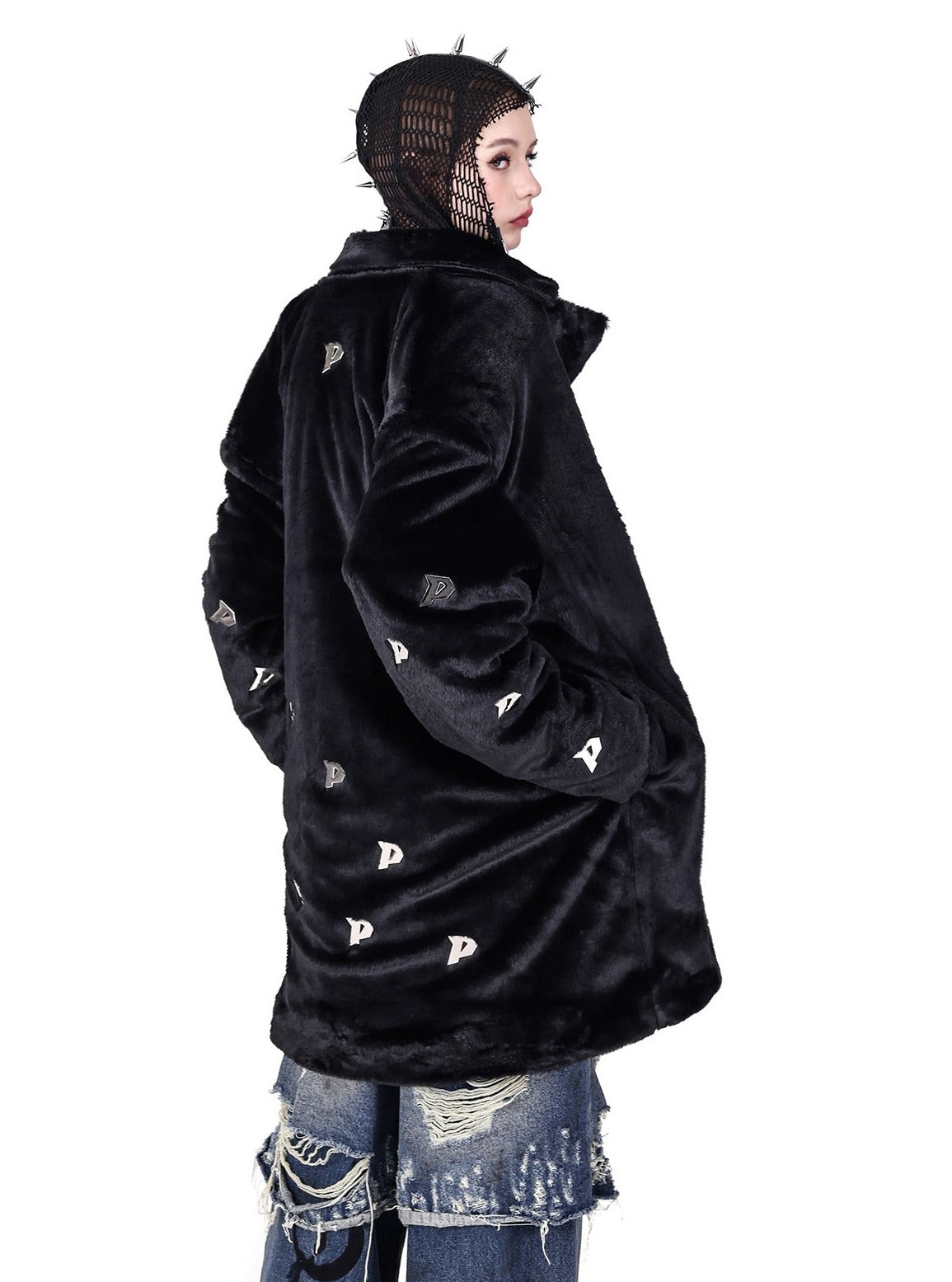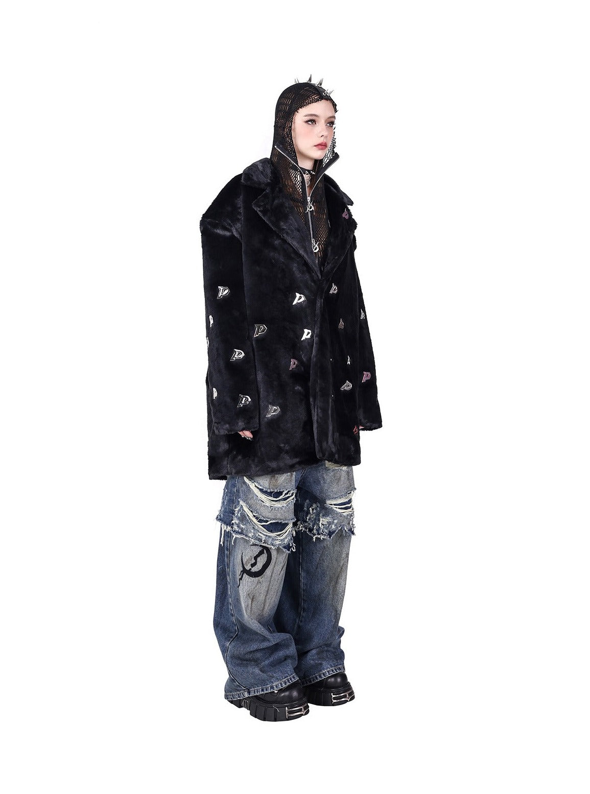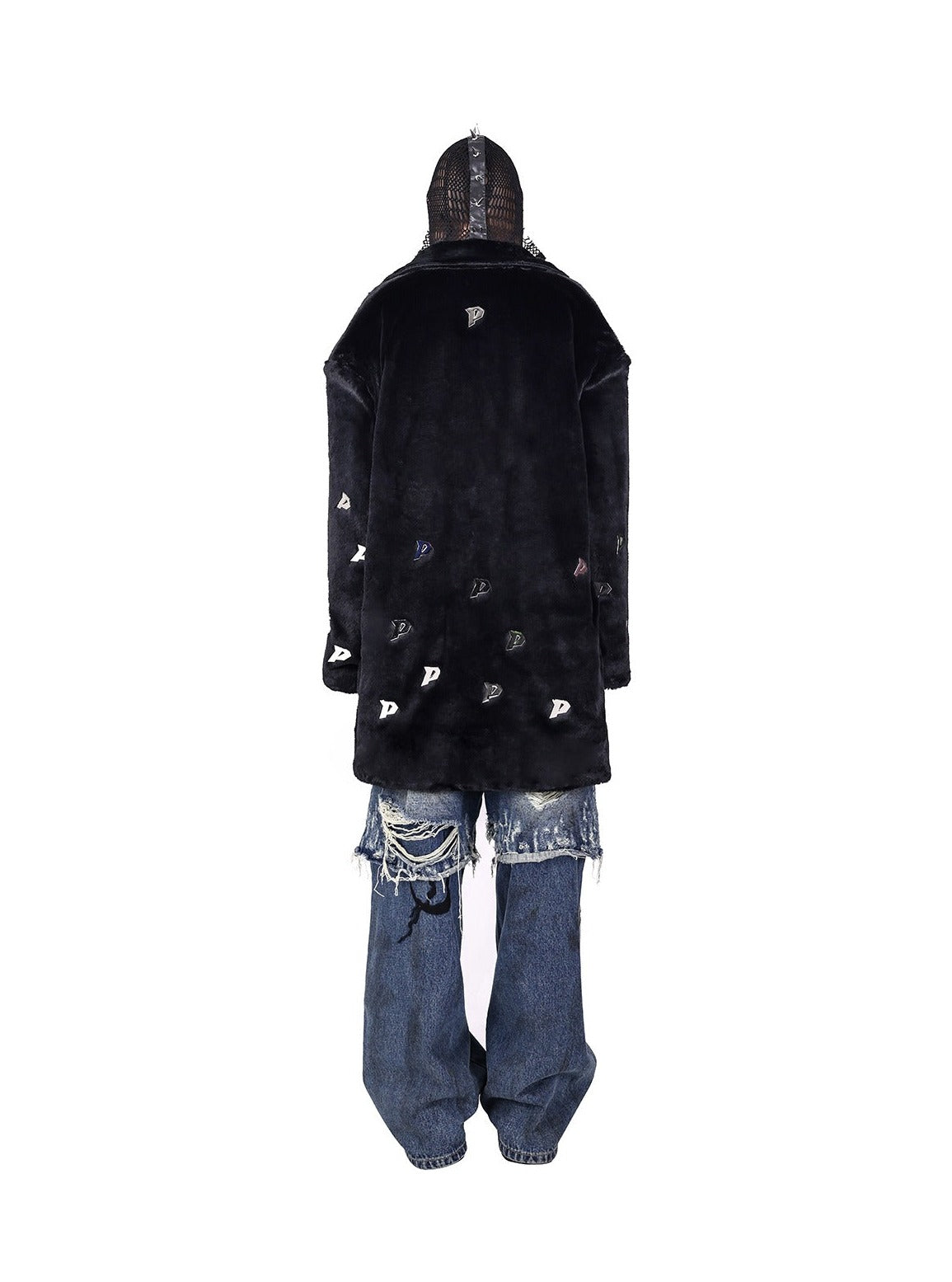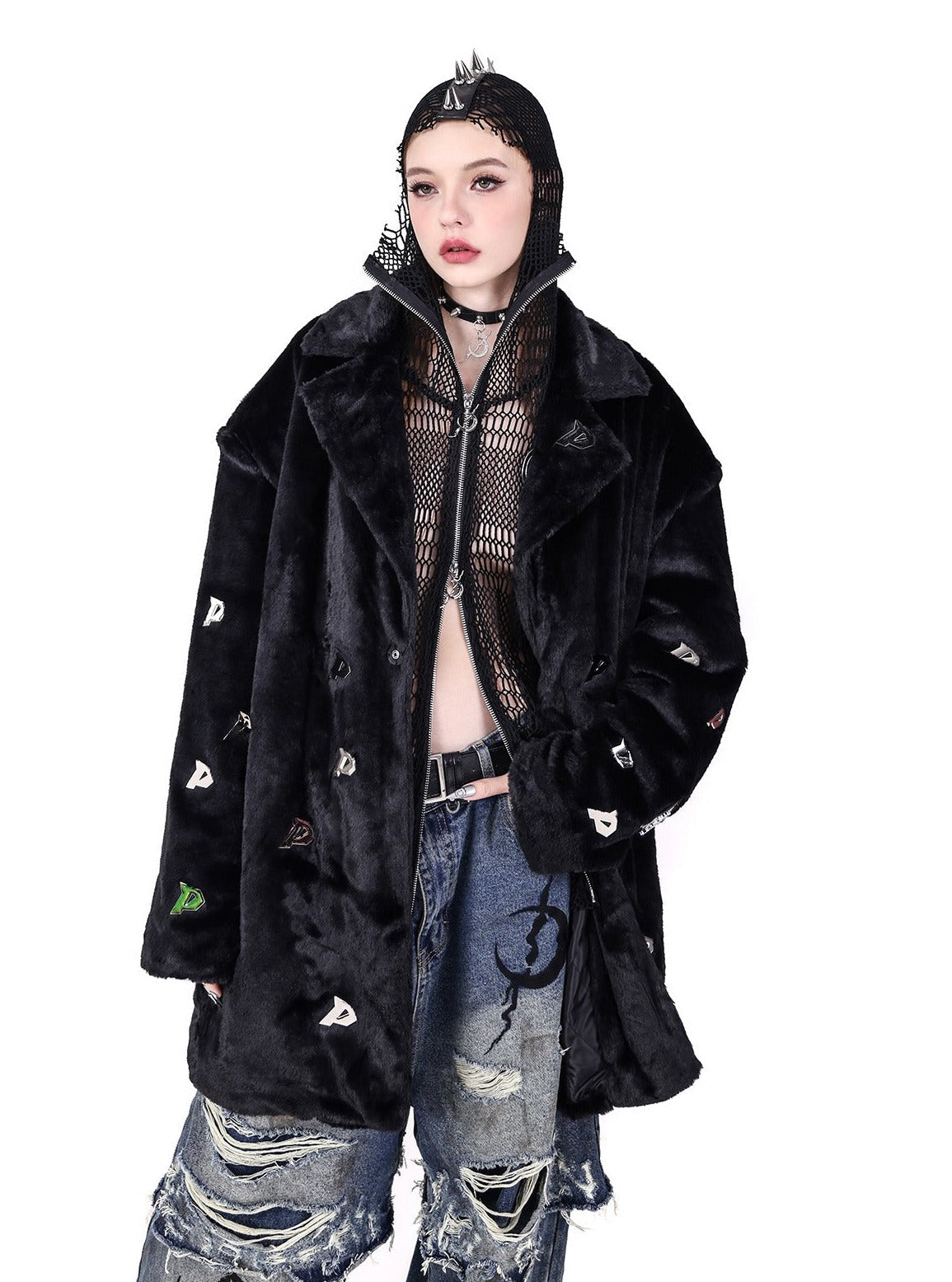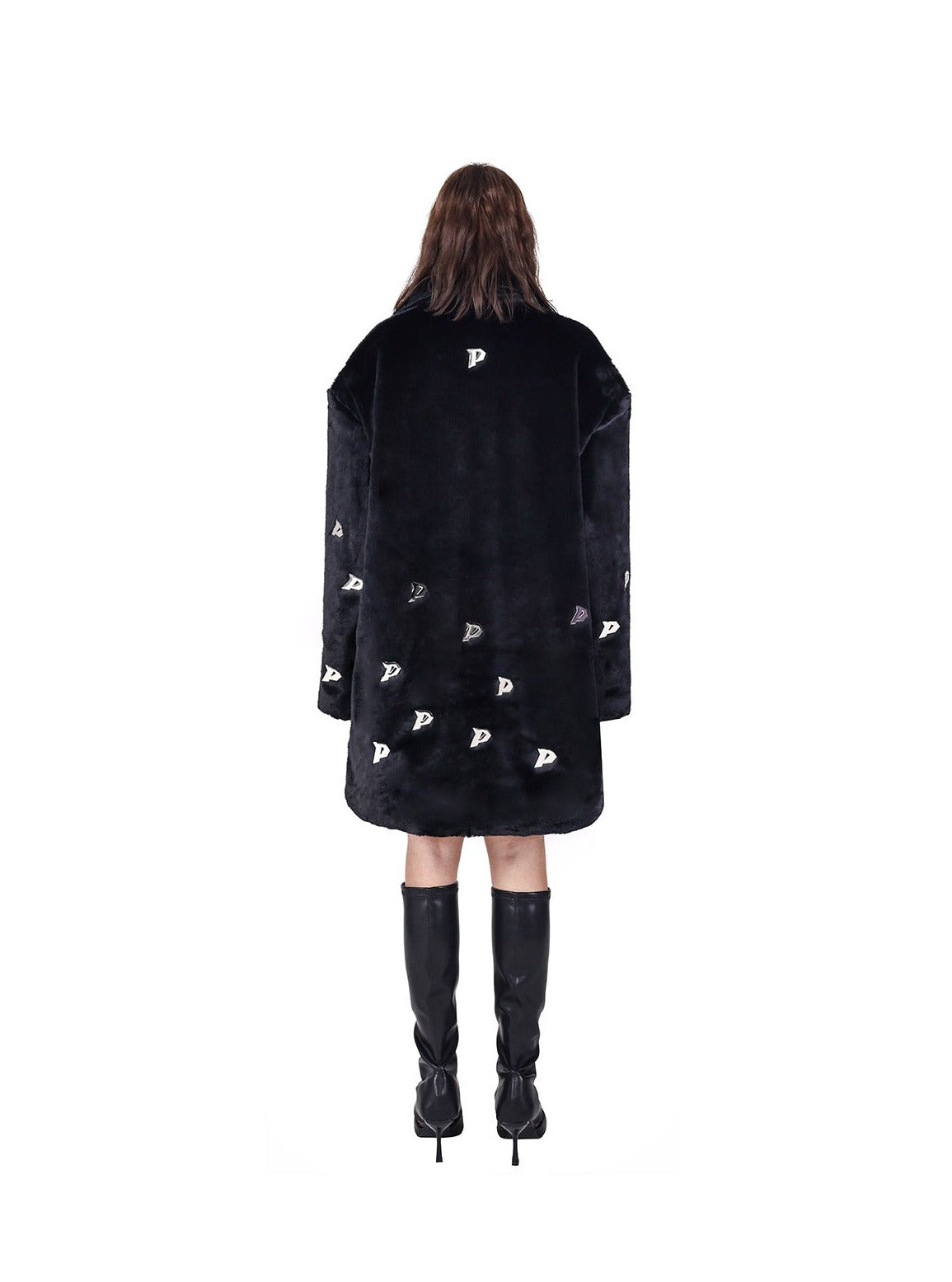 Luxurious oversized faux fur coat in deep black with whimsical white cloud embroidery throughout. Features a classic lapel collar and button closure. Plush texture adds warmth and drama. Perfect for making a statement at winter events or adding a playful touch to cold-weather streetwear looks.
