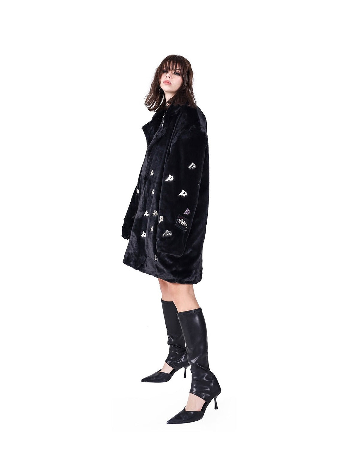 PINKSPINK Embroidered Ghost Faux Fur Coat - Black