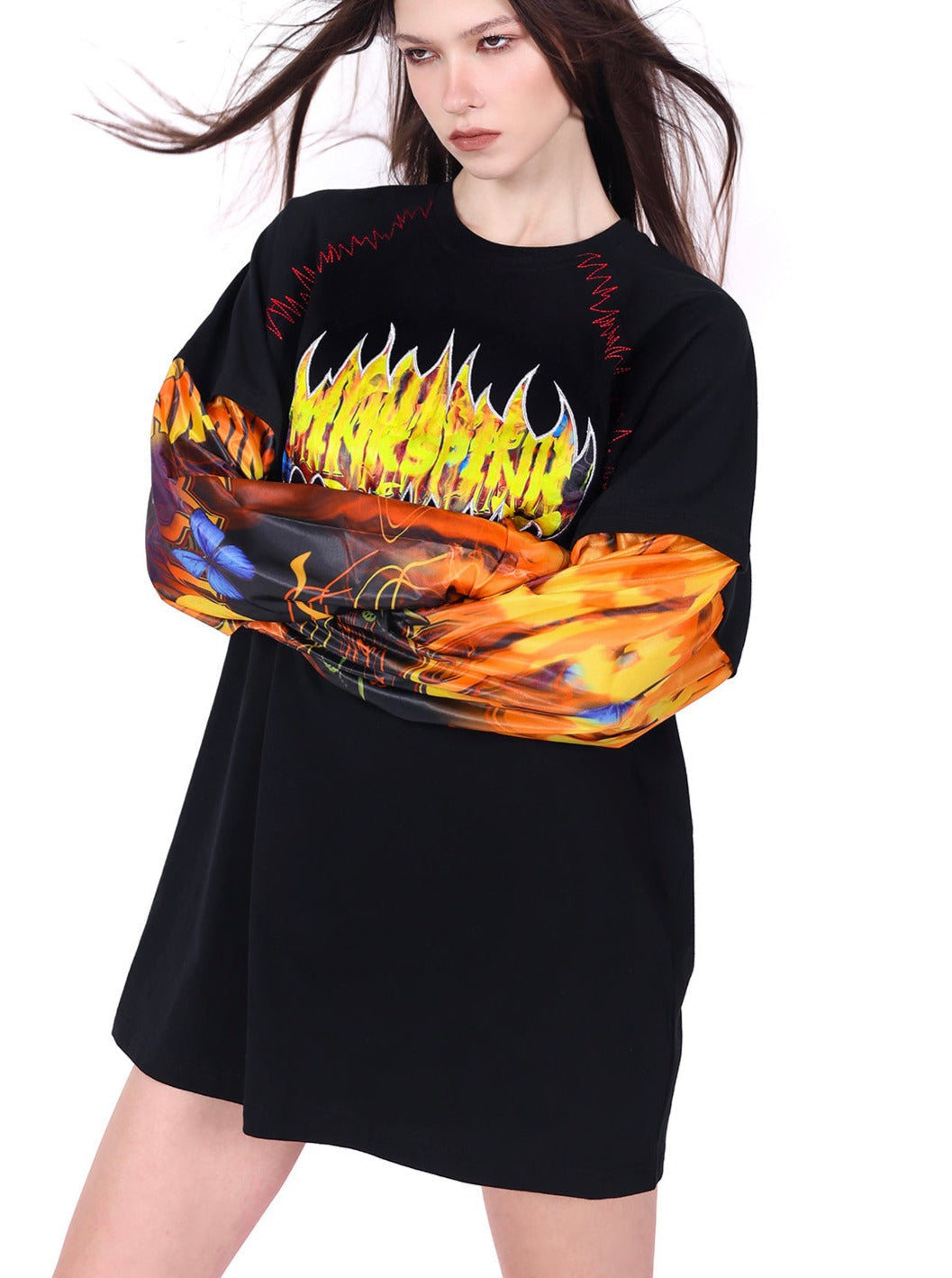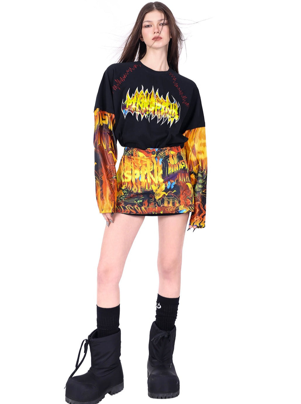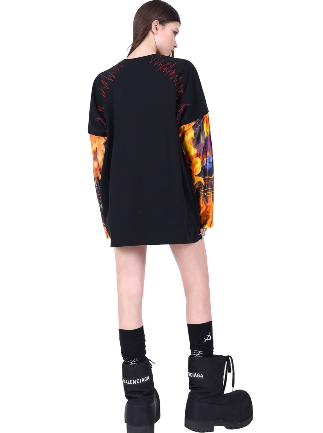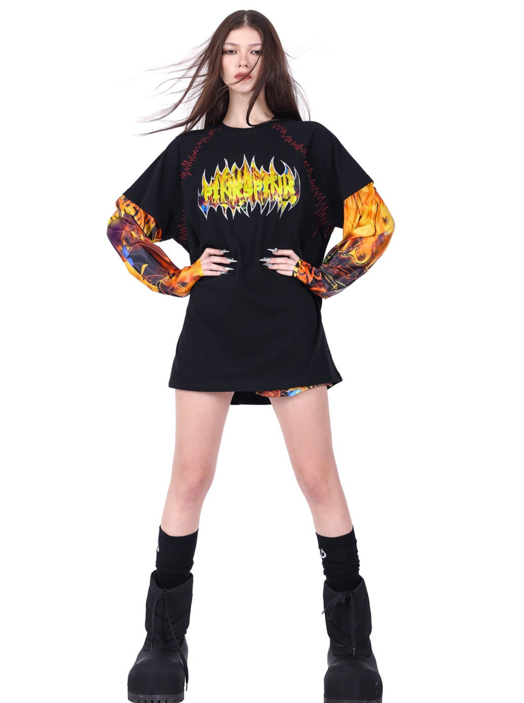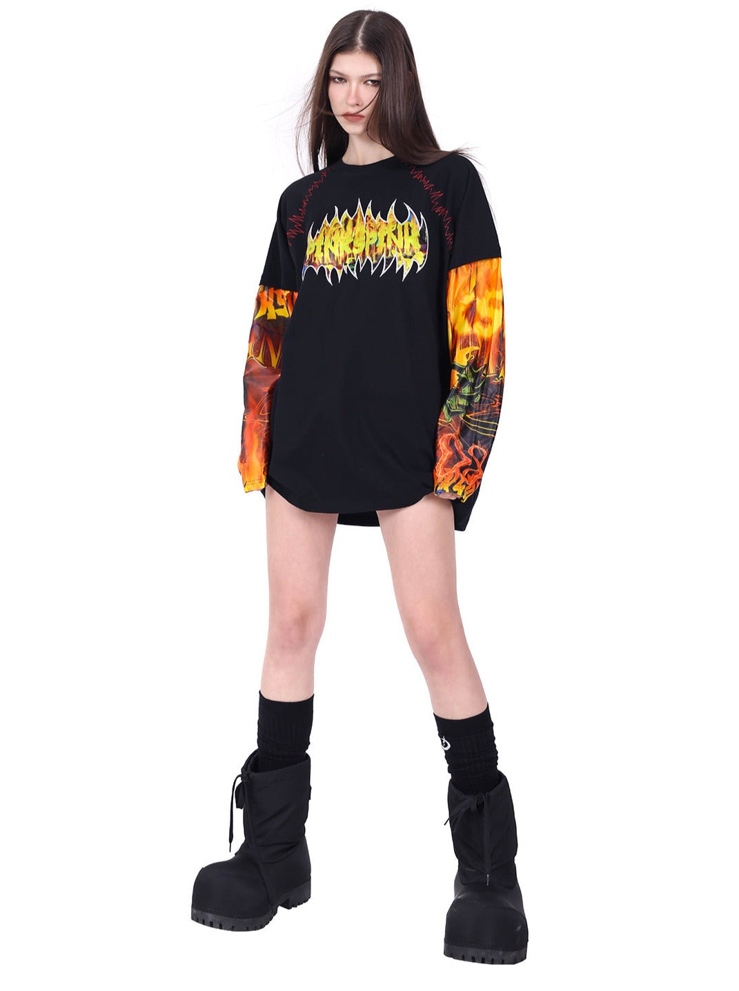 Edgy long sleeve t-shirt featuring a bold metal-inspired design. Black body with a striking flame-styled logo in yellow and white at the center. Sleeves showcase vibrant flame prints in shades of orange. yellow. and red. creating a dramatic contrast against the black torso. Red stitching details on the shoulders add an extra touch of flair.Â