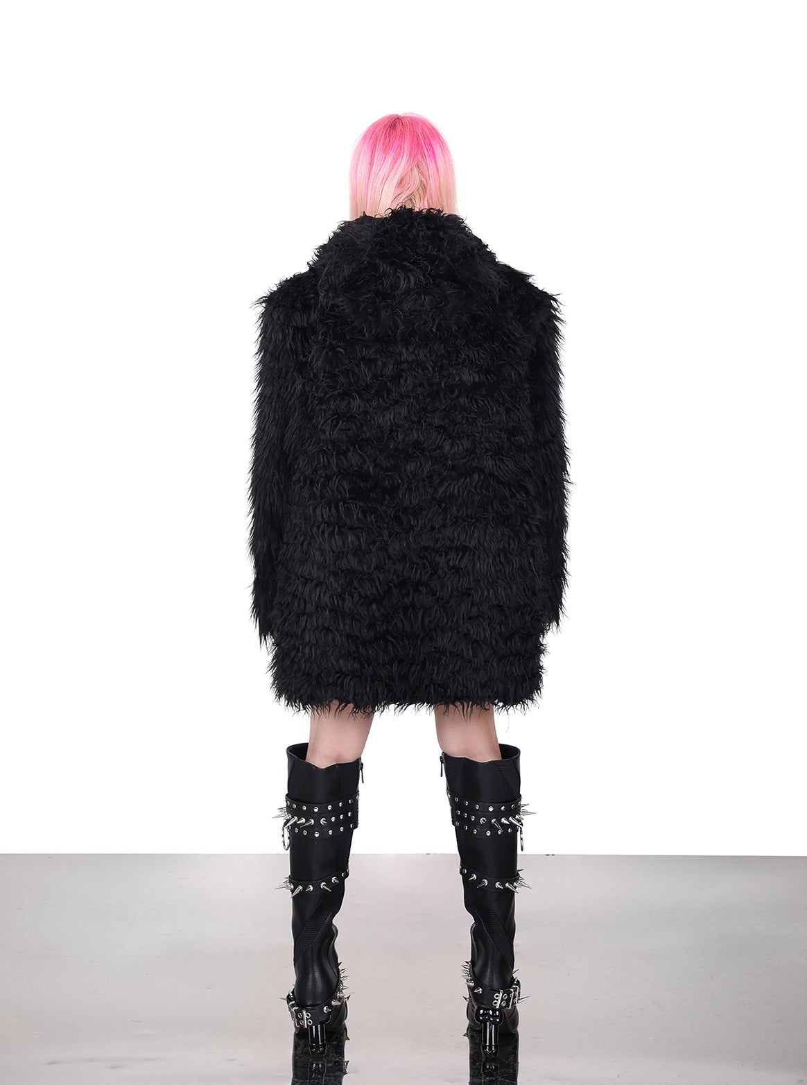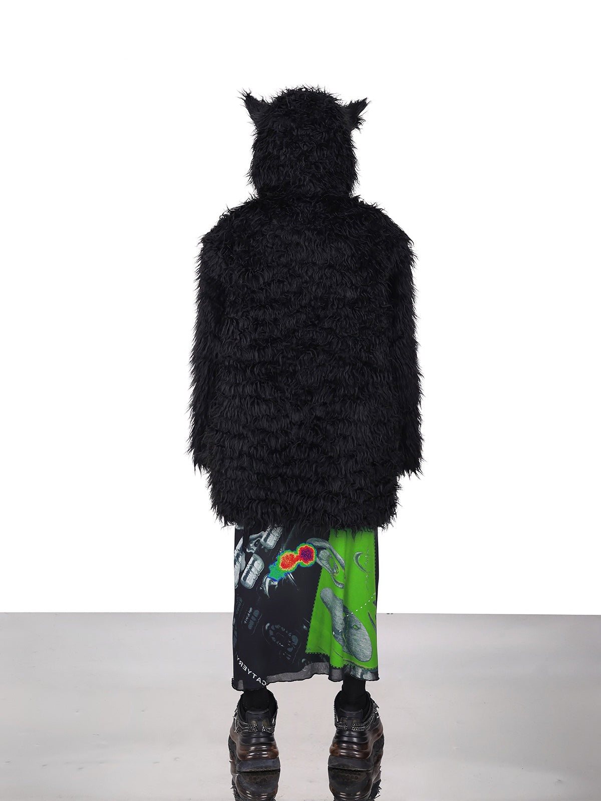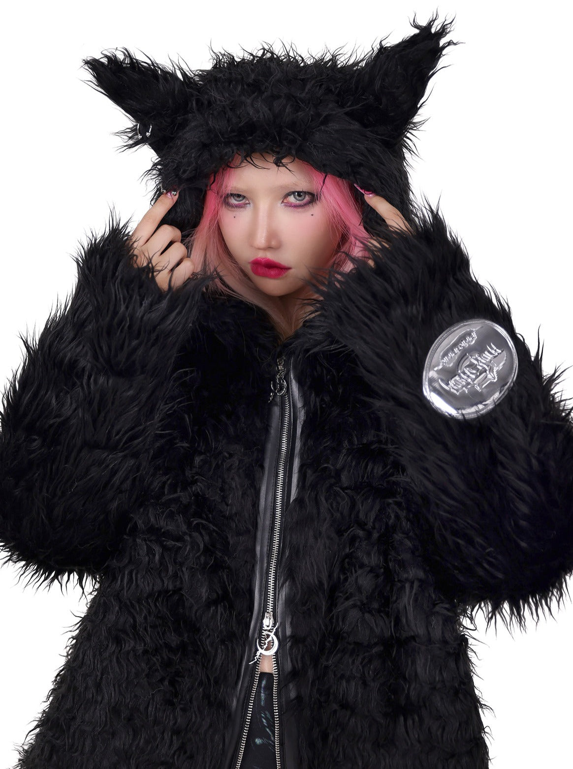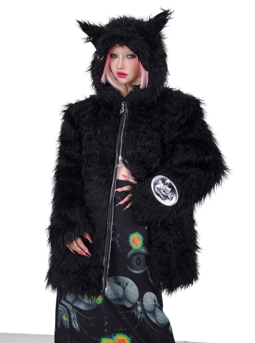 Striking oversized jacket in plush black faux fur. Features an attached hood with large cat ears for a playful. animalistic touch. Full-length silver zipper closure. Shaggy texture creates a wild. dramatic look. Small branded patch on left sleeve. Mid-thigh length offers versatile styling options.Â