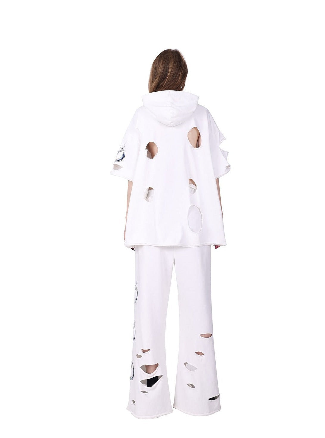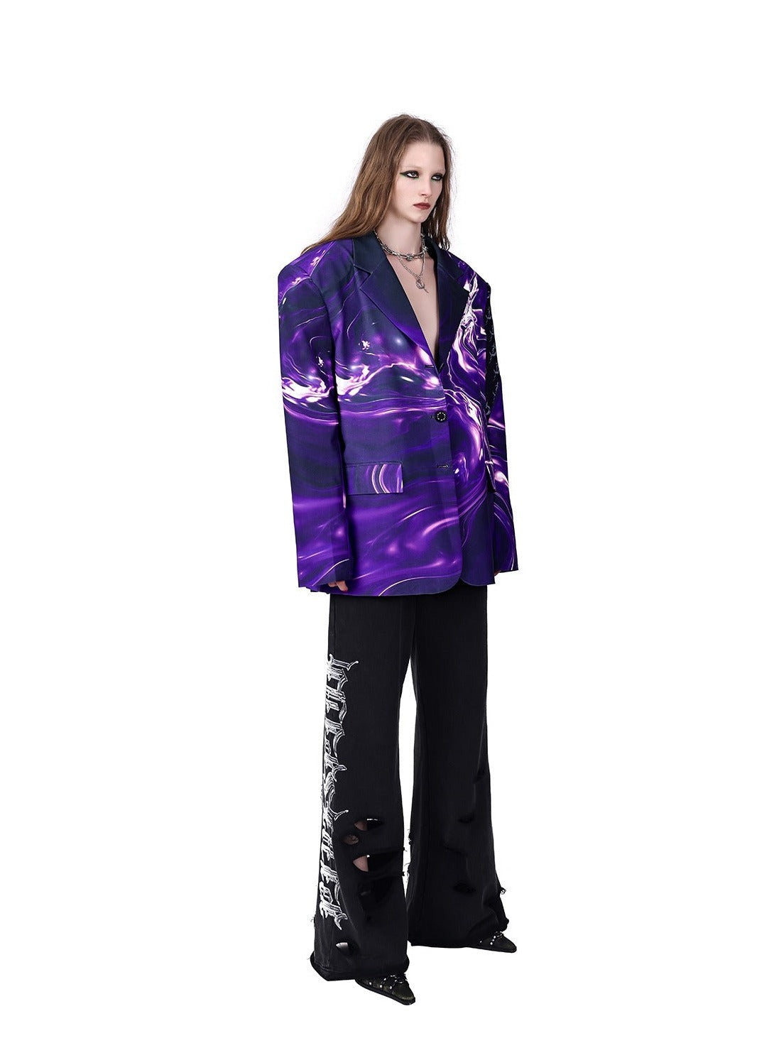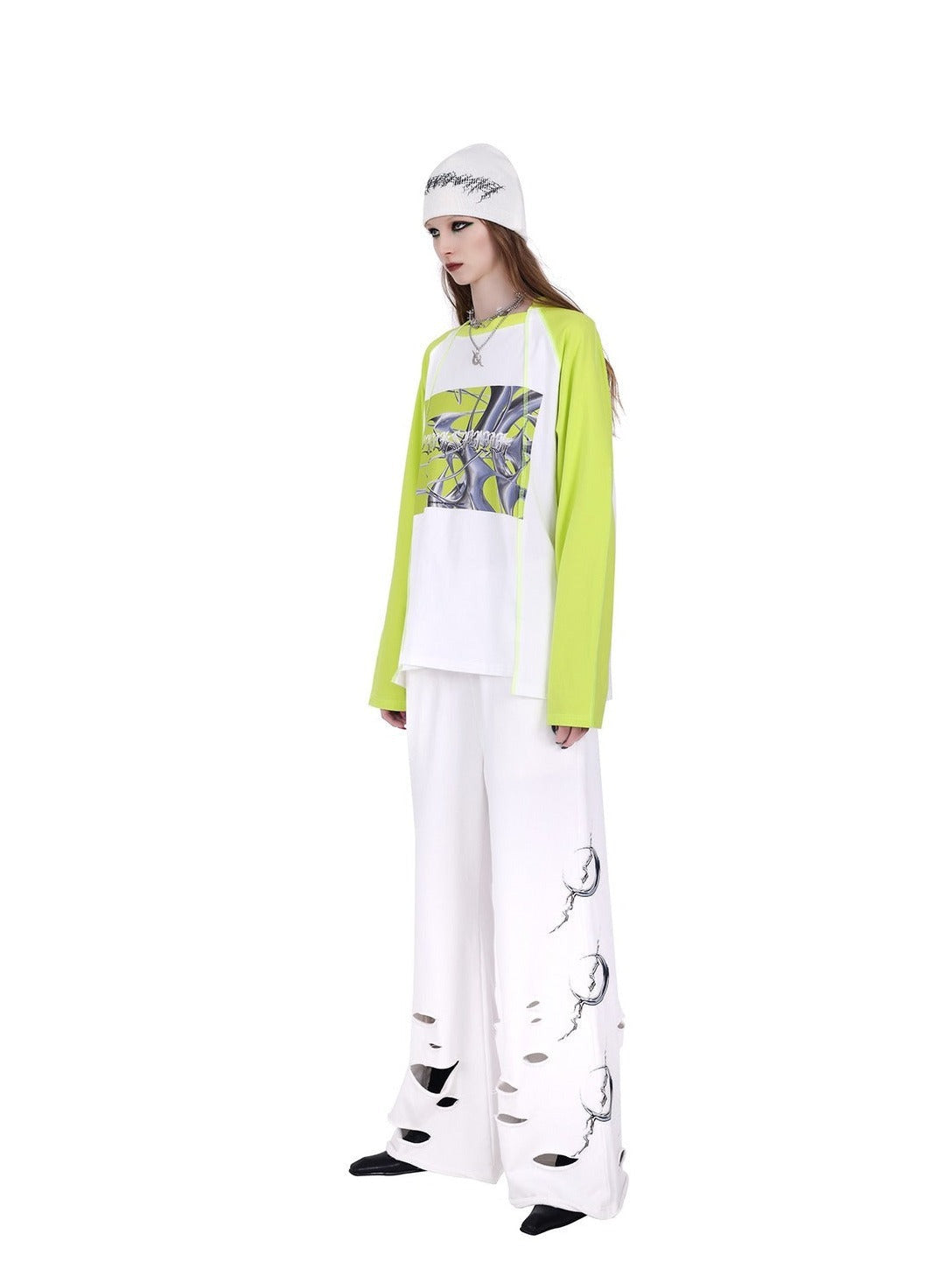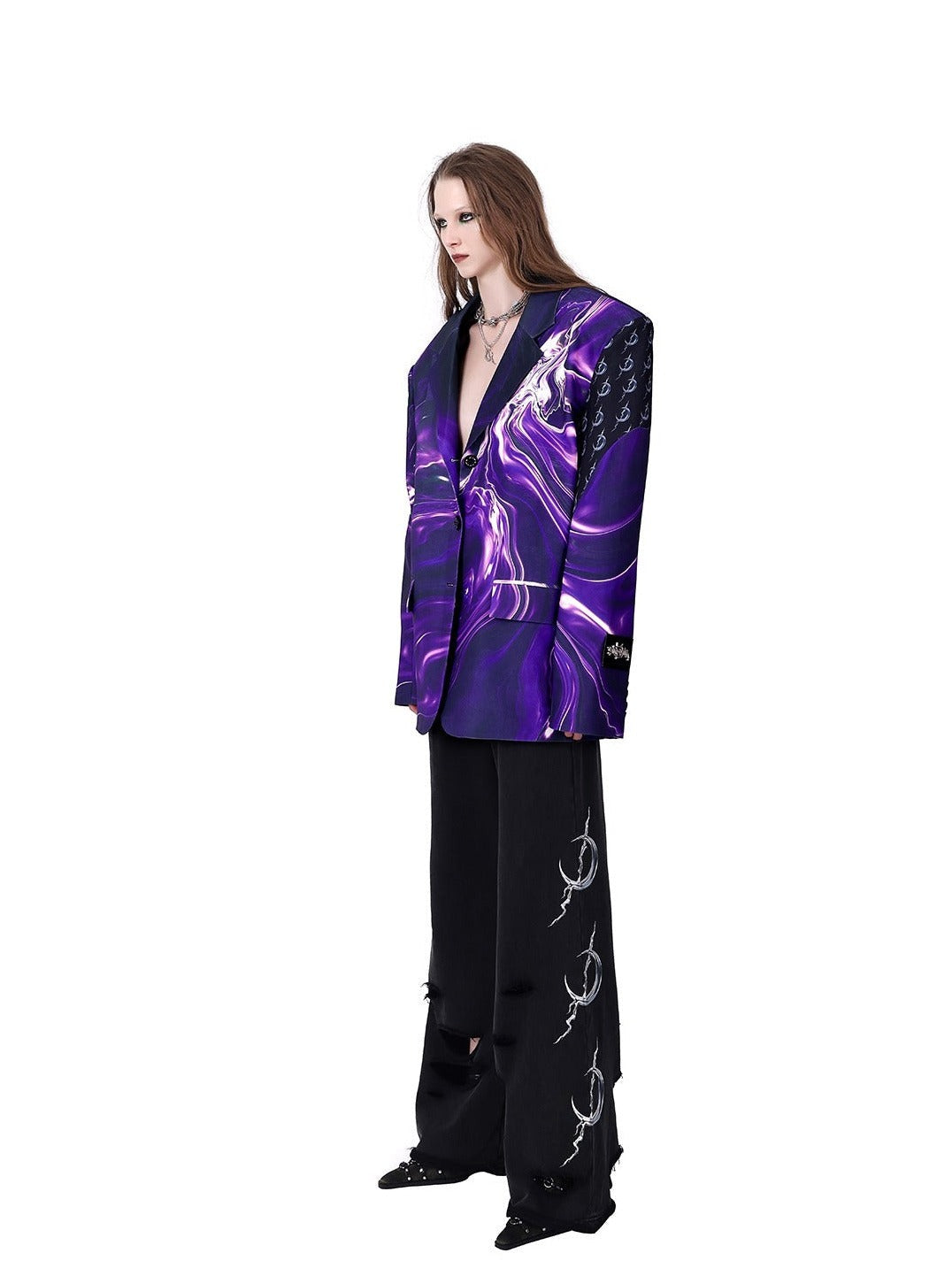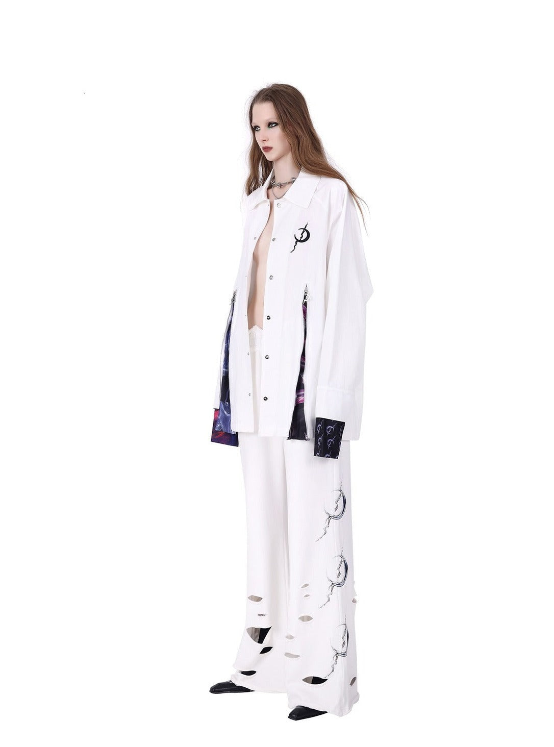Edgy wide-leg pants in solid black with a dramatic silhouette. Features a high-waisted design with a ruffled. elastic waistband for comfort. The legs flare out generously. creating a flowing effect. Distinctive white graphic designs. resembling stylized thorns or claw marks. adorn the outer sides of both legs.Â
