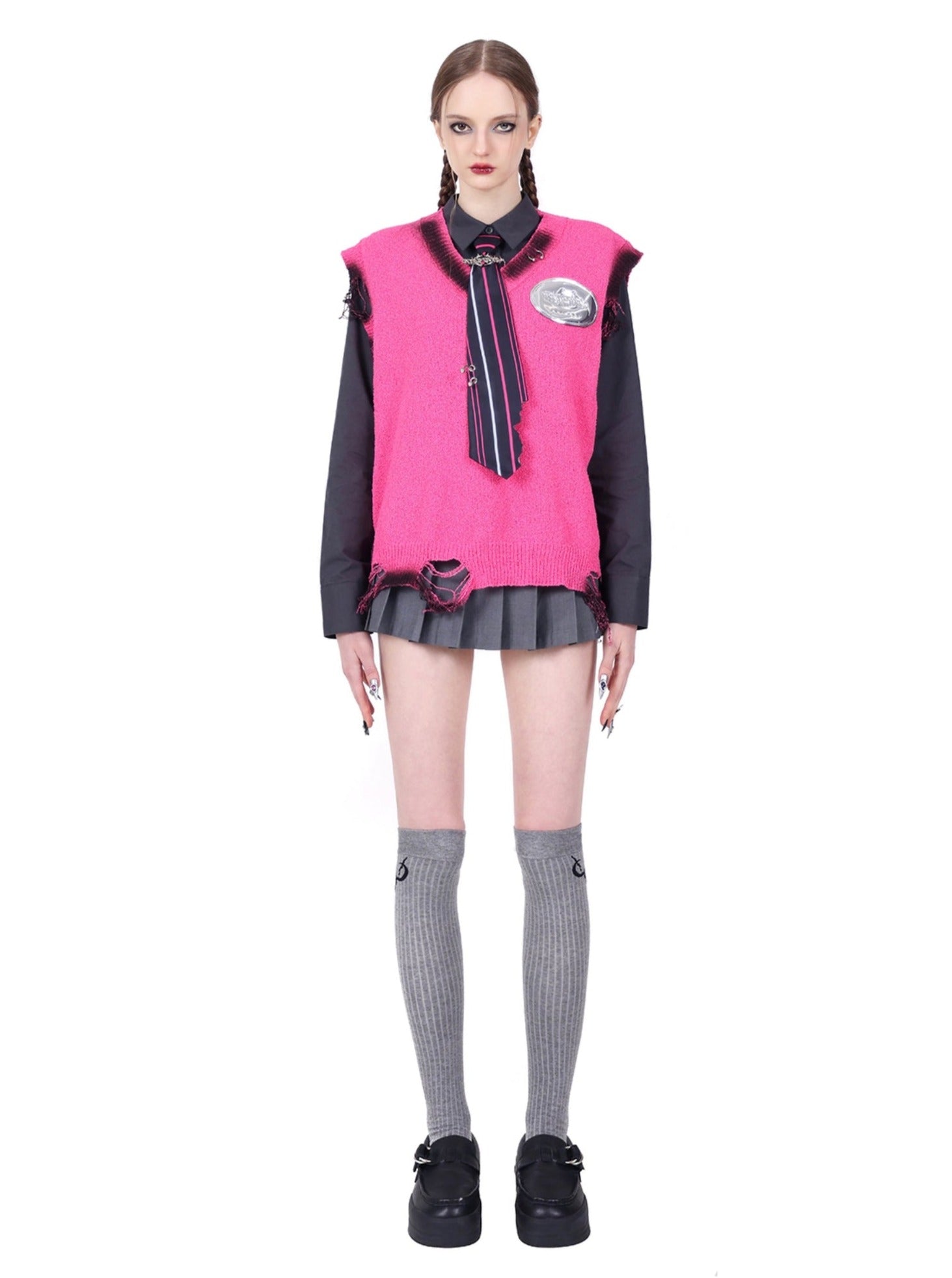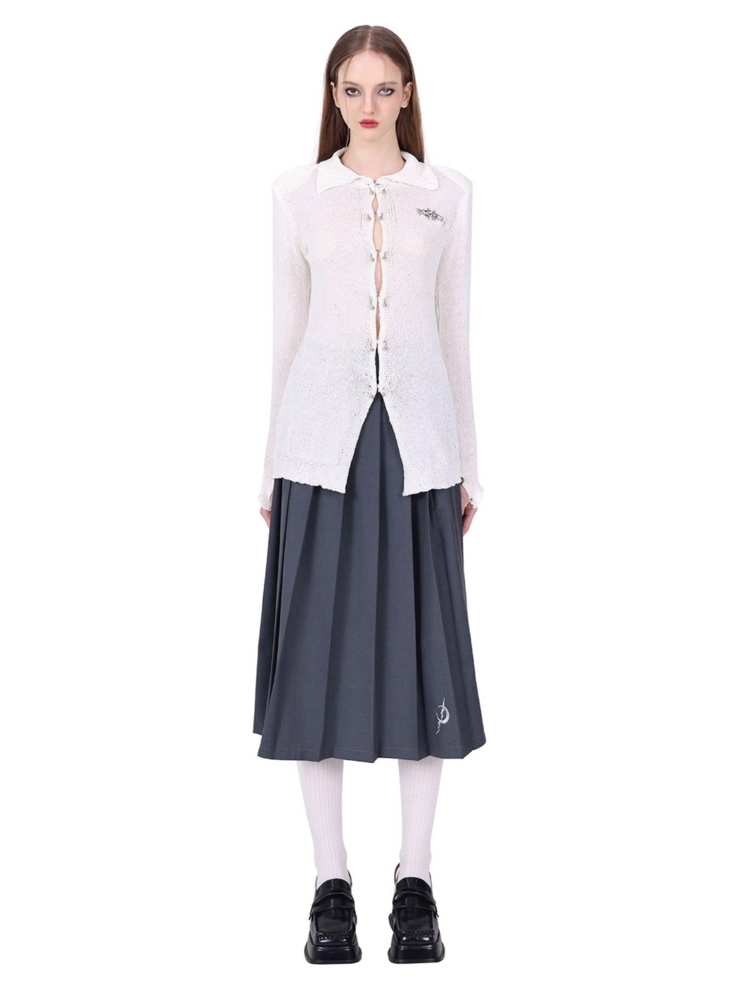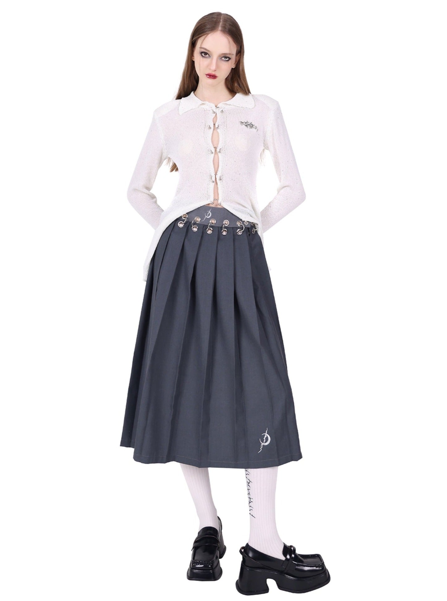 Elegant tiered pleated skirt in a deep charcoal gray. Features a unique two-layer design with a shorter pleated overlay atop a longer pleated skirt. Adorned with decorative silver safety pins along the waistband of the upper tier for an edgy touch. Small embroidered brand symbols on the lower tier and hem add subtle detail. High-waisted silhouette with a midi length.Â