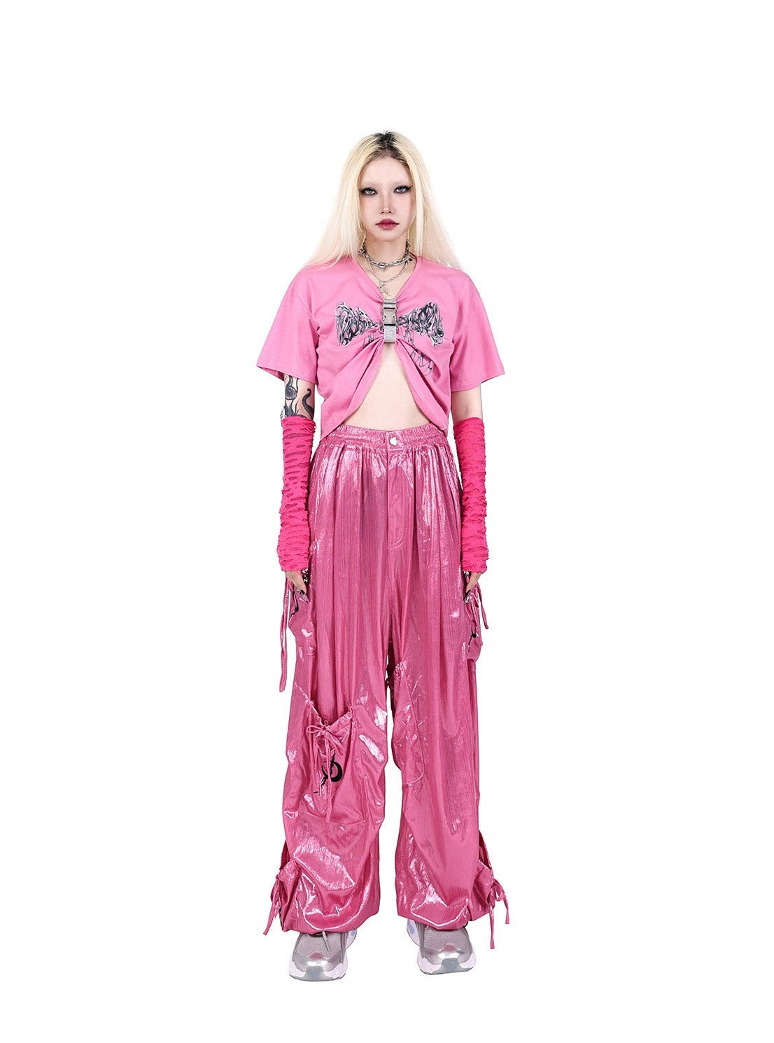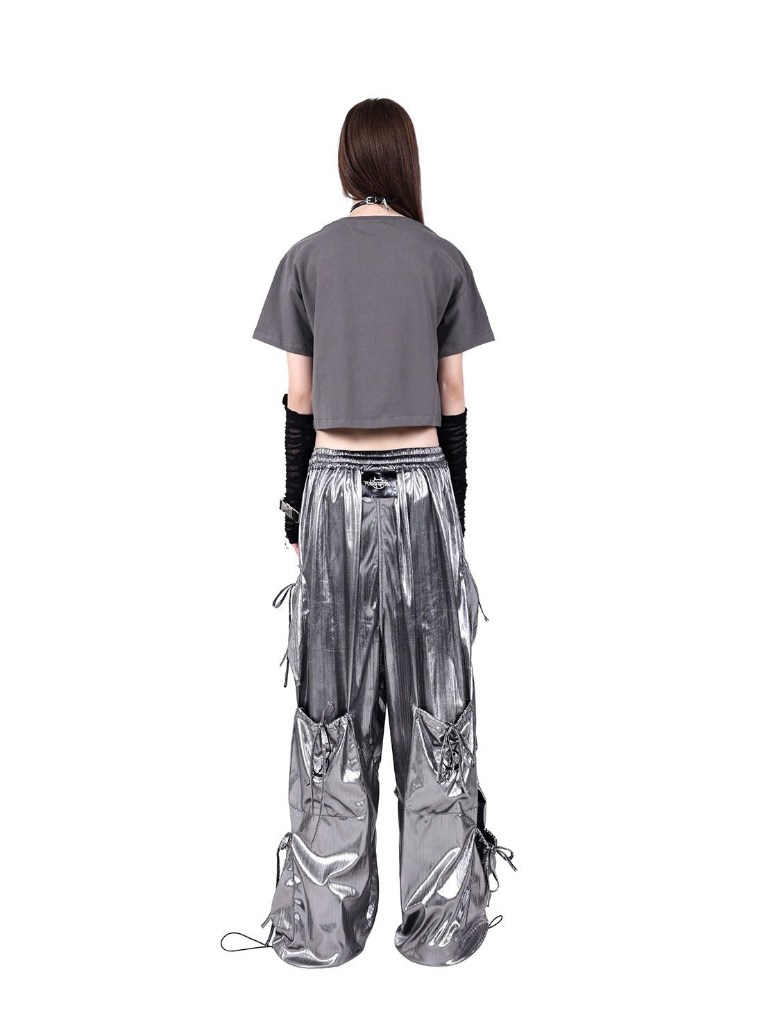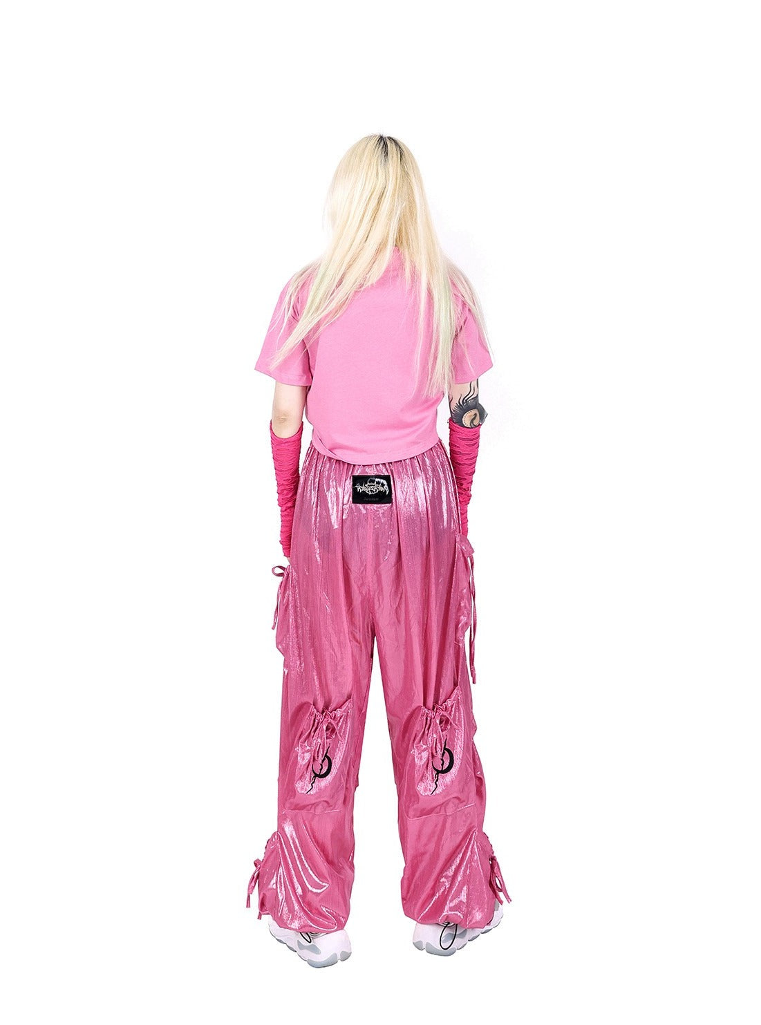Avant-garde wide-leg pants available in shimmering silver or bold hot pink metallic fabric. Features an oversized. balloon-like silhouette with a gathered elastic waistband. Multiple large cargo pockets with drawstring closures adorn the legs. adding both functionality and unique texture.Â