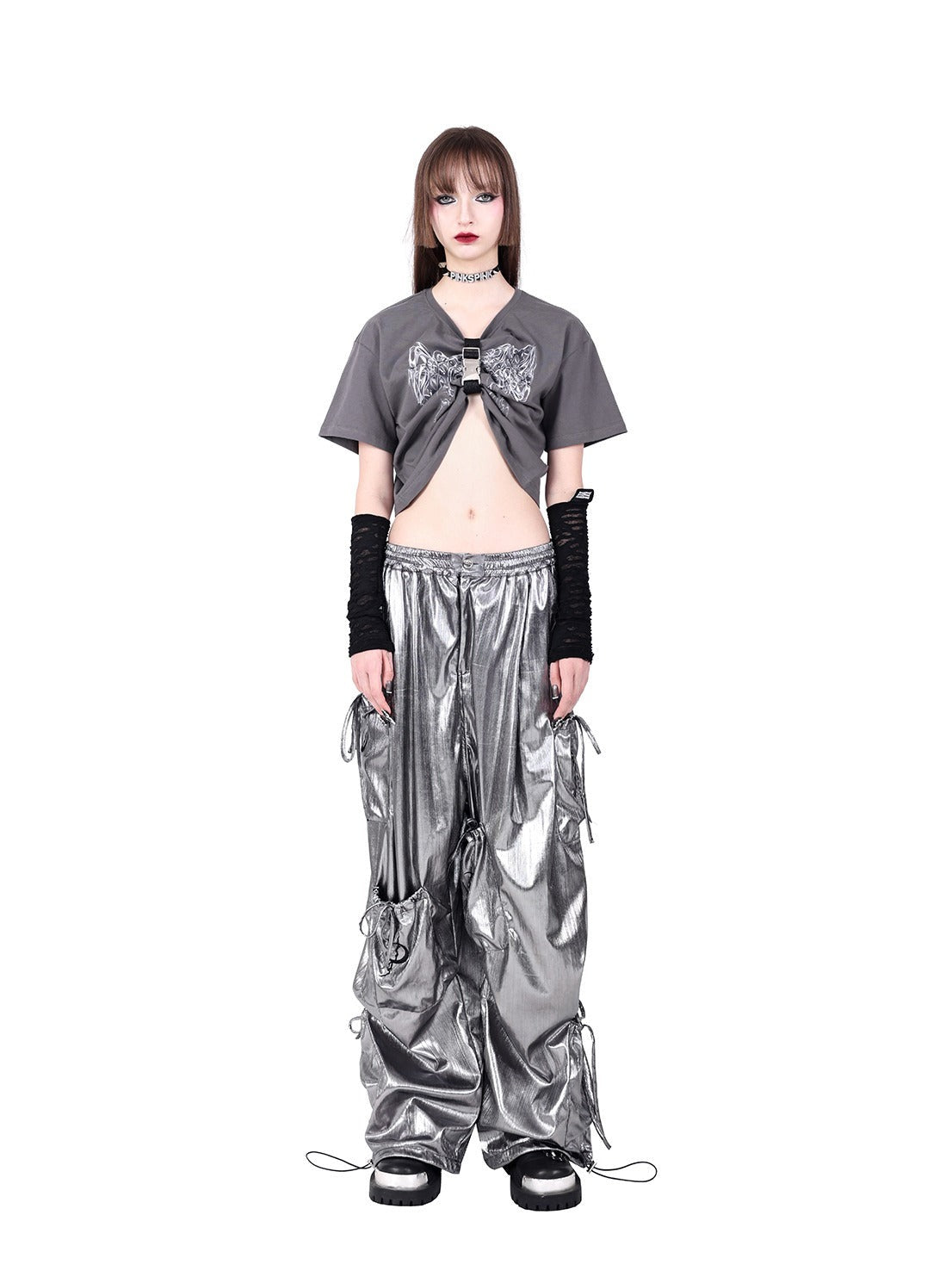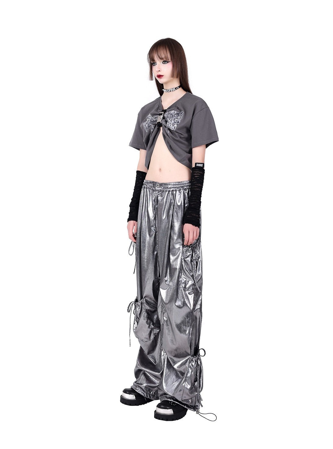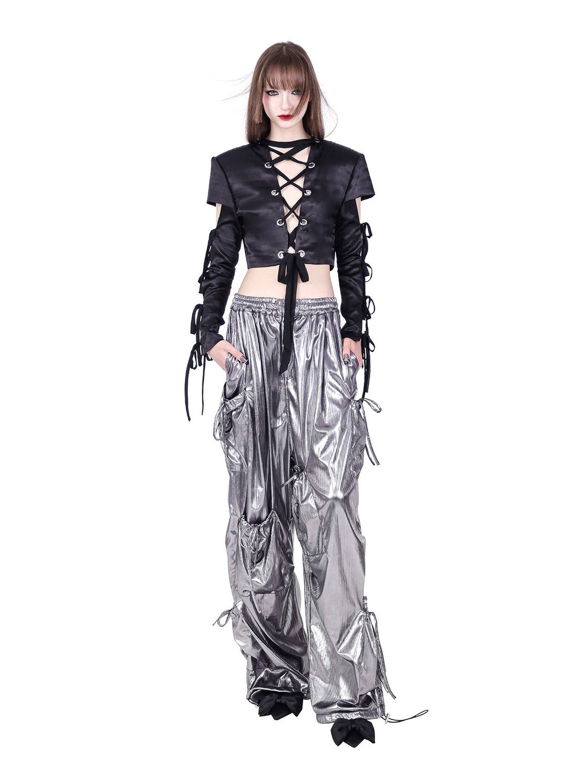 Avant-garde wide-leg pants available in shimmering silver or bold hot pink metallic fabric. Features an oversized. balloon-like silhouette with a gathered elastic waistband. Multiple large cargo pockets with drawstring closures adorn the legs. adding both functionality and unique texture.Â