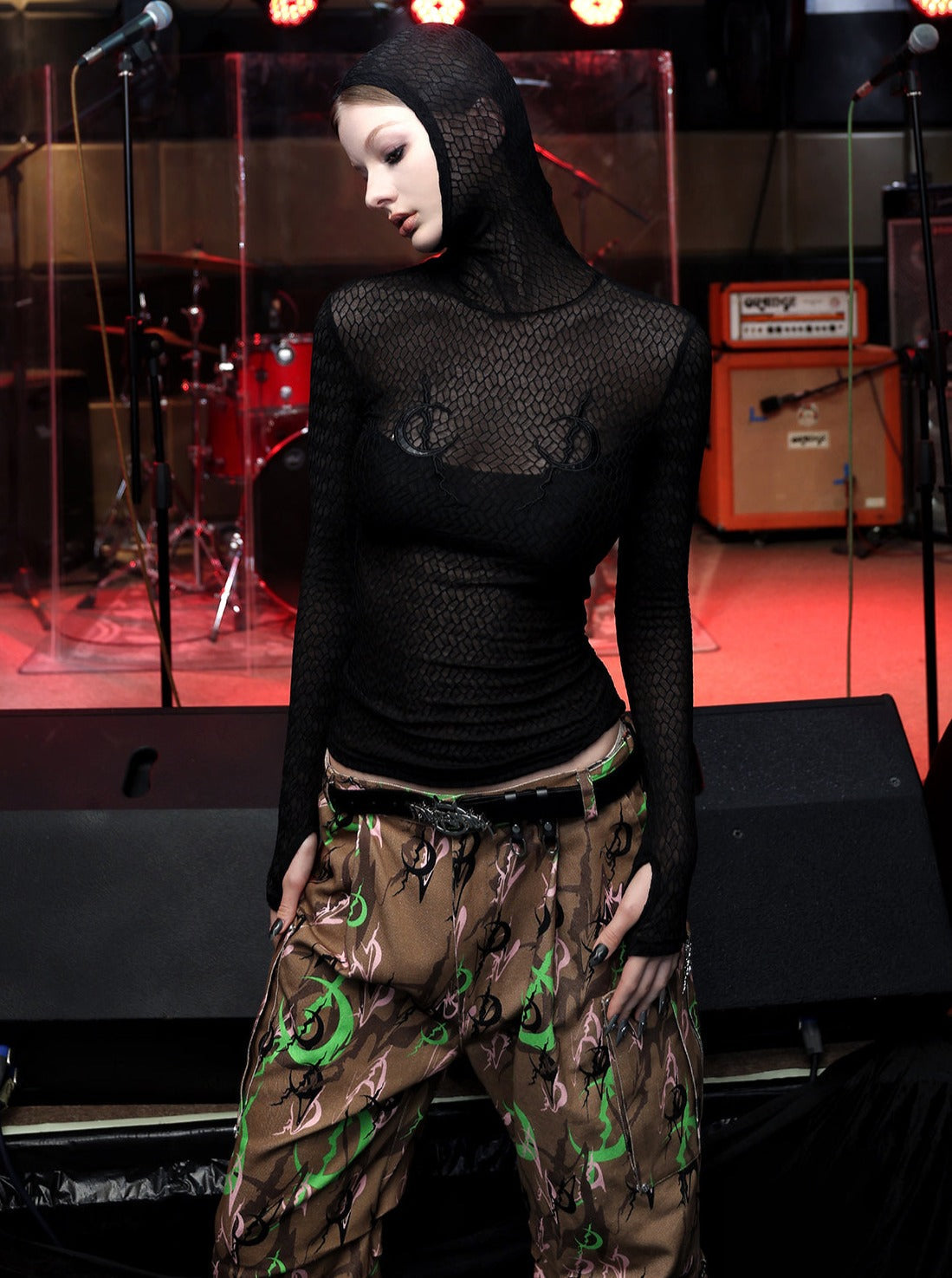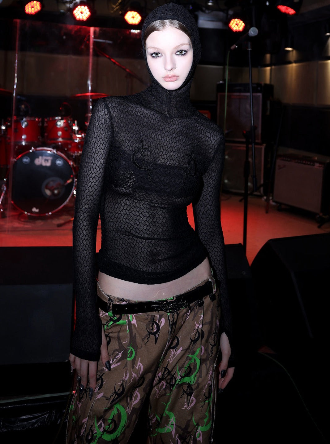 Avant-garde white top with integrated balaclava-style hood. Features a textured. stretchy fabric with a subtle pattern throughout. Form-fitting design with long sleeves and a high neck. Adorned with delicate crescent moon embroidery on the chest. The hood frames the face. leaving only the central portion exposed.Â