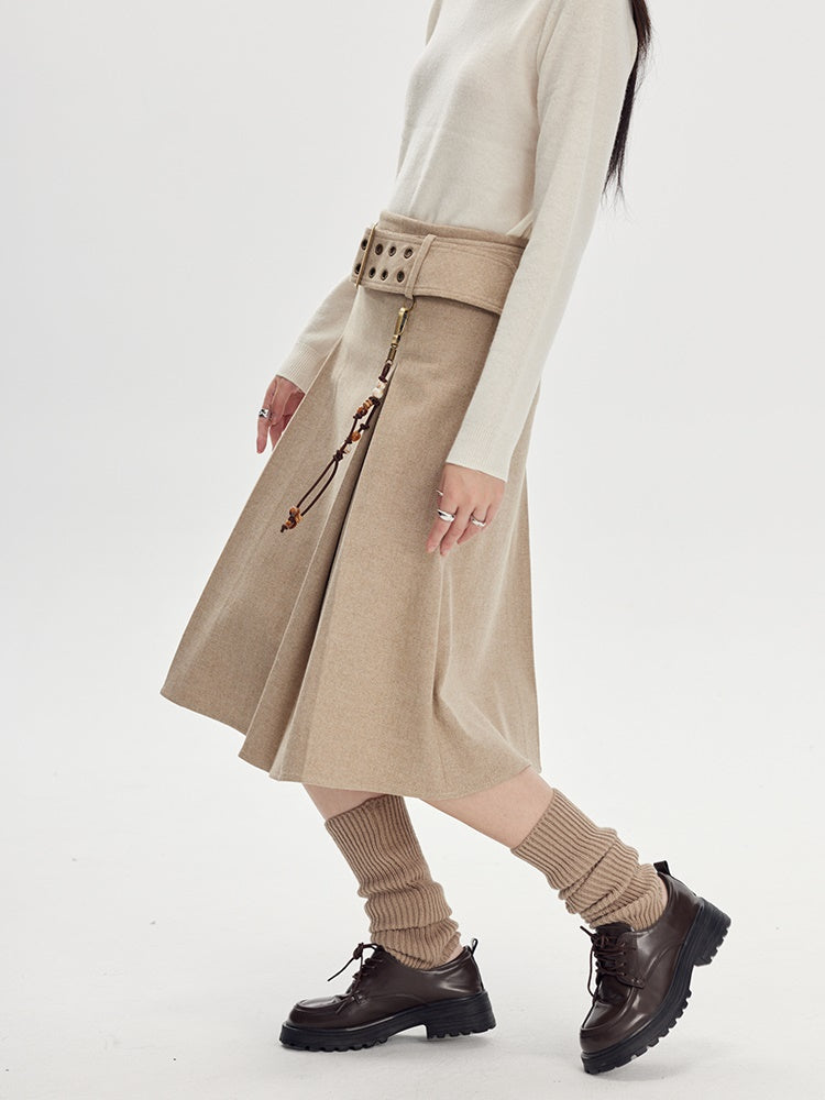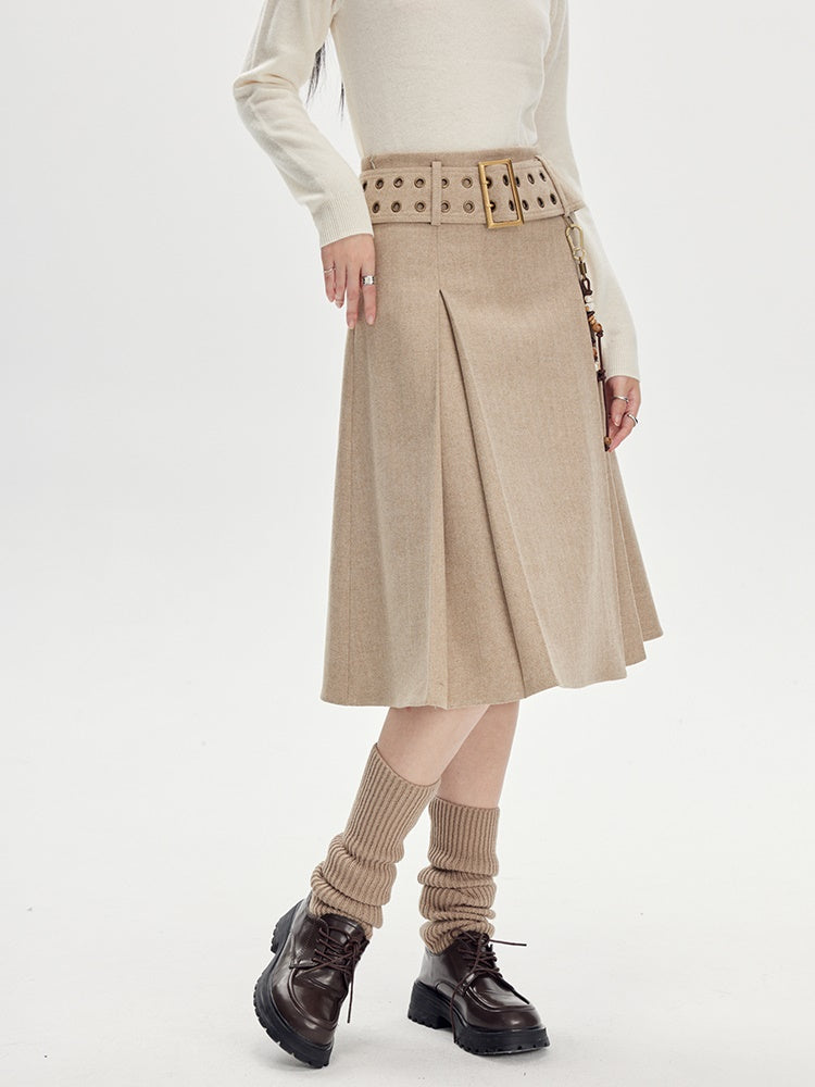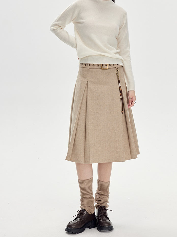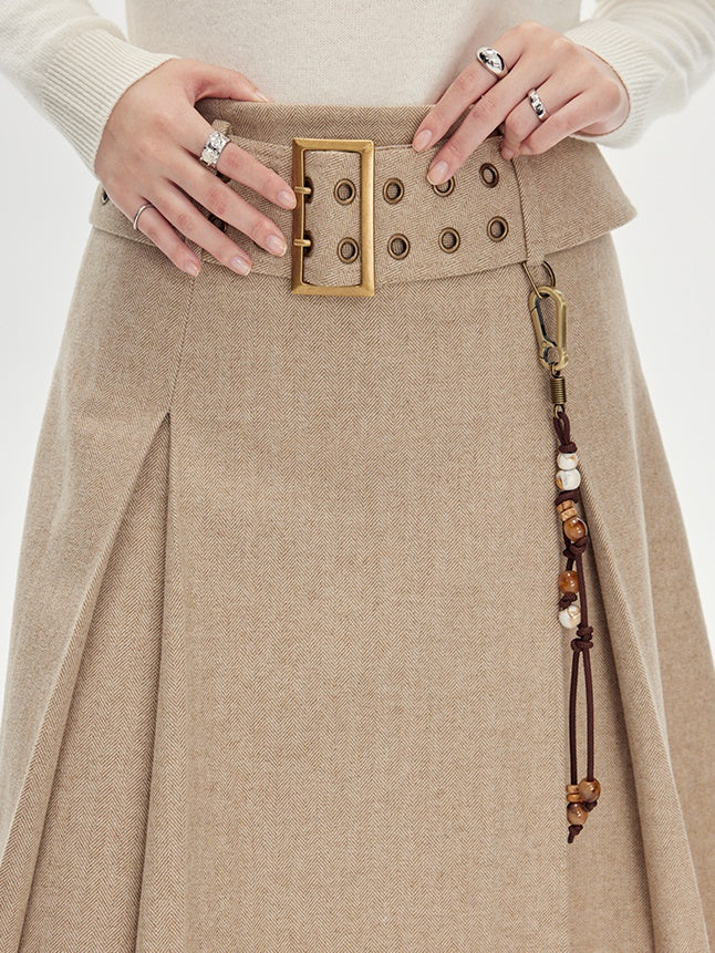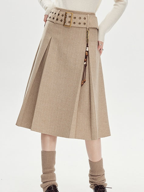 Beige Pleated Midi Skirt With Wide Belt - Wool Blend A-Line Winter Skirt