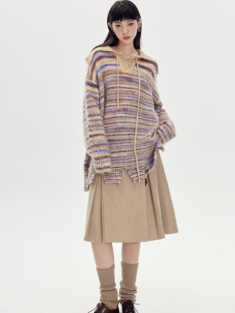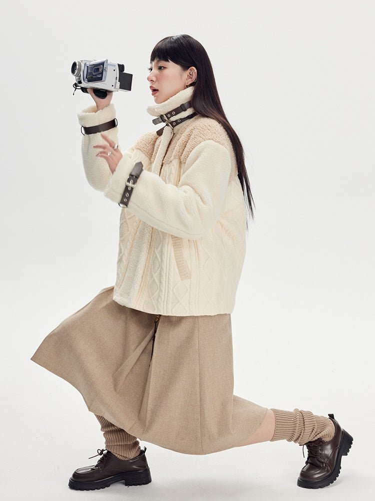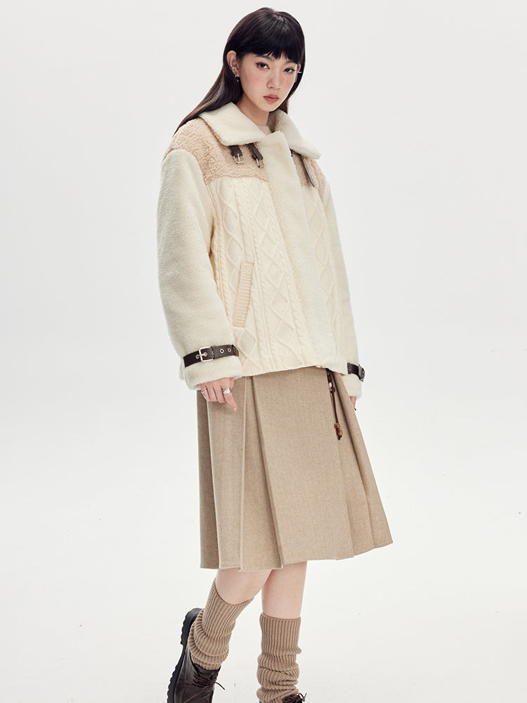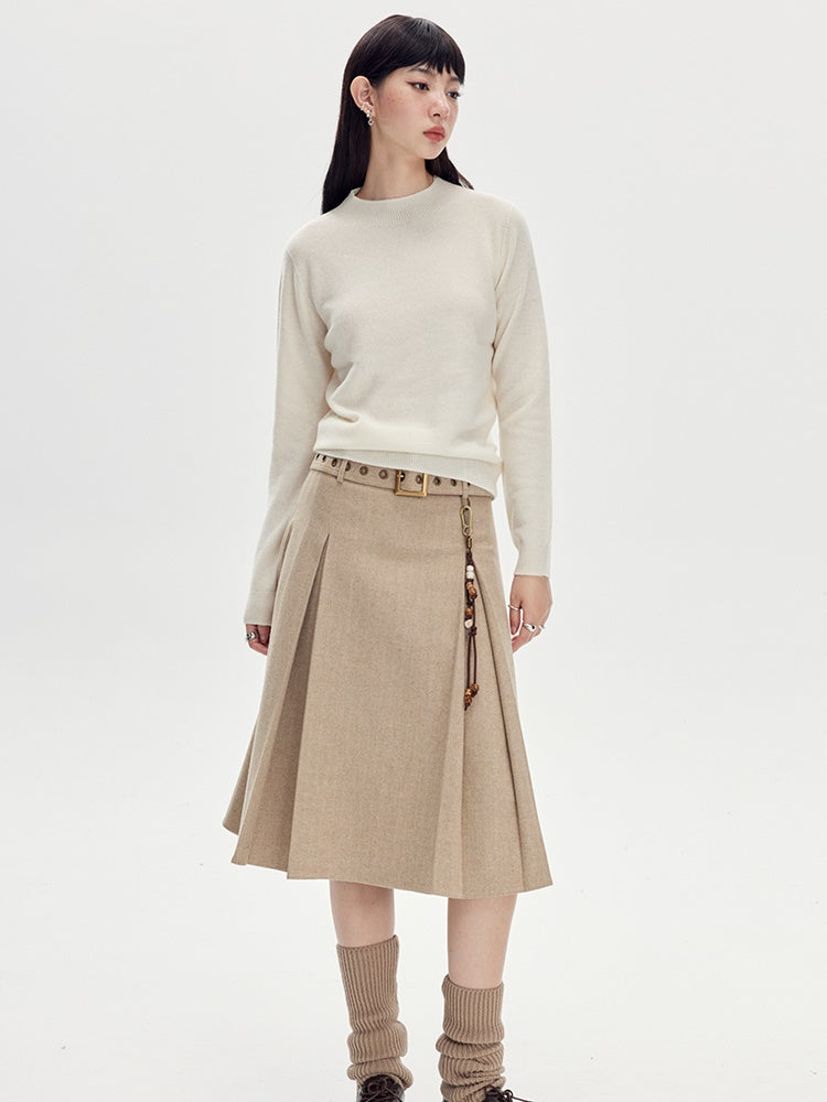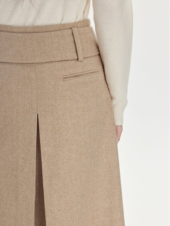 Beige Pleated Midi Skirt With Wide Belt - Wool Blend A-Line Winter Skirt