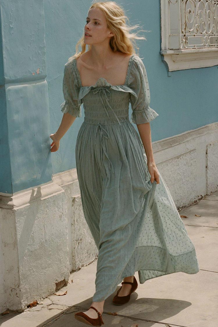 Flowy midi dresses work perfectly for your summer-to-fall transition. This polka dot ruffle square neck smocked midi dress in the shade of sage green brings instant romance for women. Designed with a square neckline around with flattering flounce. a shirred bodice with a drawstring tie at waist. short sleeves with ruffled cuffs. an A-line silhouette with lining inside. cotton blend fabric with textured dotted pattern. and a mid-length dress cut. this bohemian-inspired boutique midi dress is suited for your next beach vacation. Style it with hoop earrings and your go-to sandals for an ethereal outfit.