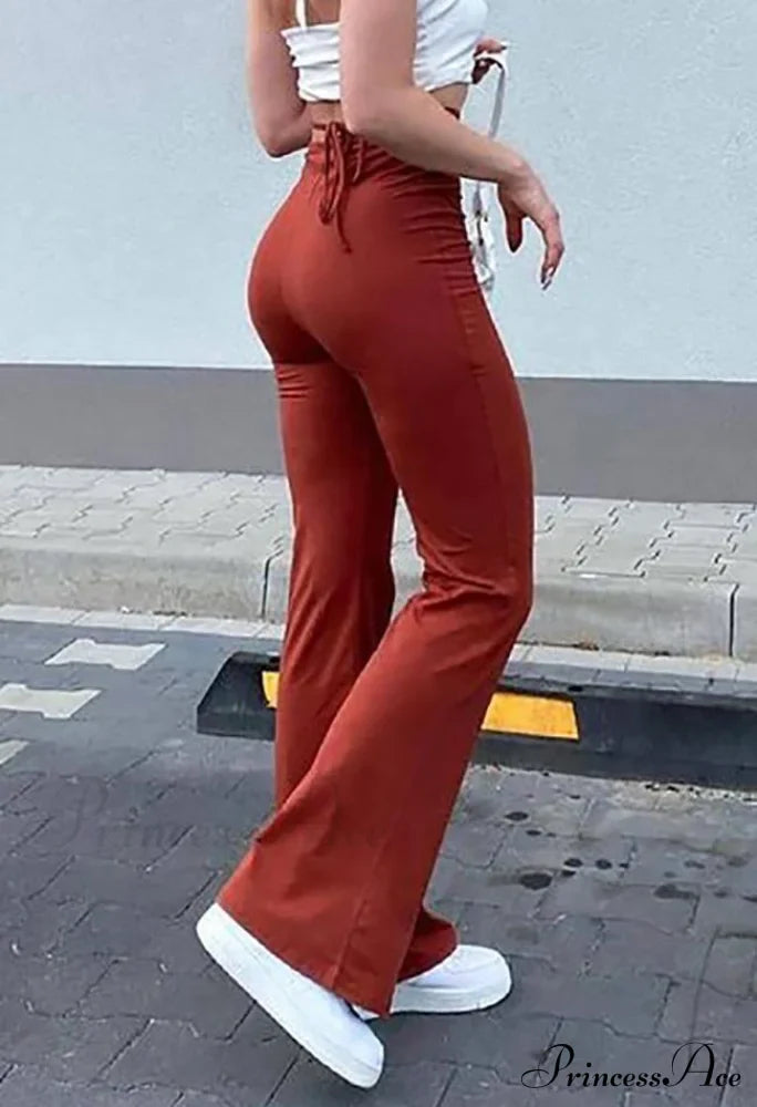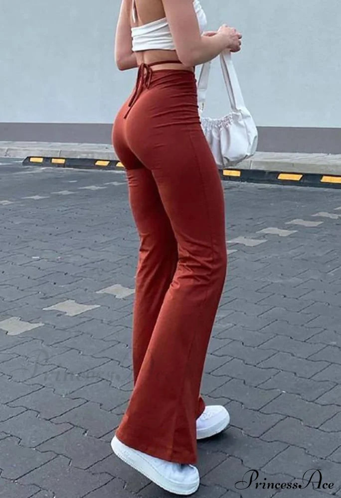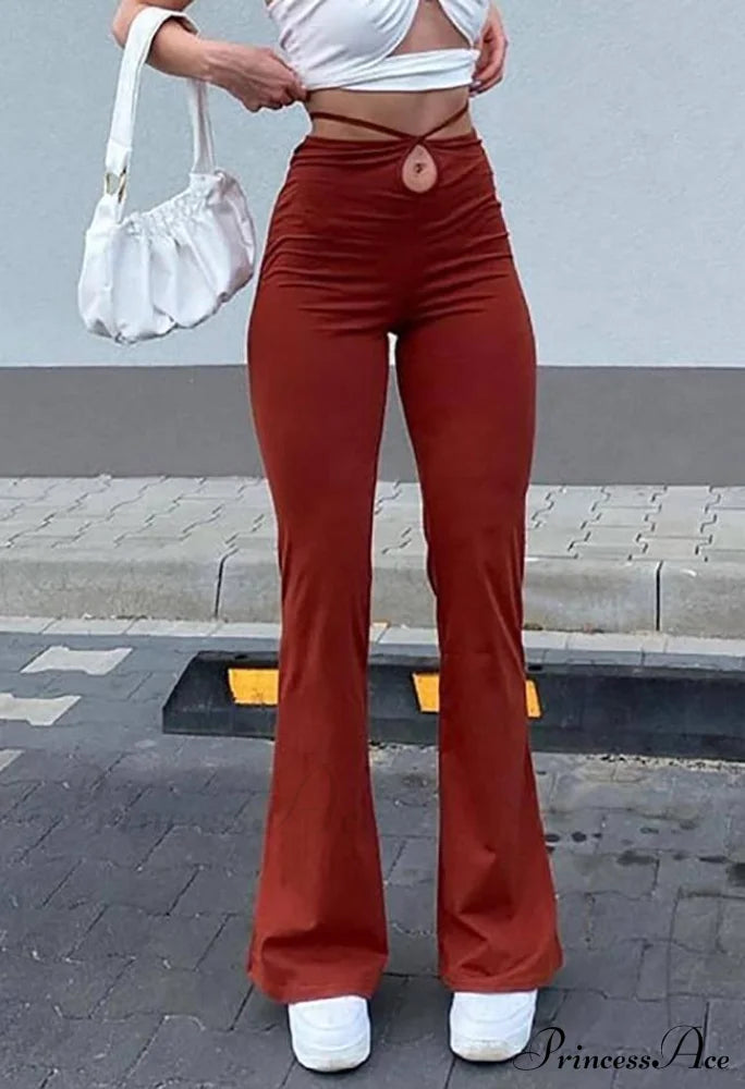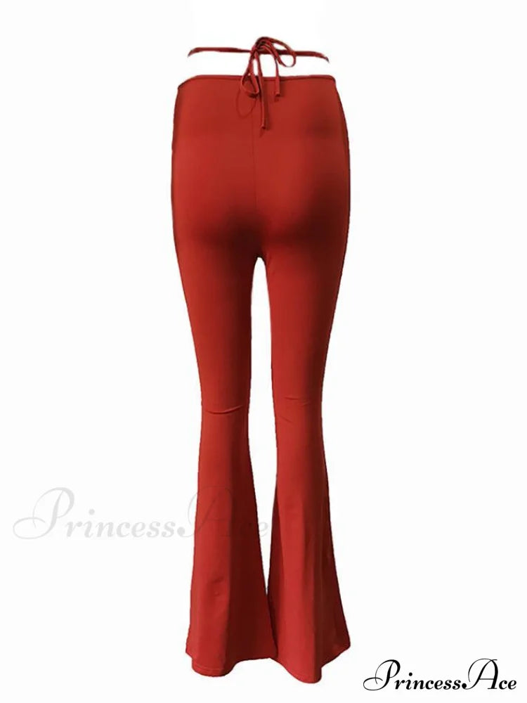 Design: High Rise Waistline. Adjustable Tie Strap At Waistband. Slim Flare Leg Fit