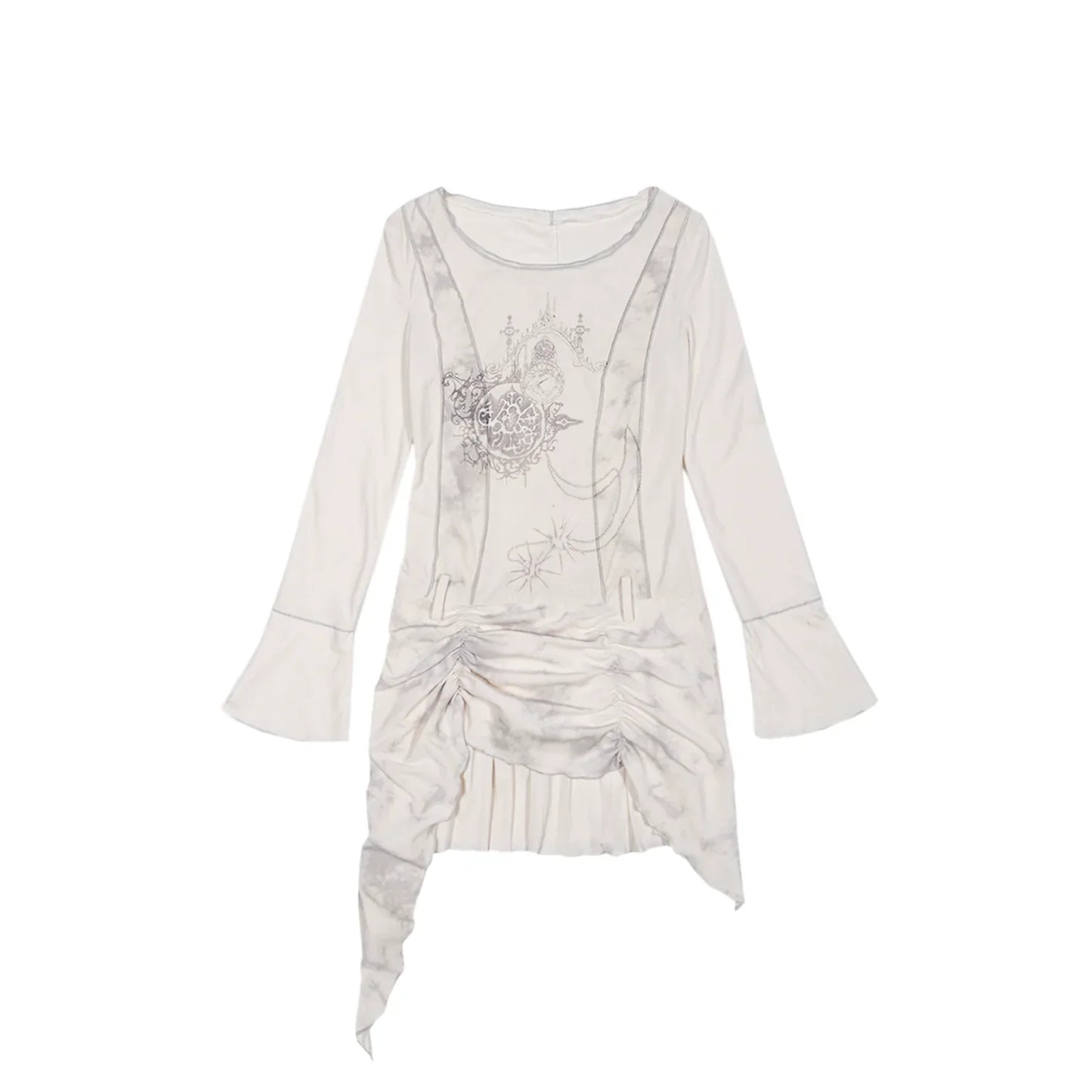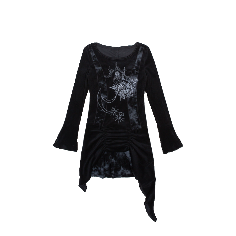 Enchanting tunic dress available in two contrasting colors: deep black and ethereal white. Features a scoop neckline and long bell sleeves for a romantic silhouette. The focal point is an intricate graphic print on the front. showcasing mystical elements like a crescent moon. stars. and an ornate central mandala design.Â