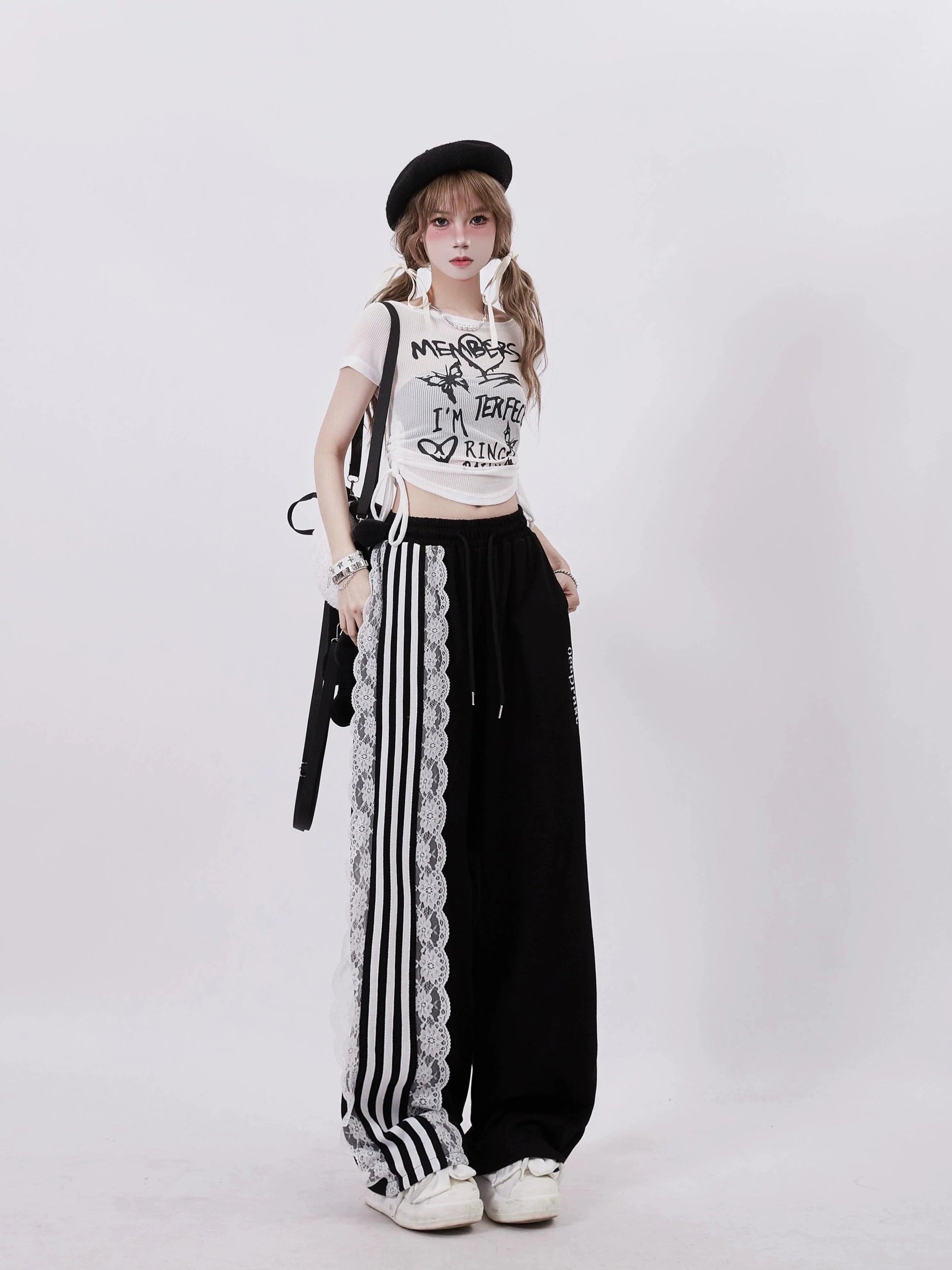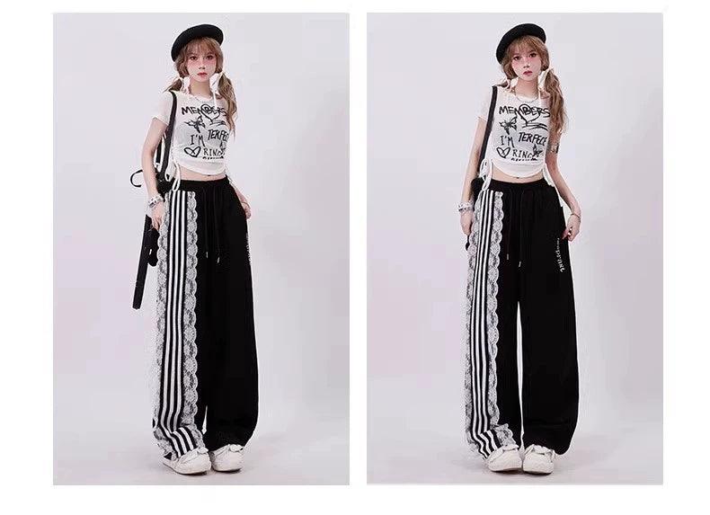 Rayohopp Women'S Wide-Leg Sweatpants - Gray Drawstring Lounge Pants With Lace And Striped Side Panel