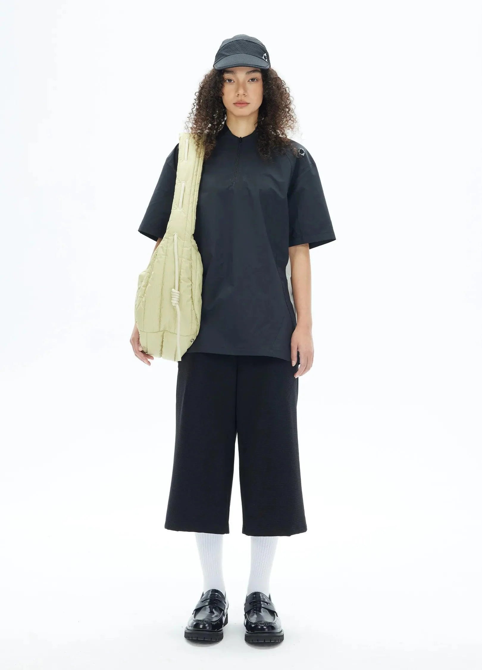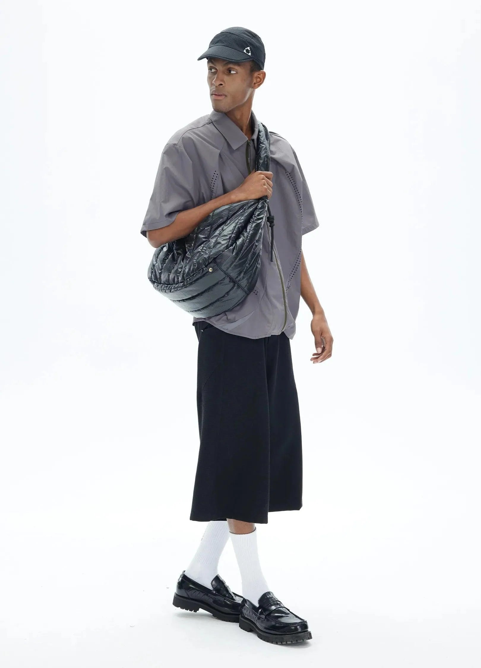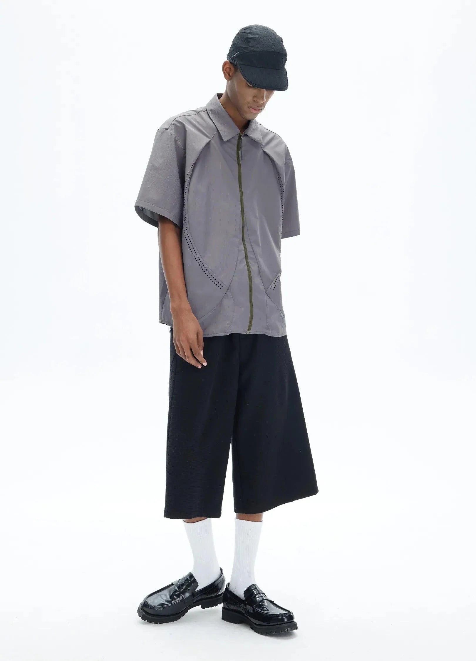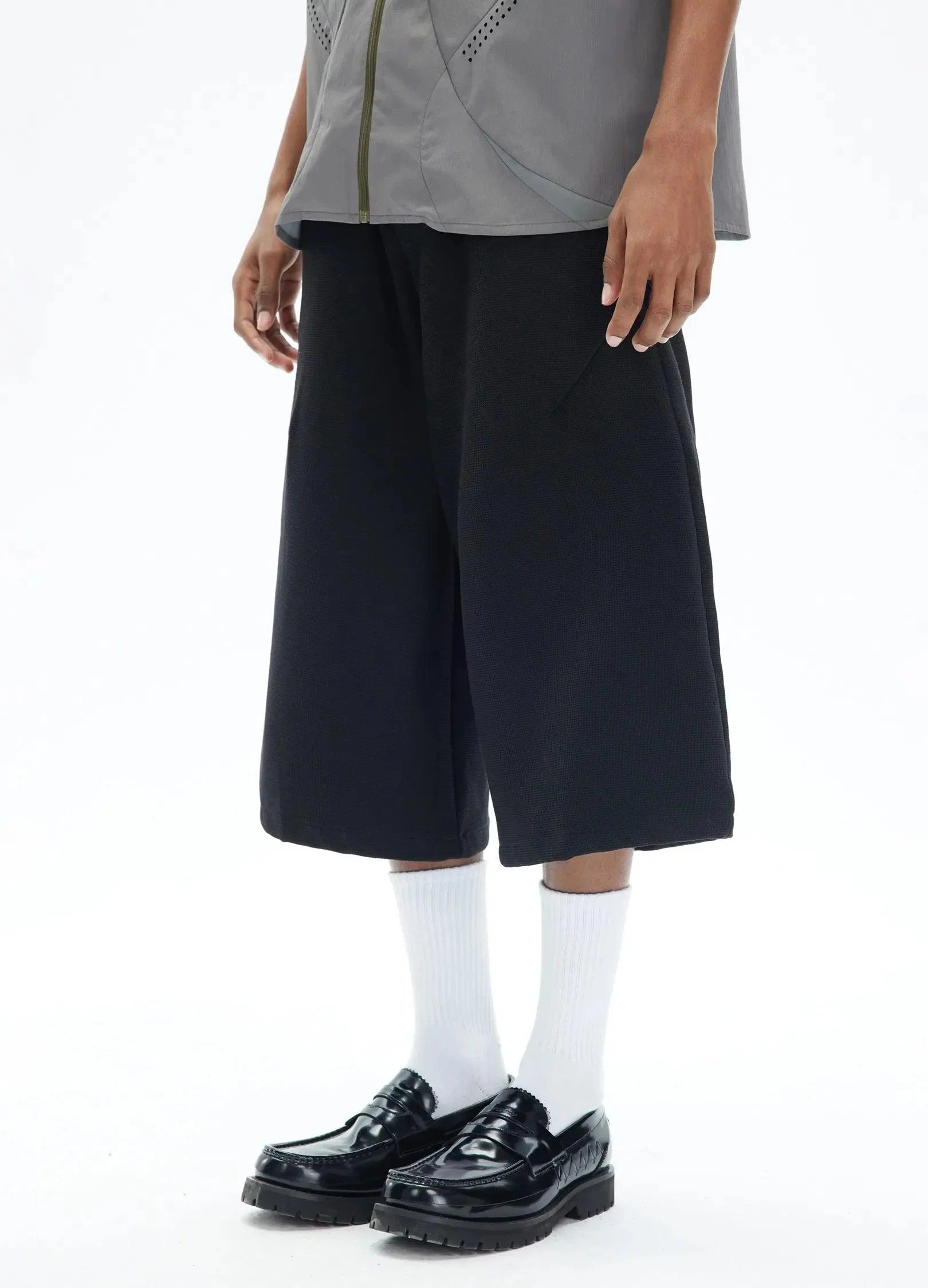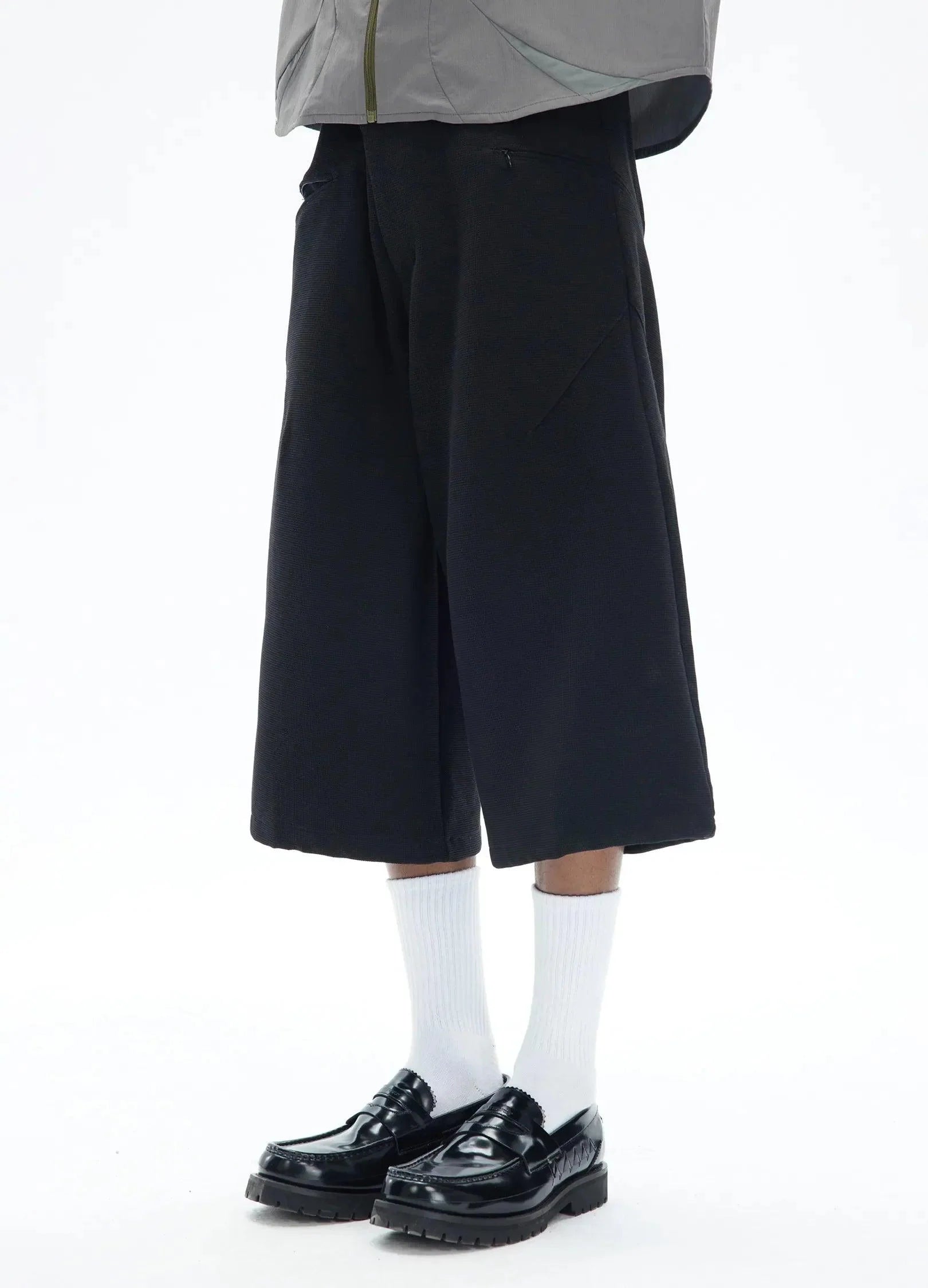Relaxed Fit Cropped Shorts �perfect for a sleek. casual look. These shorts feature a cropped. straight fit with a wide leg design. mid to low rise. and non-stretchy material. Enhanced with additional seams. ribbed waistband on the back. and three-button closure. Practical with two front zipper pockets. Made with a durable polyester. rayon. and nylon blend. Available in black. Male model (185cm) wears size Large.