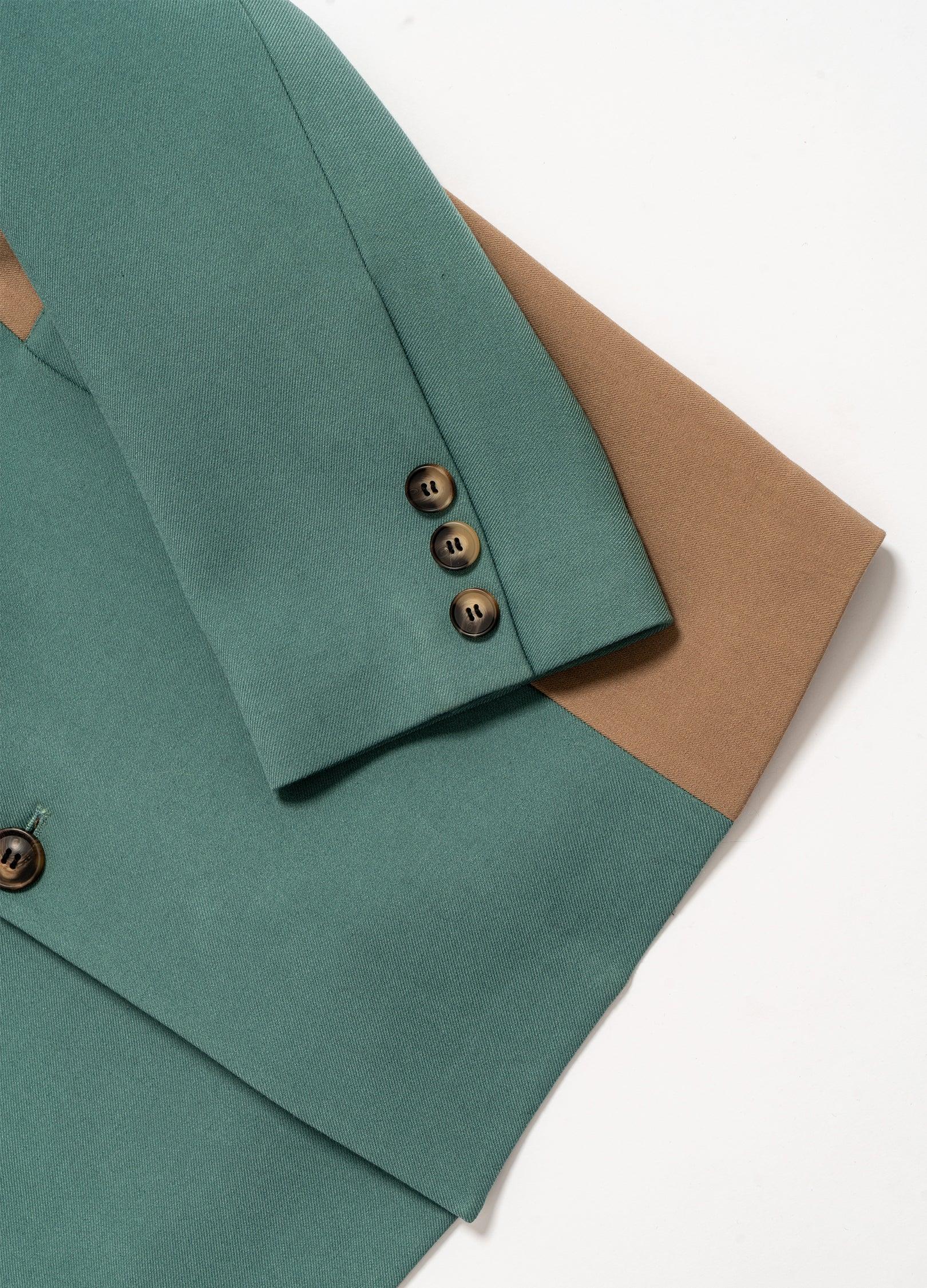 Step back in time with our Retro Two-Tone Oversized Jacket. This 80s-inspired blazer features a pointed collar. two single front buttons. and shoulder pads for that classic look. Made from a premium cotton and polyester blend. it fits slightly oversized. ensuring a stylish and comfortable fit. Available in a unique Camel/Teal colorway. this unisex item is perfect for adding a touch of retro flair to any wardrobe.