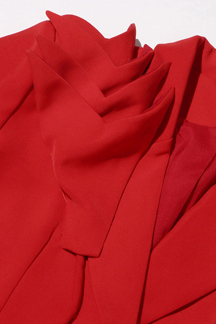 Straight from Yutuku Boutique. our party-ready blazers for women redefine sophistication and glamour. This red-hot jacket makes a bold statement. featuring a dramatic 3D flower applique that adds an artistic touch to its vivid hue. Designed with a lapel collar and structured shoulder pads. this blazer offers a commanding and elegant silhouette. The single-button closure and long sleeves enhance its minimalist look. while the longline. relaxed cut brings a modern edge to classic chic. Flap pockets blend functionality with refined style. making this luxury blazer the perfect choice for any high-profile event.