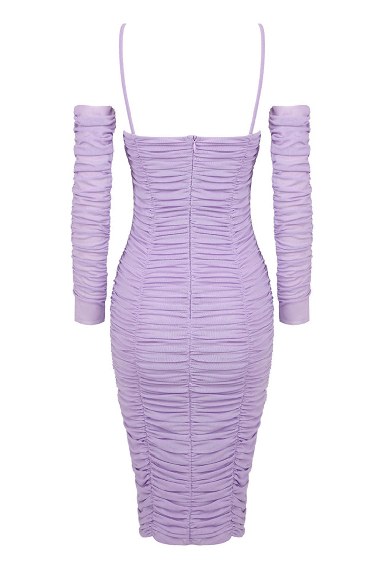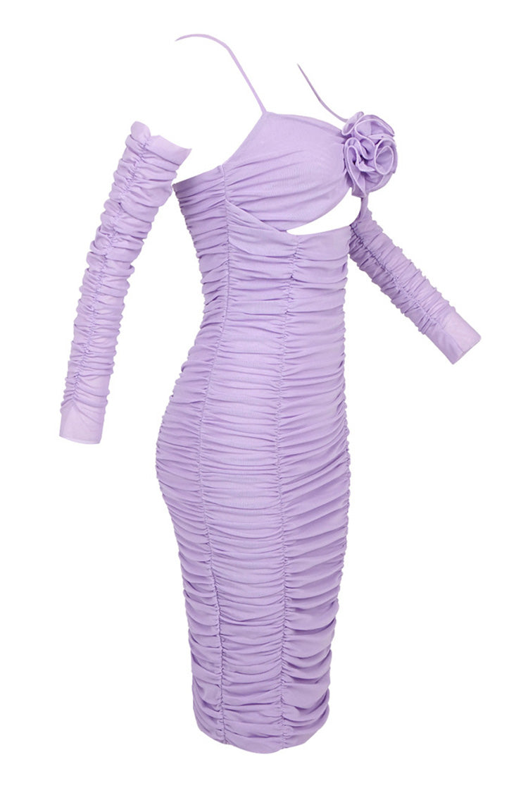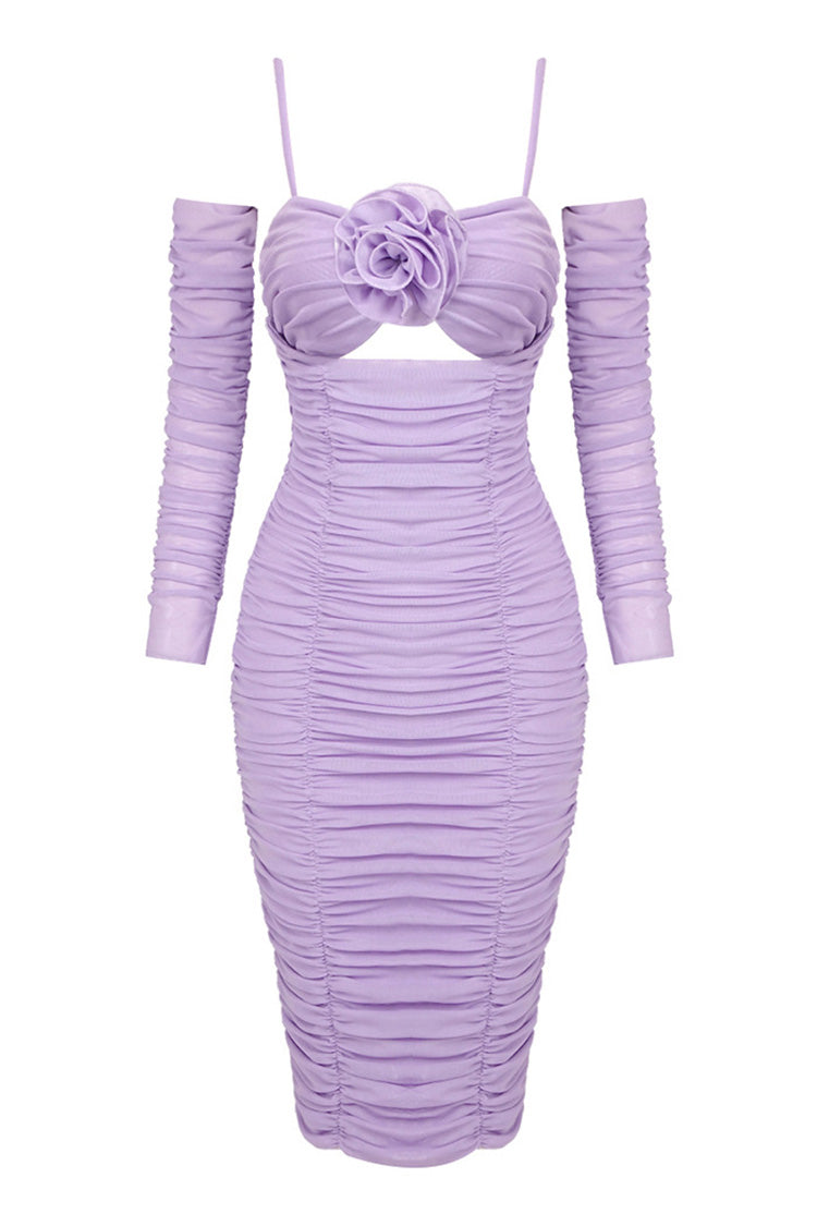 Keep it powerful in lilac with our sexy ruched dresses for French-style women. This boutique-worthy semi-sheer mesh dress features gathered detailing throughout and a dramatic rose corsage accent at the bust. along with a keyhole cut-out. hidden back zipper closure. and mid-length hem. With its detachable long sleeves with off-the-shoulder styling and fixed slender straps. this effortlessly chic slip midi dress is perfect for date nights or special occasions. Whether you're hitting the dance floor or having a night out with the girls. you'll feel fabulous and look fierce in this dreamy flower outfit.