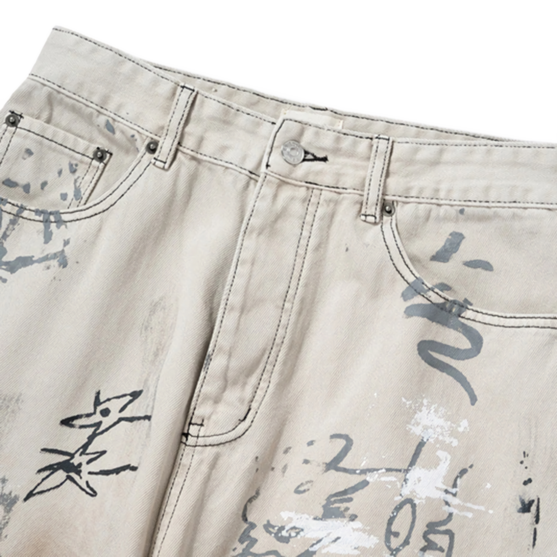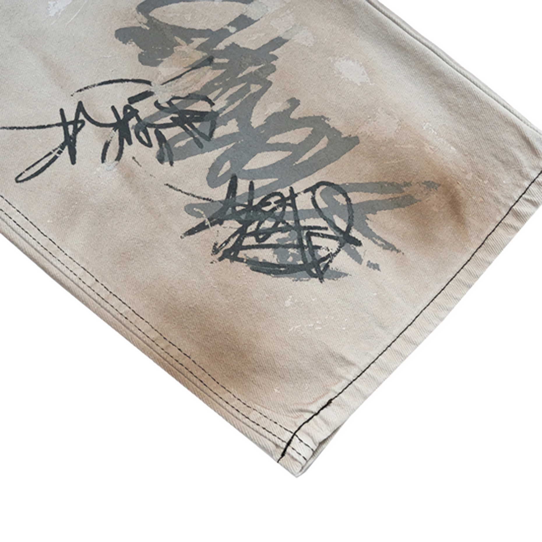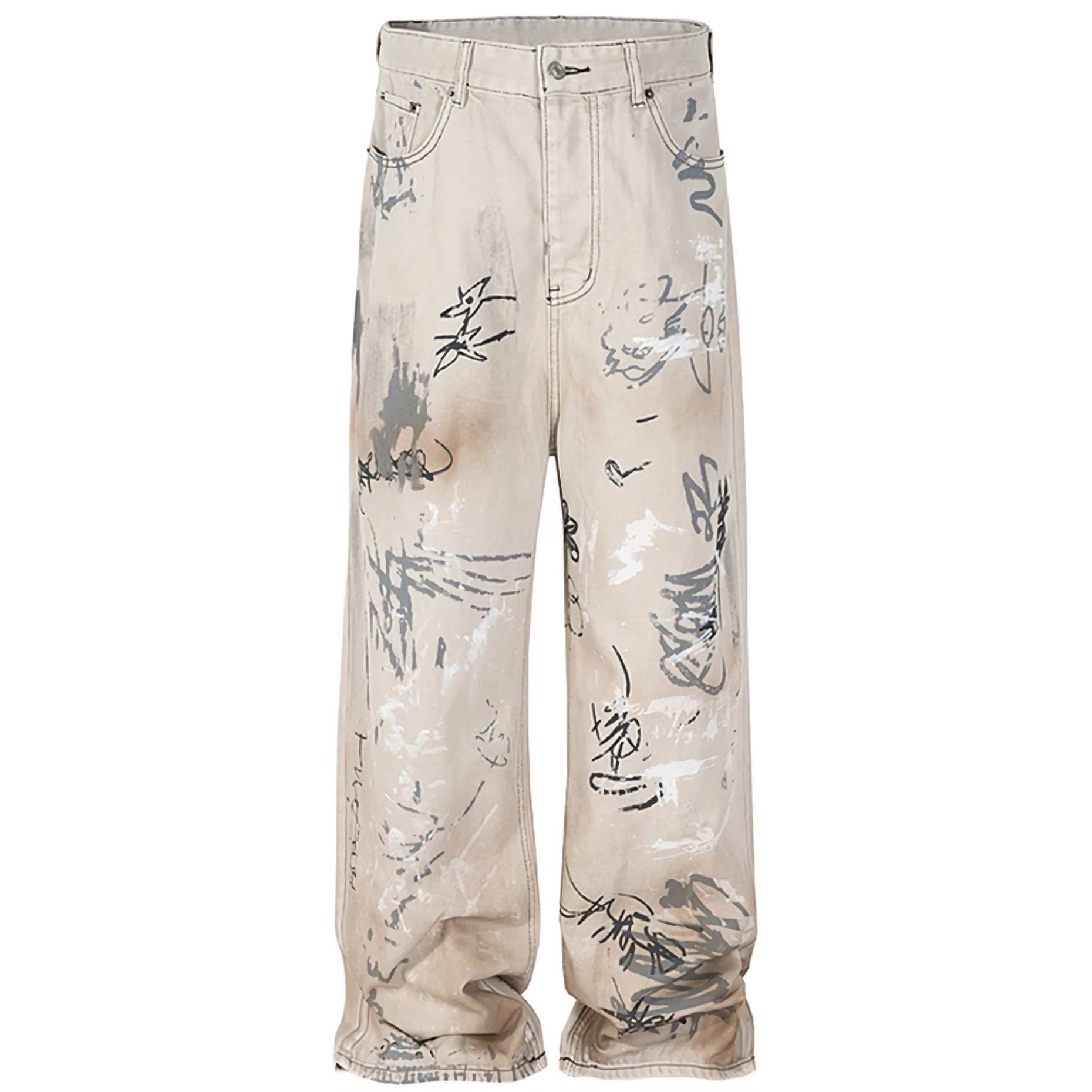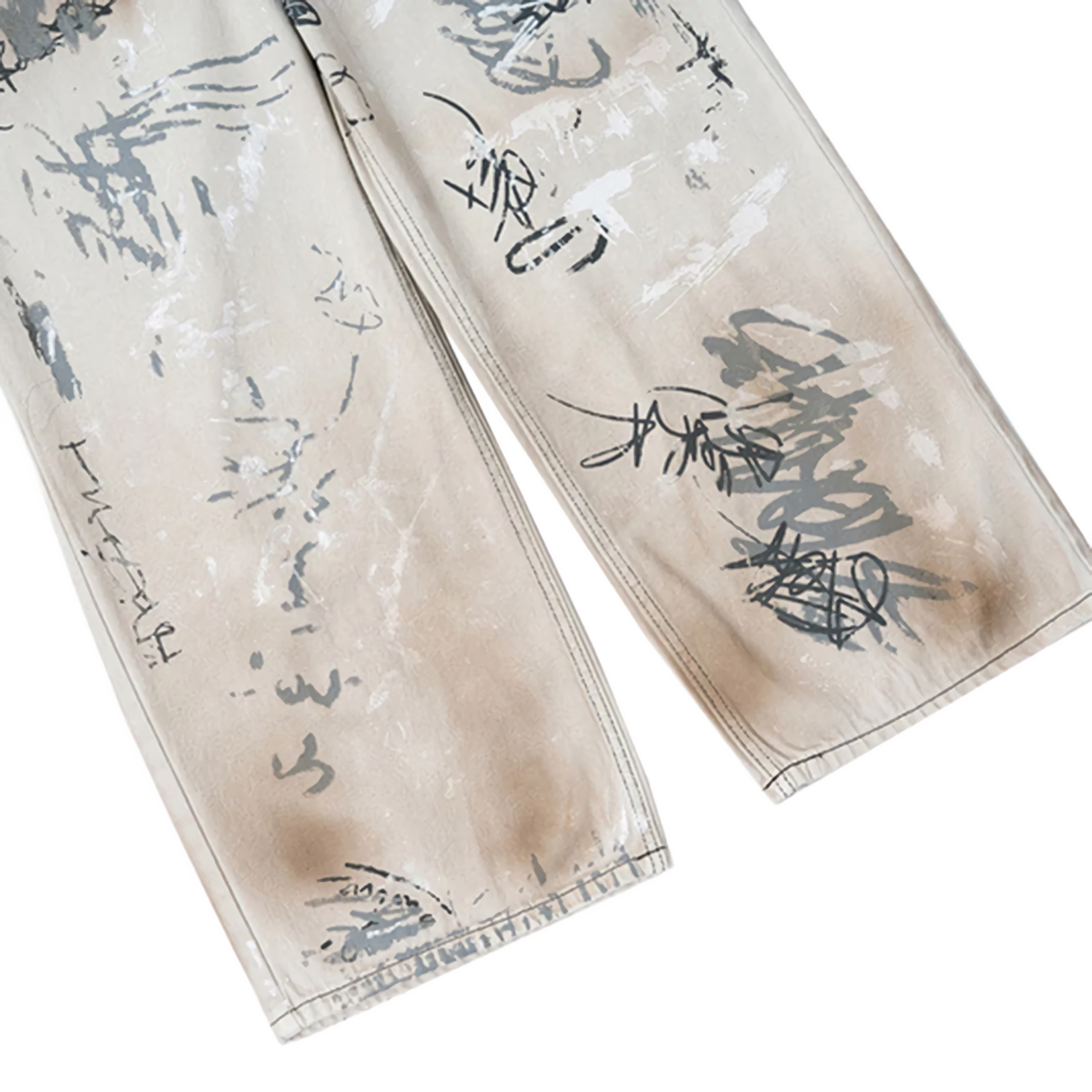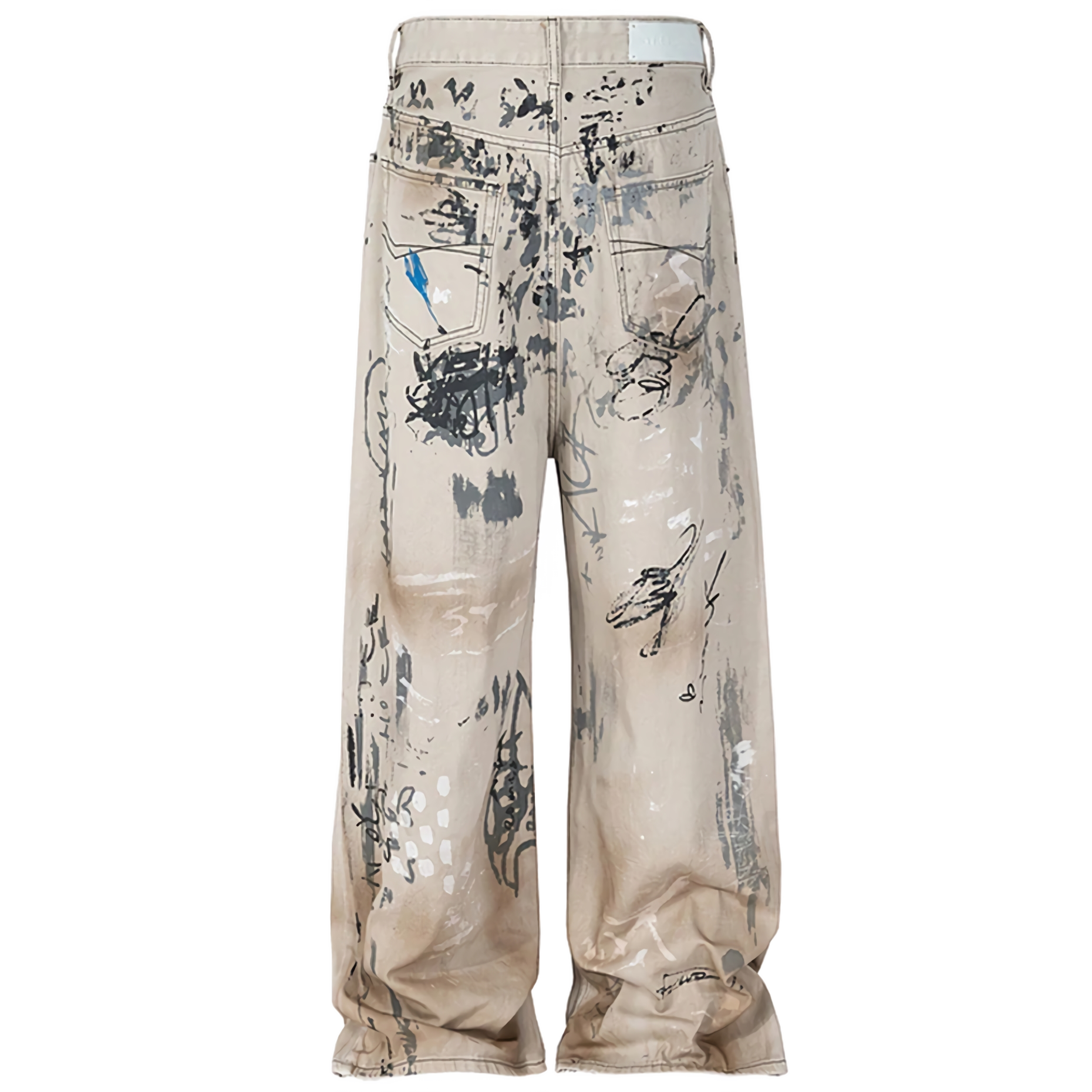 Light beige wide-leg jeans featuring artistic scribbles and designs. Showcase a unique blend of abstract patterns. sketches. and text-like elements in various shades of gray and black. This expressive piece combines street art aesthetics with casual wear. perfect for those seeking a bold. unconventional style statement.