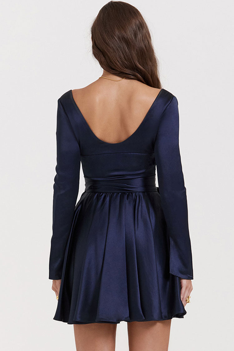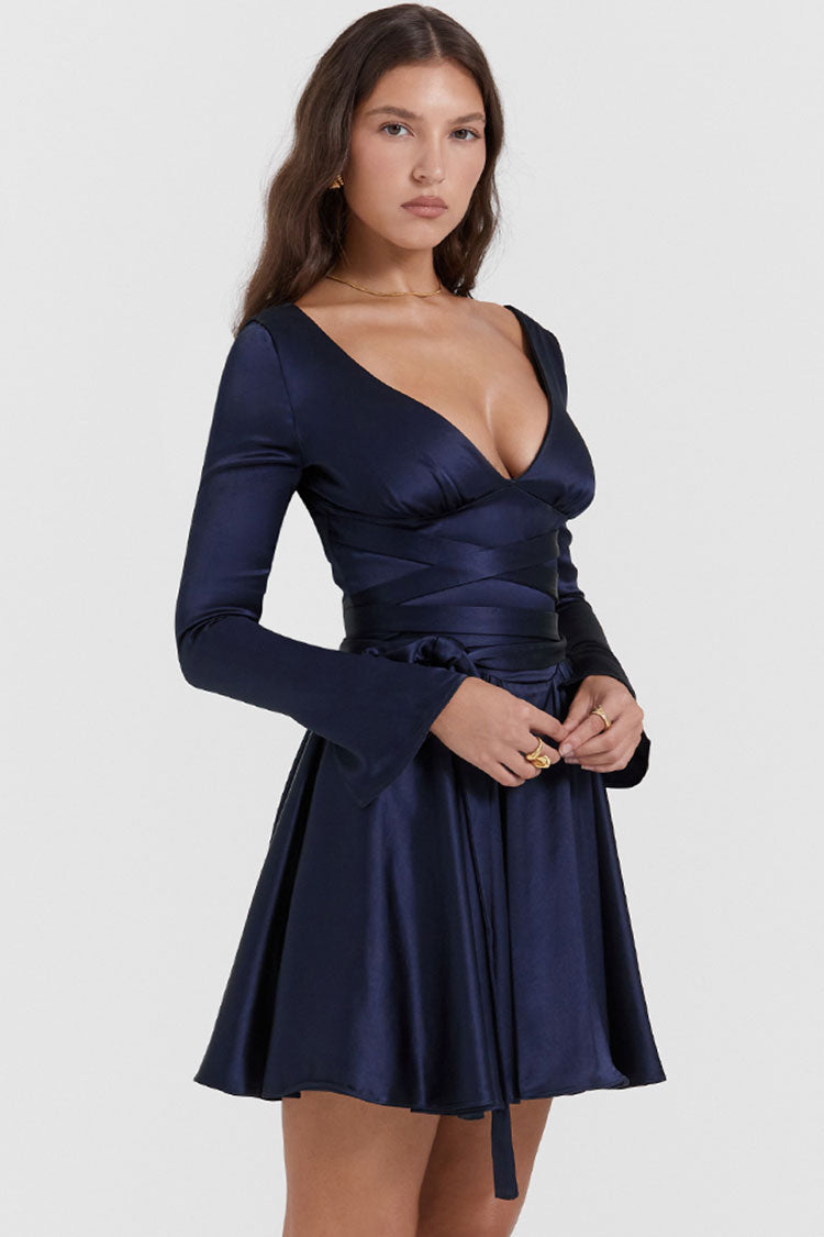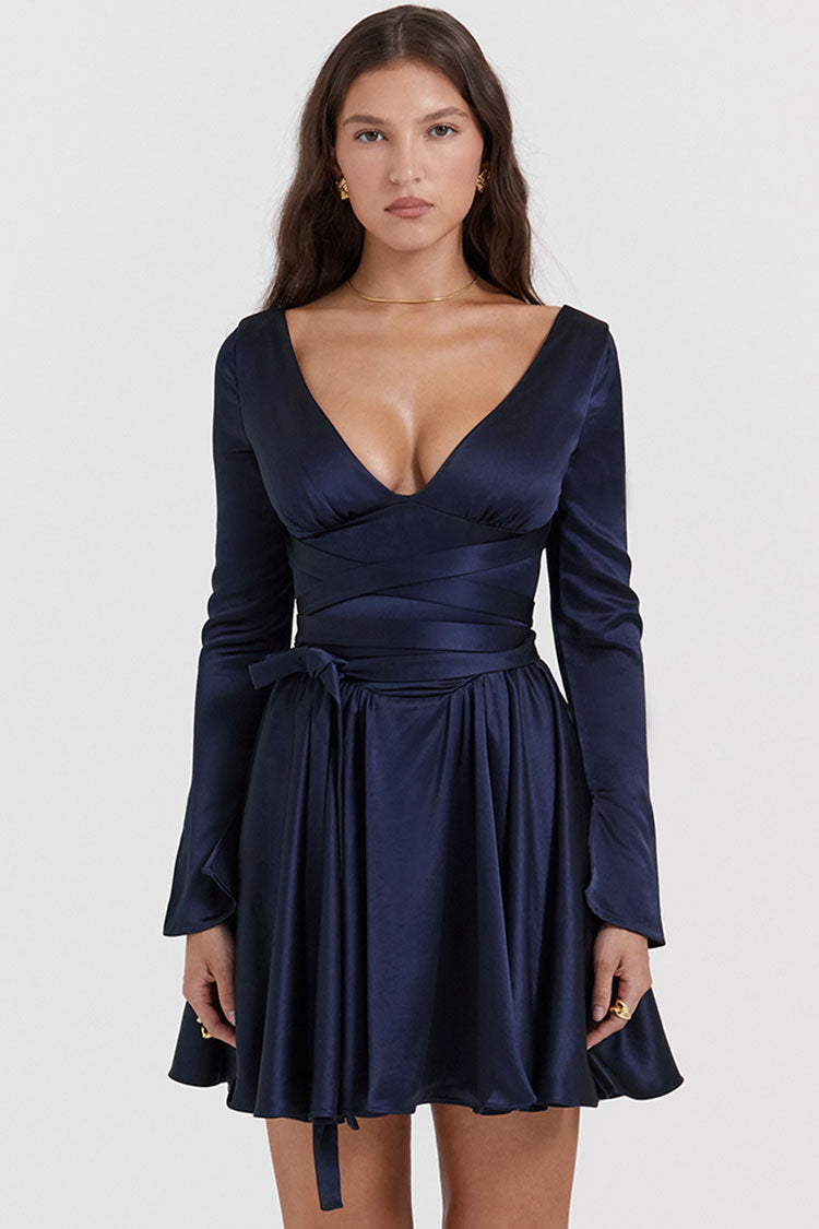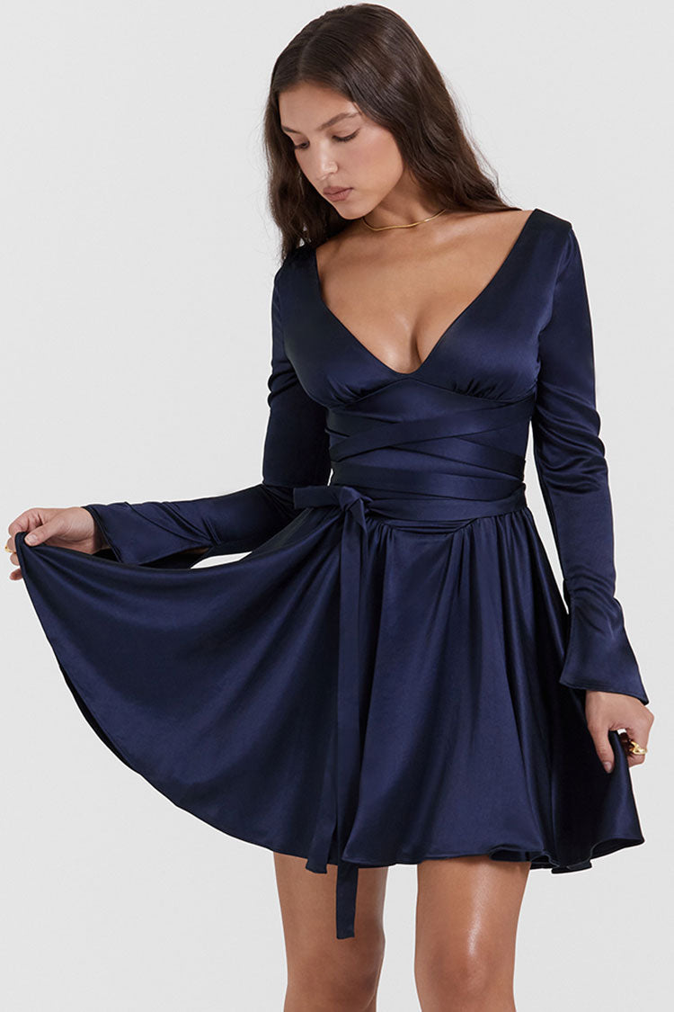 Sexy Deep V Long Sleeve Wrap Tie Waist Silky Satin Party Mini Dress - Navy Blue