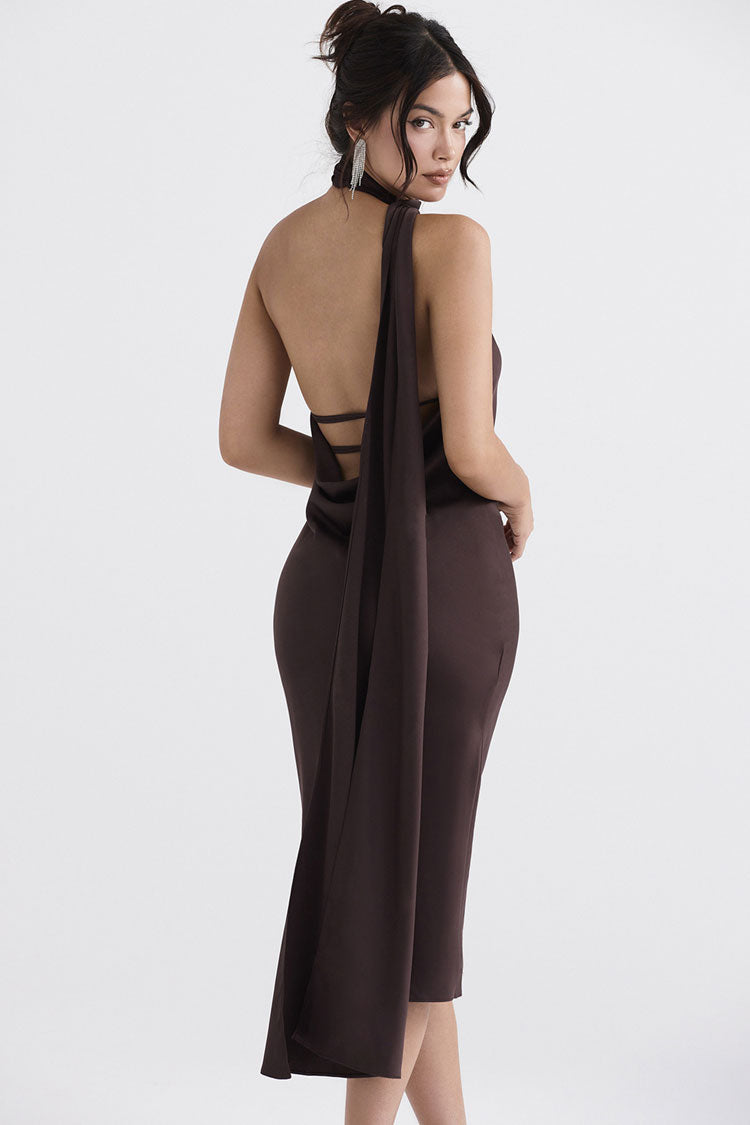 Sexy Draped Backless Wrap Halter Tie Satin Midi Dress - Chocolate