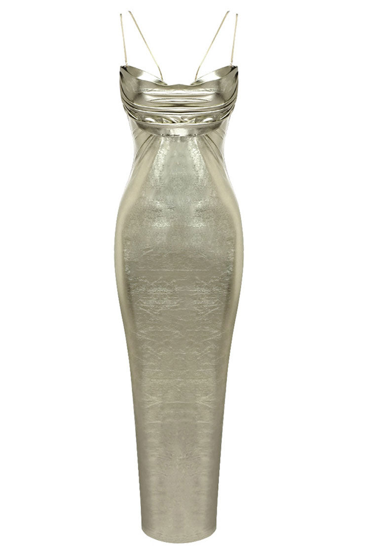 Sexy Metallic Cowl Sweetheart Neck Chain Strap Fitted Evening Maxi Dress - Gold