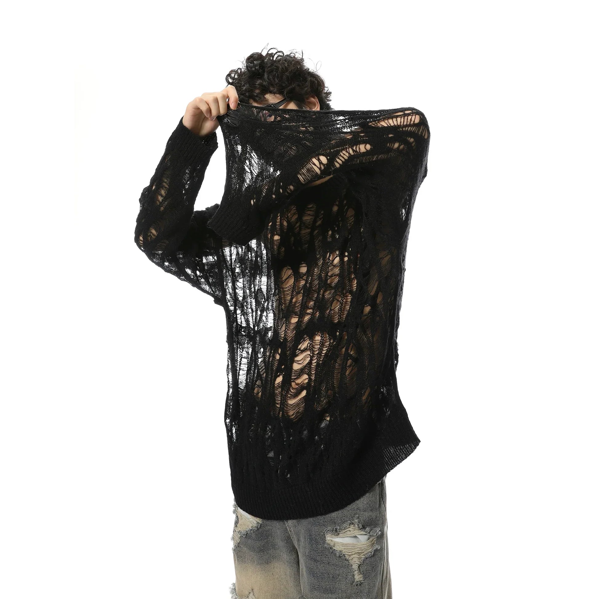 The Sheer Distressed Black Sweater provides a lightweight and grunge-inspired addition to your wardrobe. Made with sheer material and distressed details. this sweater offers a unique and versatile look. Perfect for layering or as a statement piece. it's a must-have for any fashion-forward individual.