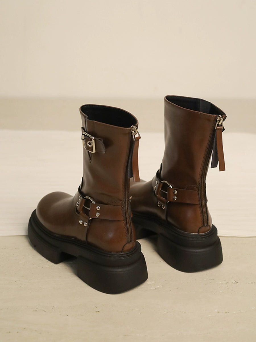 Western Buckle Straps Chunky Heeled Side Zip Boots