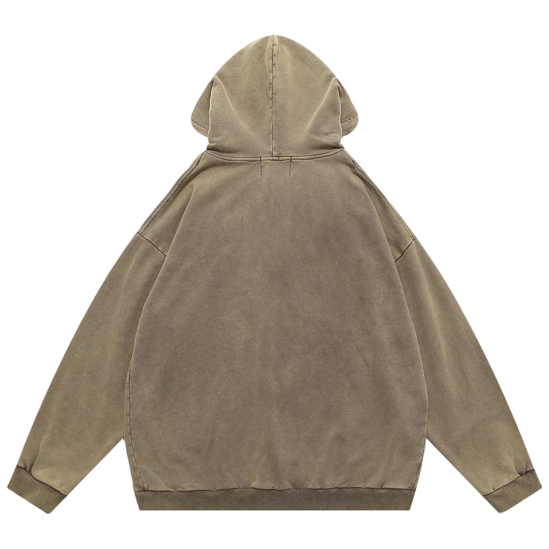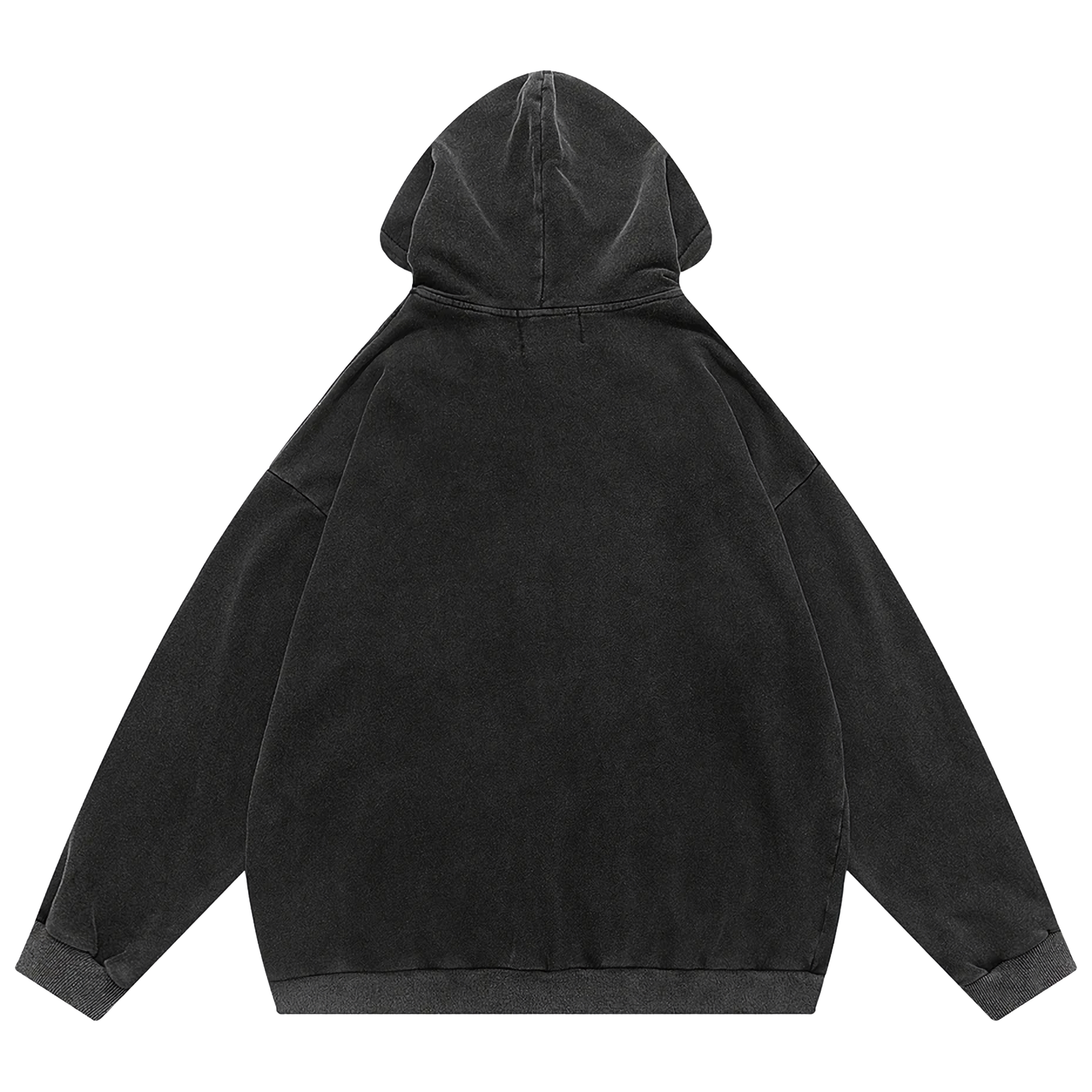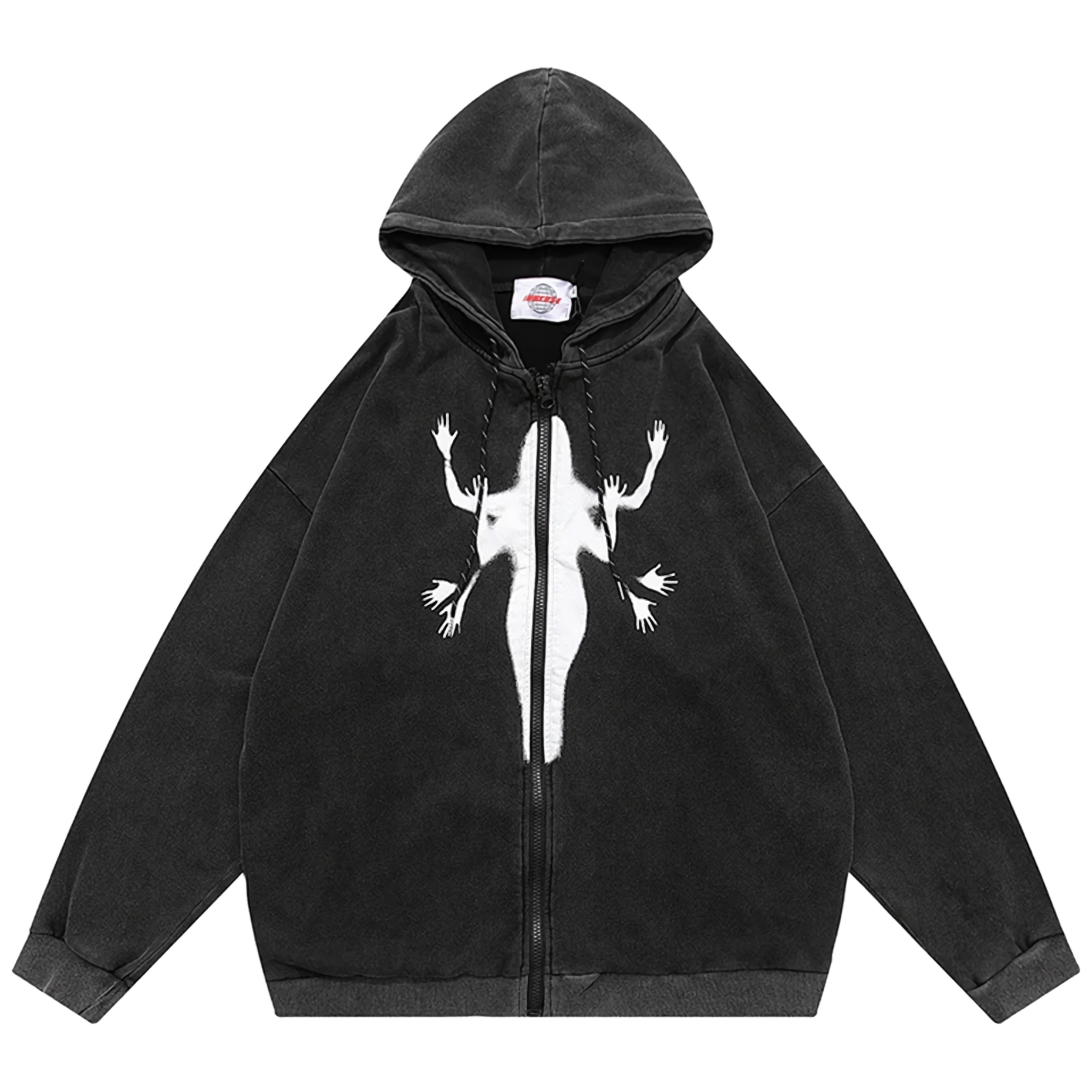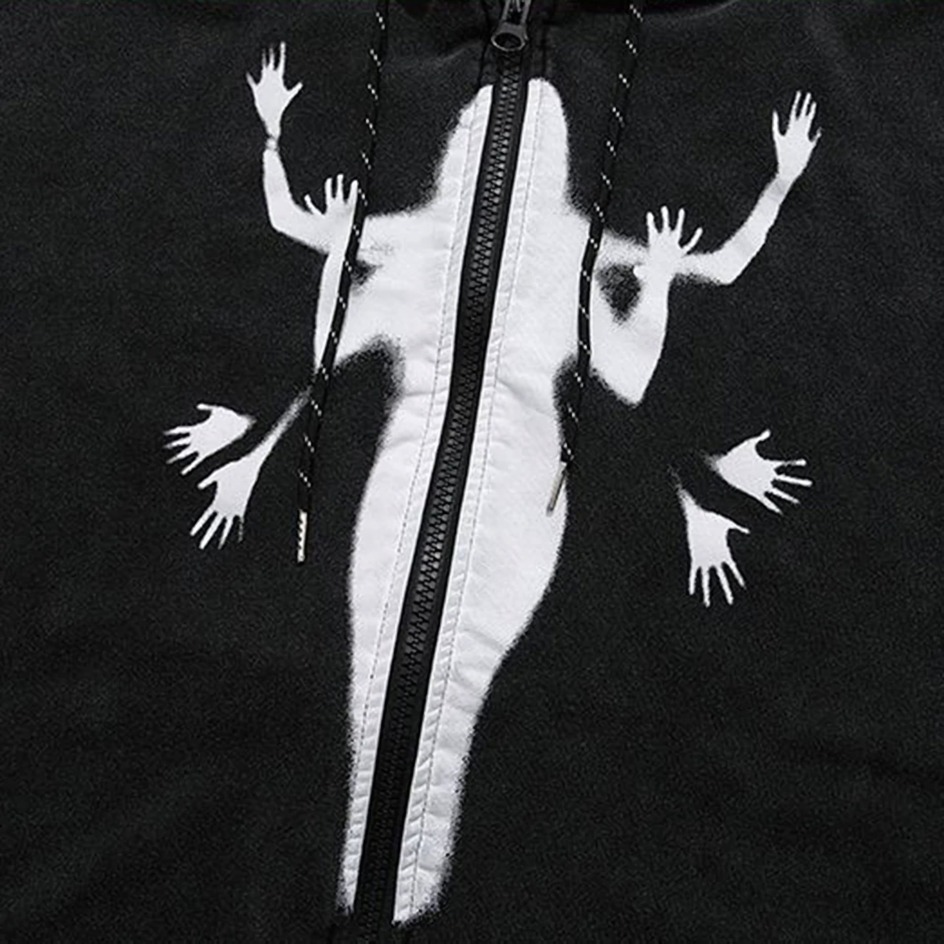 Black zip-up hoodie featuring a striking white figure design. The graphic depicts a stylized human form with multiple arms. split by the zipper. This bold. avant-garde print creates a unique visual effect. Made with a comfortable. oversized fit. this hoodie offers both warmth and edgy street style