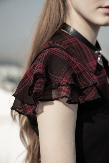 A cute black pinafore skater dress. over a sheer red plaid. collared short sleeved shirt with adorable ruffled sleeves!