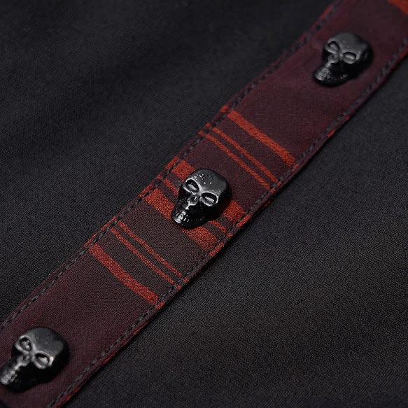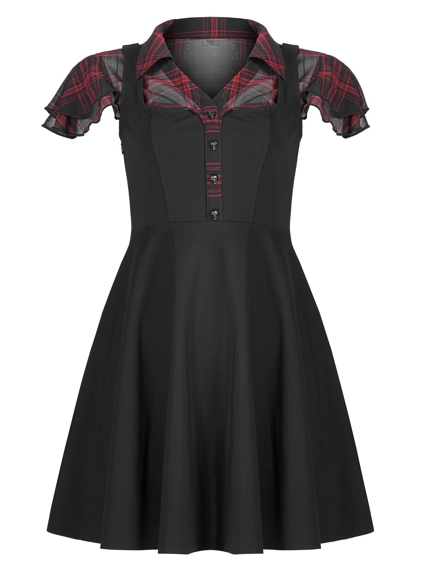 The beautiful tartan pattern runs down the front of this stylish mini dress and is fastened with black skull buttons.