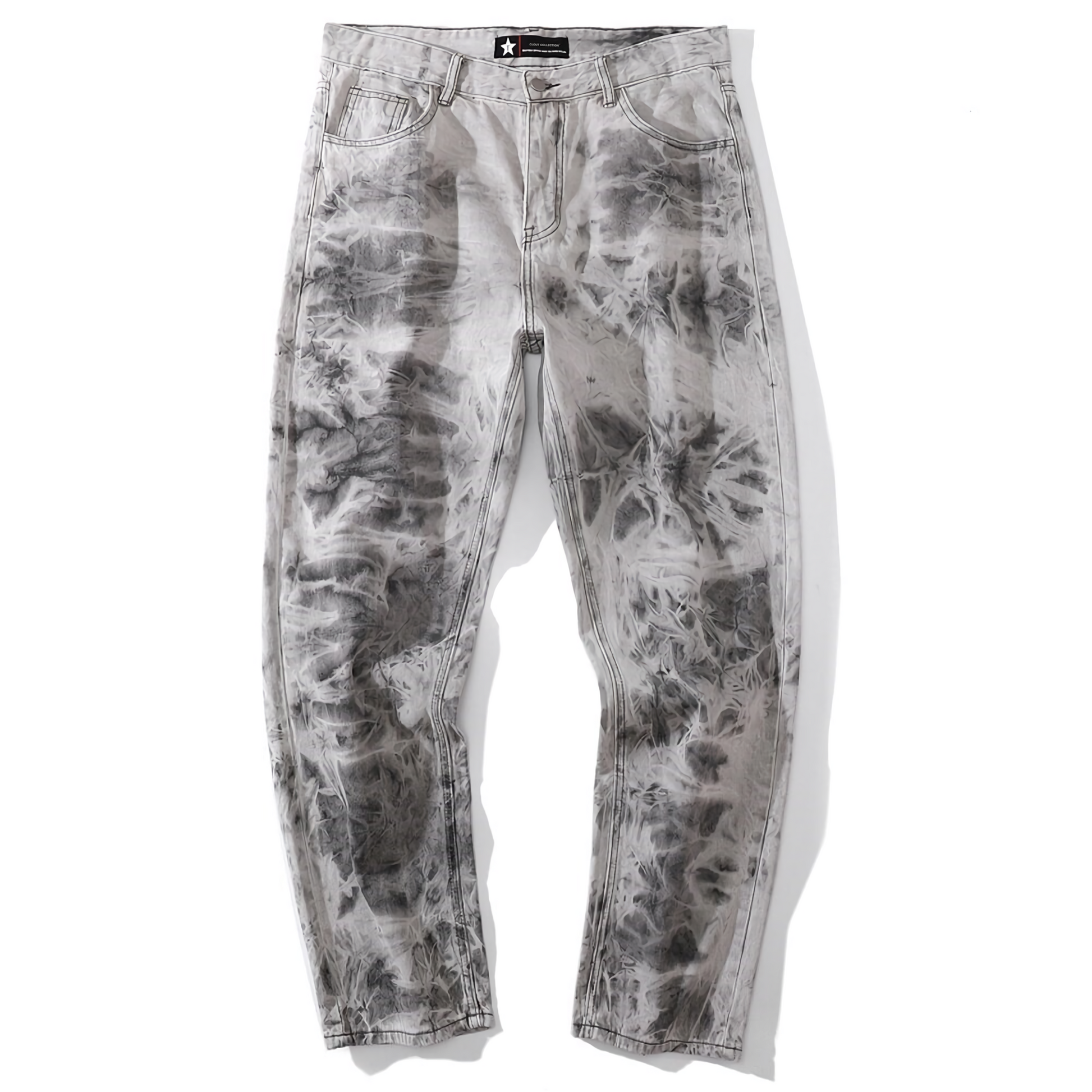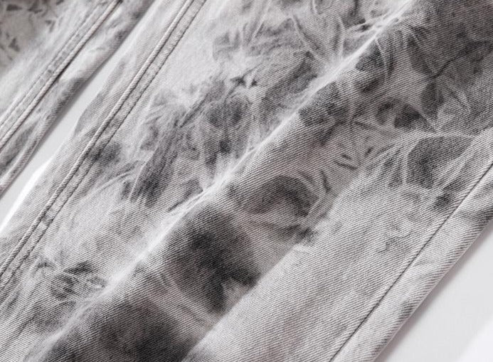 Light gray jeans with unique smoke-like tie-dye effect. Features abstract patterns reminiscent of swirling smoke or mist. Combines classic denim silhouette with avant-garde dyeing technique. Perfect for those seeking an edgy. artistic twist on casual wear.