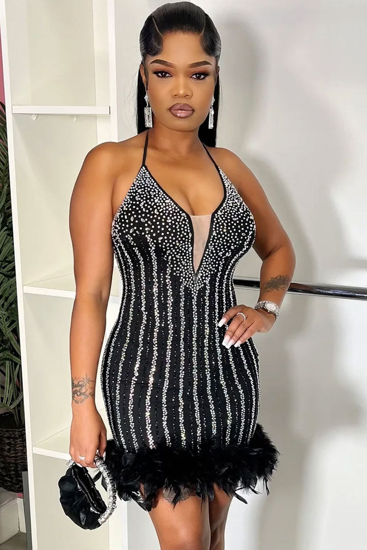 Sparkly Rhinestone Halter Neck Bodycon Feather Trim Party Mini Dress - Black