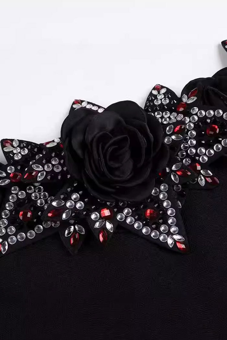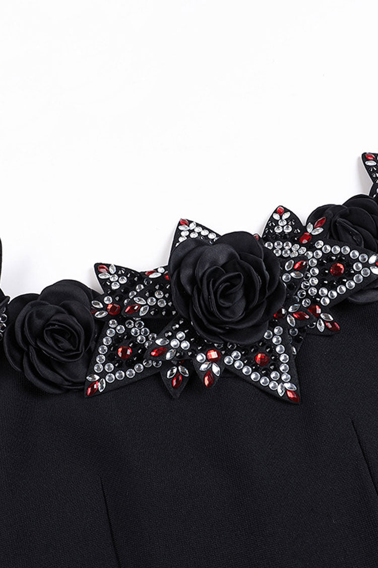 Radiating effortlessly elegant. this sexy rosette dress from our boutique captures attention with ease. Embellished with 3D flowers and crystal leaves at the neckline. this chic bodycon dress creates a luxurious and vivid look for women. The off-the-shoulder design and long sleeves create an alluring silhouette. while a hidden back zipper and subtle back slit offer practical convenience. Ideal for cocktail parties and evening events. sheath bandage dresses are timeless outfits to make a striking entrance.