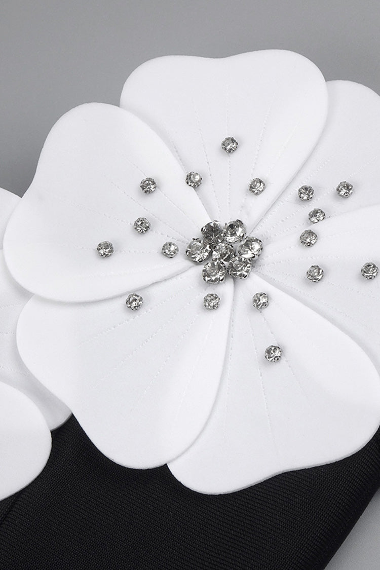 Bring a new perspective with our quiet luxury bandage dresses! Adorned with three dazzling white rhinestone-studded flower corsages. this opulent tube dress in our boutique is a real head-turner for minimalist women. The plunging neckline and darted seams give you that figure-hugging. cinched-in look. With a sassy back slit for easy movement and a hidden zipper. it's all about effortless elegance. This glamorous floor-length black gown. paired with gathered mesh gloves. is your go-to outfit for making a grand entrance at any event. And hey. why blend in when you can stand out? Own the night in style!