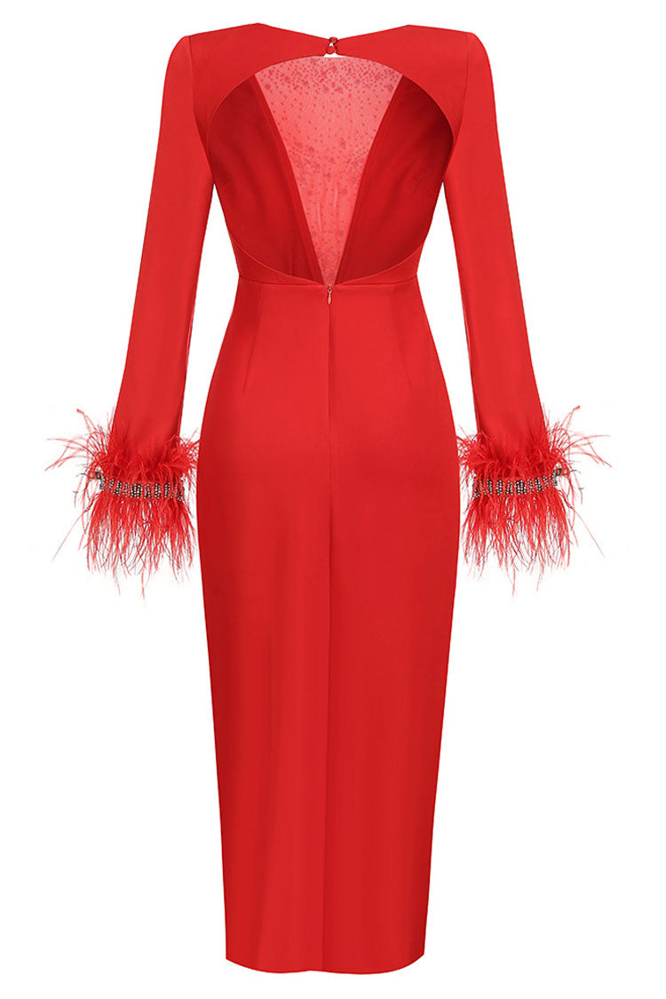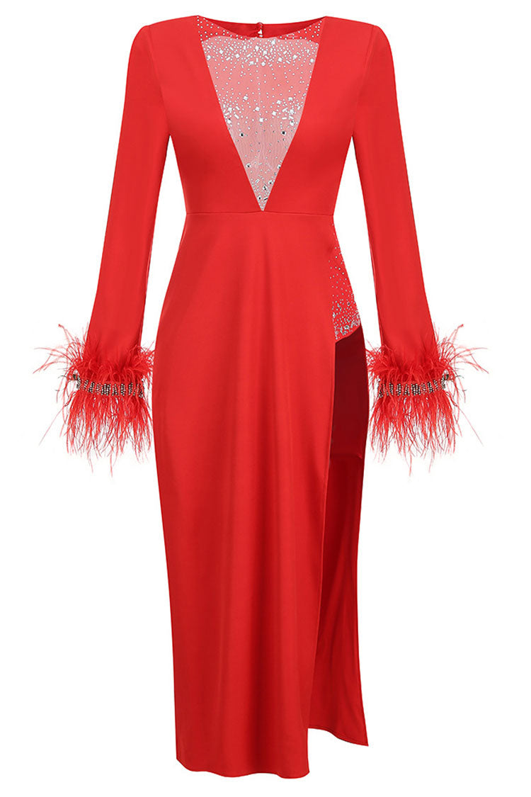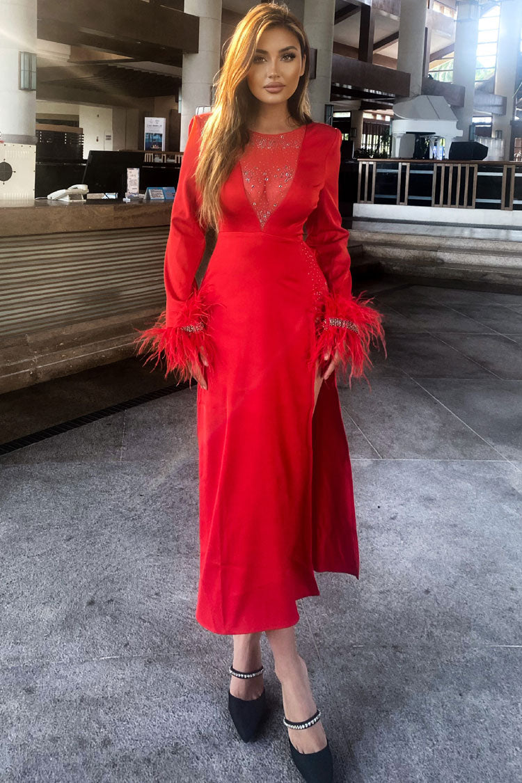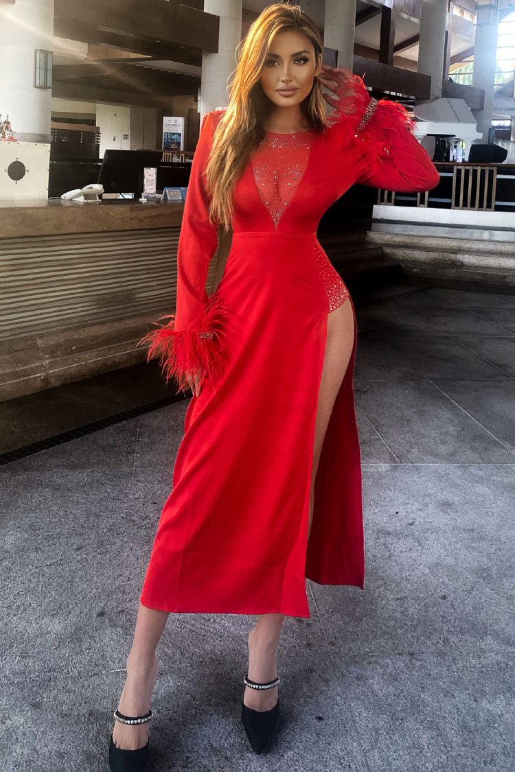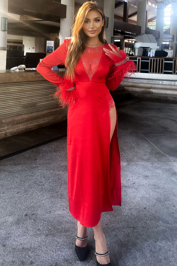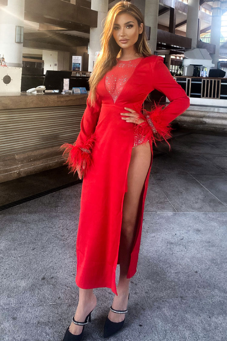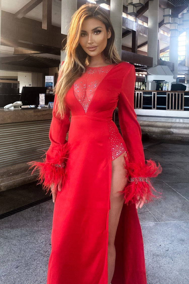 Sparkly Rhinestone Sheer Mesh Feather Trim Long Sleeve Split Evening Maxi Dress - Red