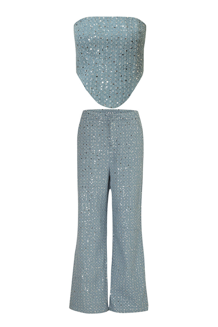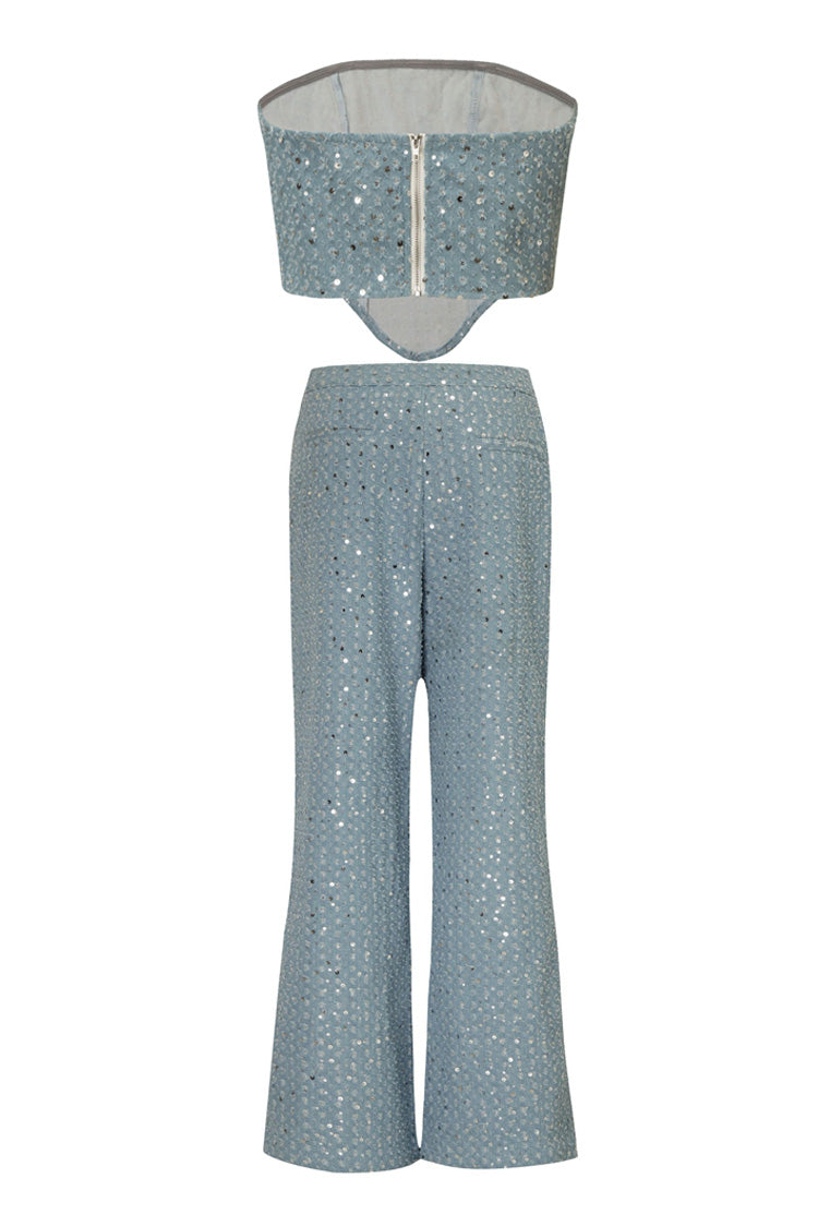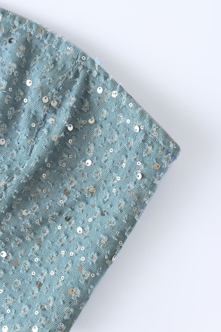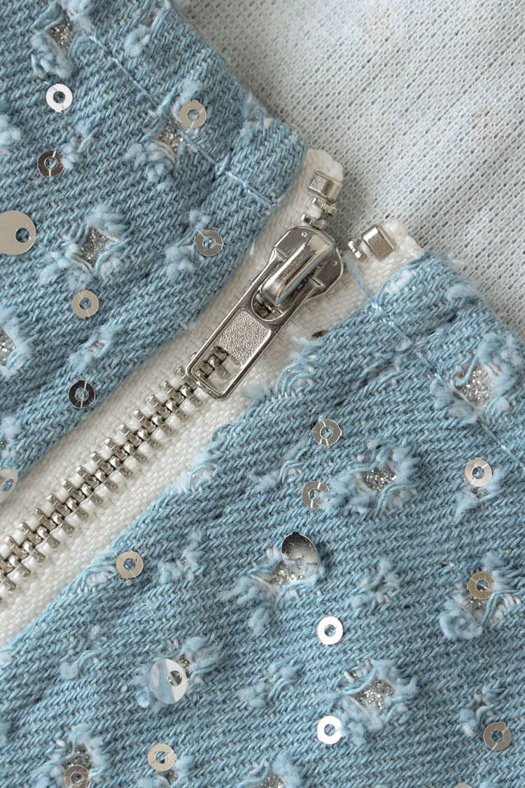Two-piece denim jumpsuits from our boutique have hit the racks. becoming the hottest fashion trend this season for women. This distressed denim duo is simultaneously strong and soft. evoking both retro and futuristic vibes. and blending canonical with contemporary styles. Sparkling with dazzling sequins. it features a strapless denim tube top that exudes chicness with its curved crop length. creating a captivating cut-out side effect. The matching wide-leg jeans boast an elasticated high-rise design and wide openings. ensuring a flattering and versatile look. This light blue denim-to-denim outfit is so cool and fresh!
