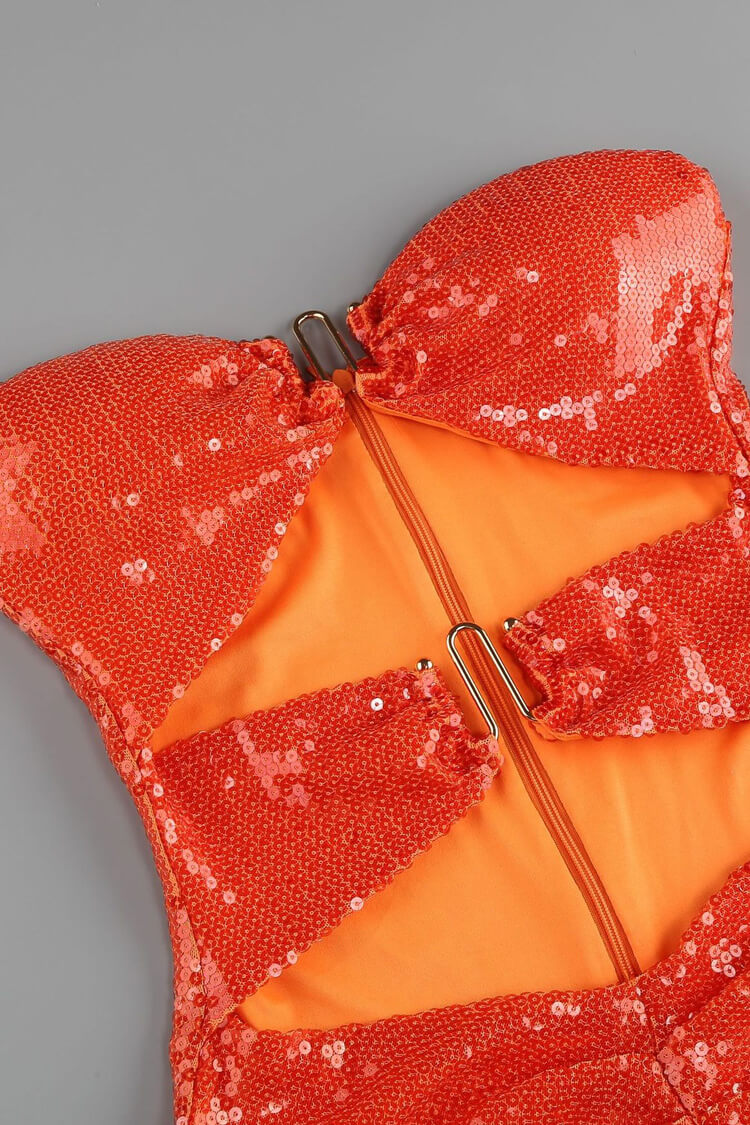 Shine bright at your next party with stunning sequin dresses like this burnt orange dress. Designed in our boutique shop. this midi tube dress is fully lined and embellished with sequins for a high pinch of shine. special for women like you! The sweetheart neckline frames the collarbones. while the metal hardware and gathering detailing adorned to the front for added future aesthetic. Fastened with a concealed back zipper closure. the ruched bodycon dress features peek-a-boo cut-outs for an extra allure. Cutting in a bodycon silhouette completed with a back slit. this sexy cut out dress would be your best cocktail party dress outfits this summer.Â